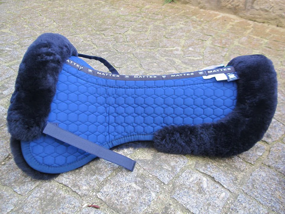 Amortisseur MATTES avec peau d’agneau extérieur. Coton piqué serré bleu roy, bordure avant et arrière en peau d’agneau véritable marine