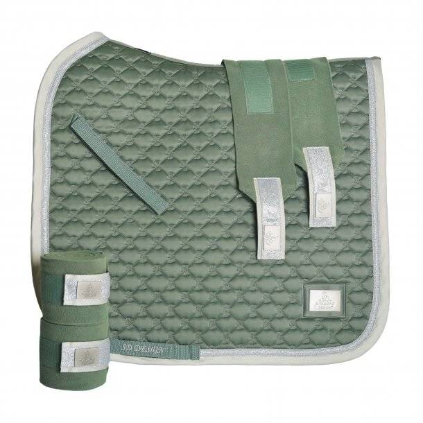 Les plus beaux bandages en polaire verte qui sont soigneusement conçus dans les moindres détails, pour s’accorder parfaitement avec le tapis de selle. Sur la fermeture velcro, vous trouverez les plus beaux paillettes argentées, qui correspondent à la fixation intérieure du tapis de selle. La touche finale sur les bandages est la reliure beige, qui donne un look parfaitement équilibré ❤
