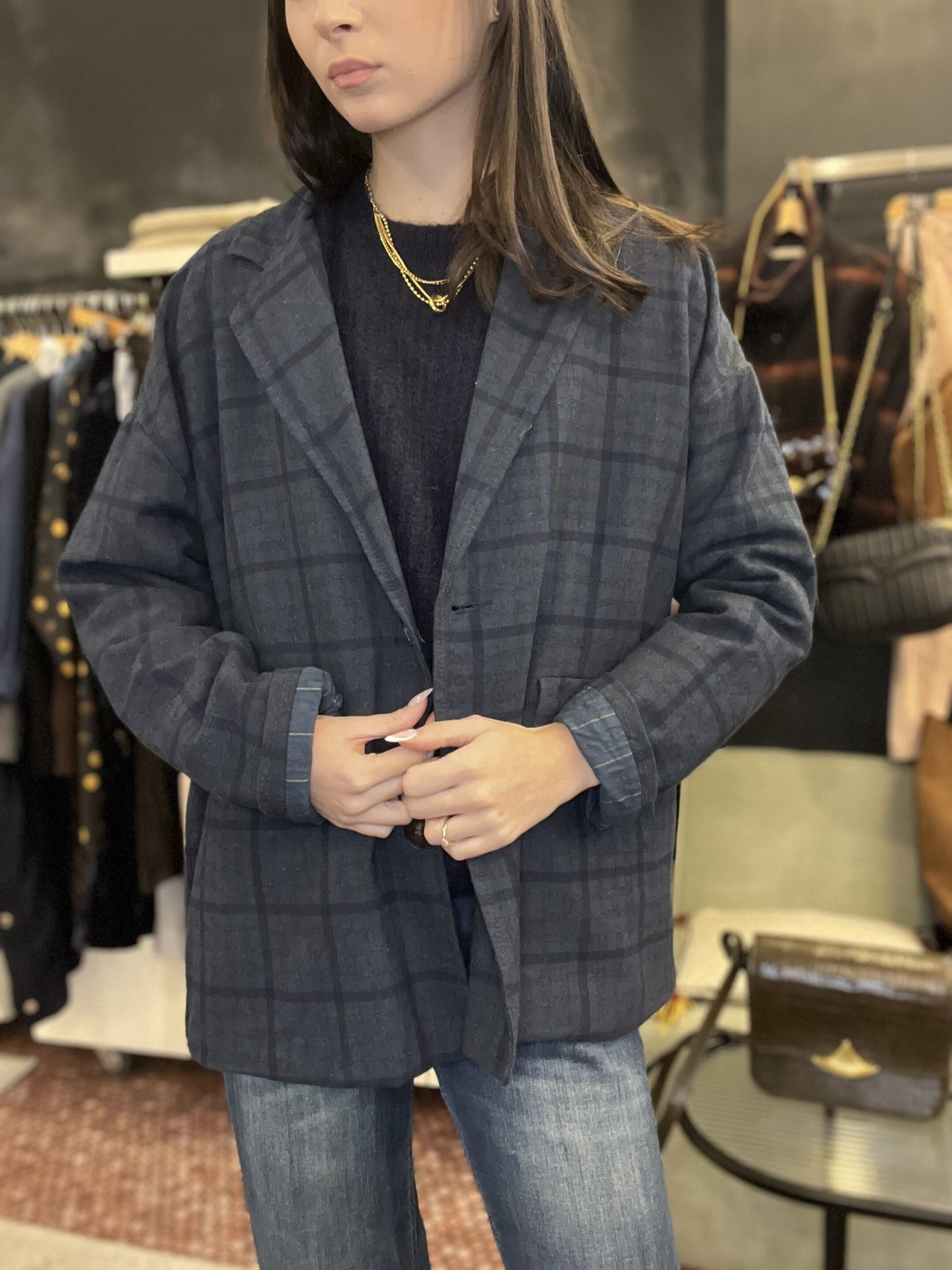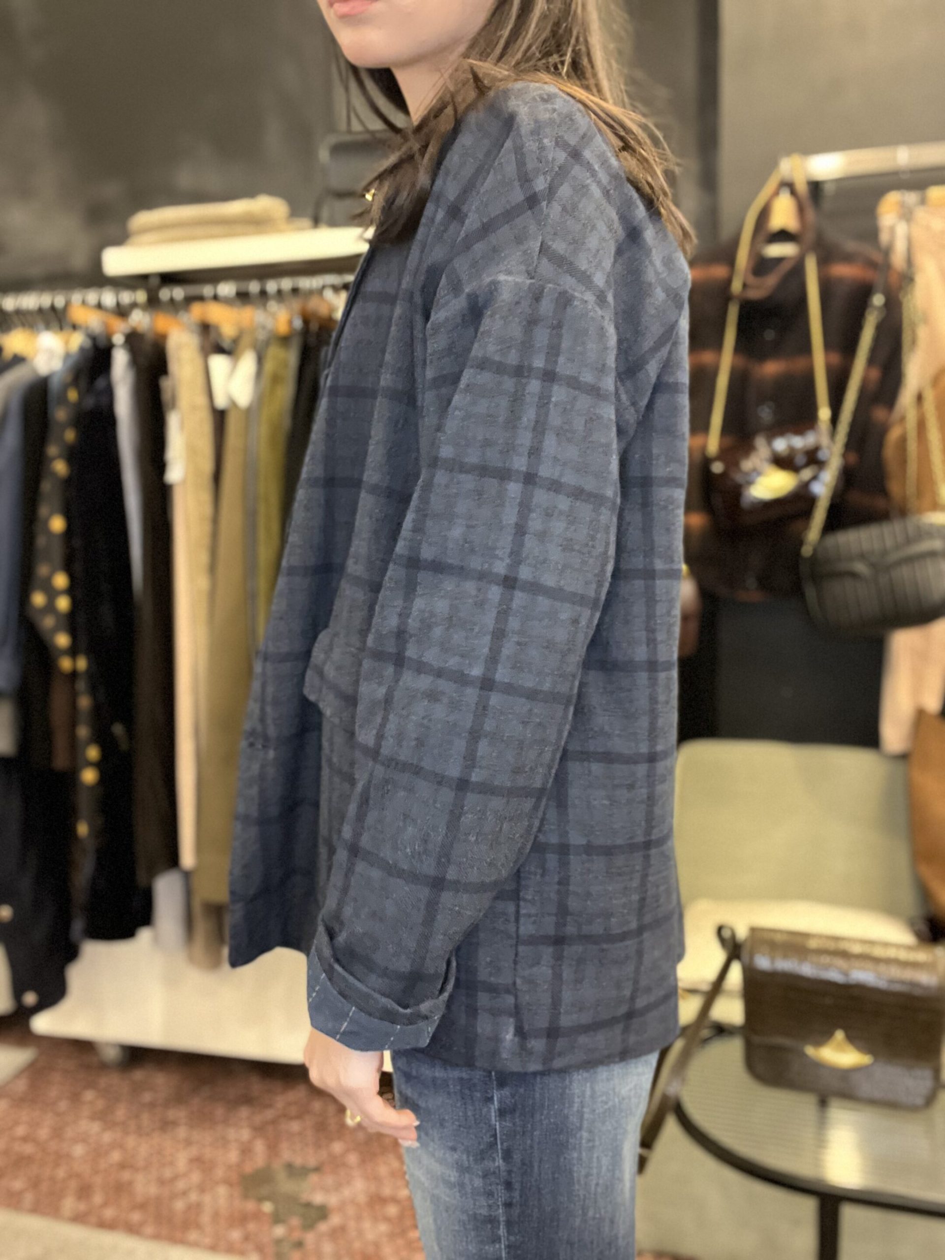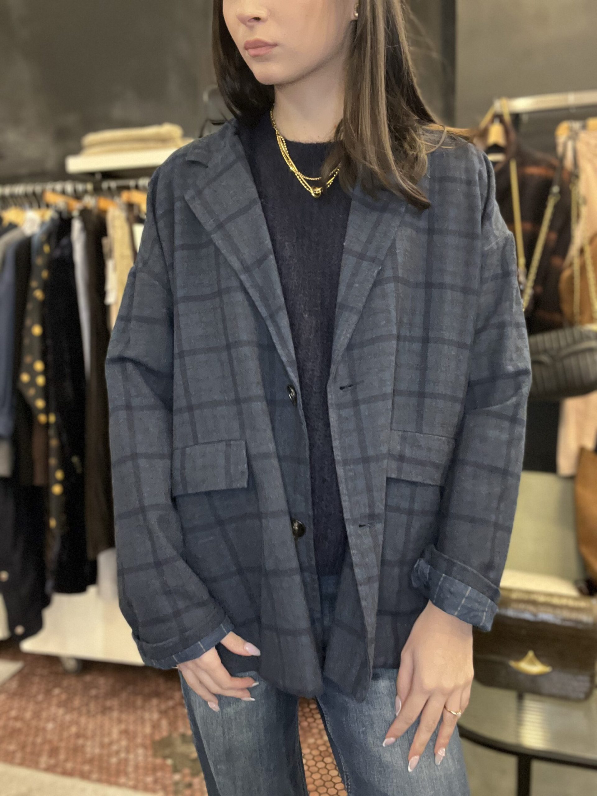 Blazer carla grand carreaux bleu johanna Blazer carla oversize taille unique du 34 au 42 Blazer carla johanna avec un jean ou une pupe ou un pantalon tailleur Compo 80% de coton 10%de polyester Made in italie