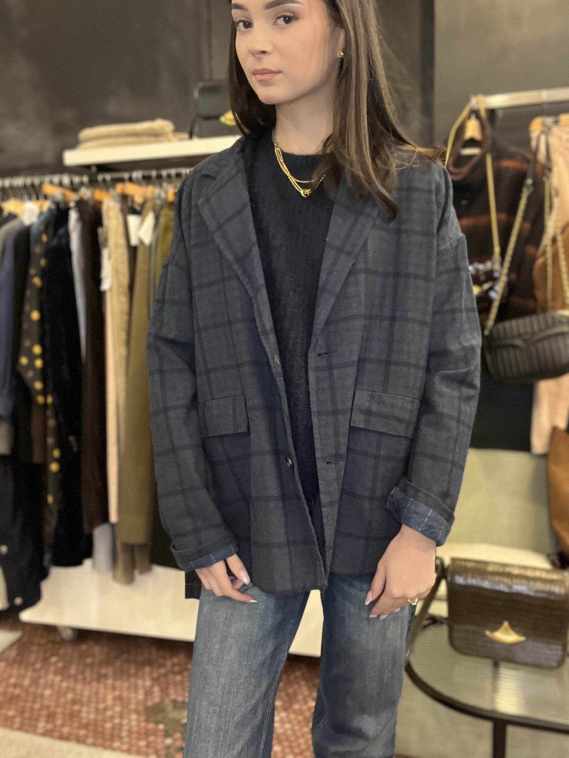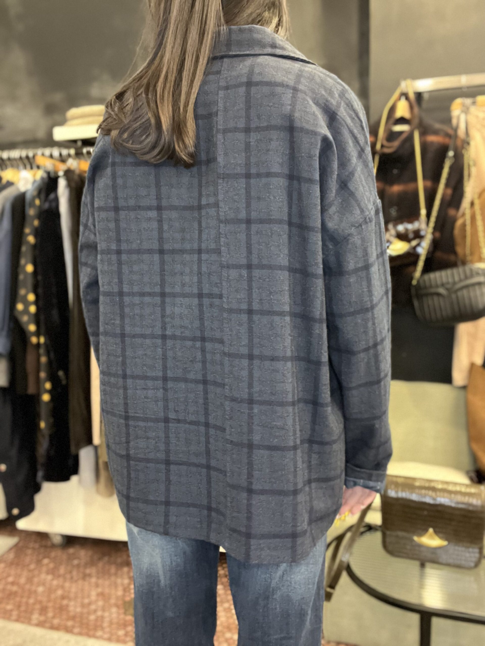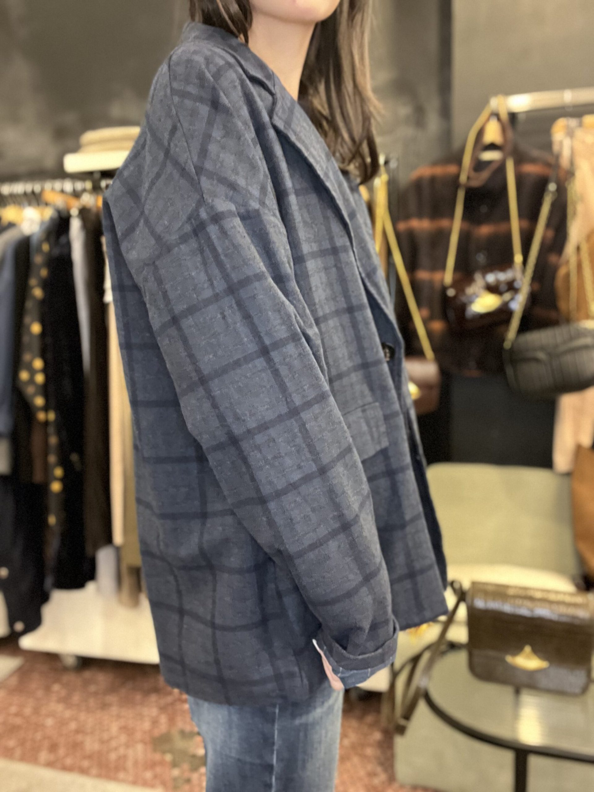 Blazer carla grand carreaux bleu johanna Blazer carla oversize taille unique du 34 au 42 Blazer carla johanna avec un jean ou une pupe ou un pantalon tailleur Compo 80% de coton 10%de polyester Made in italie