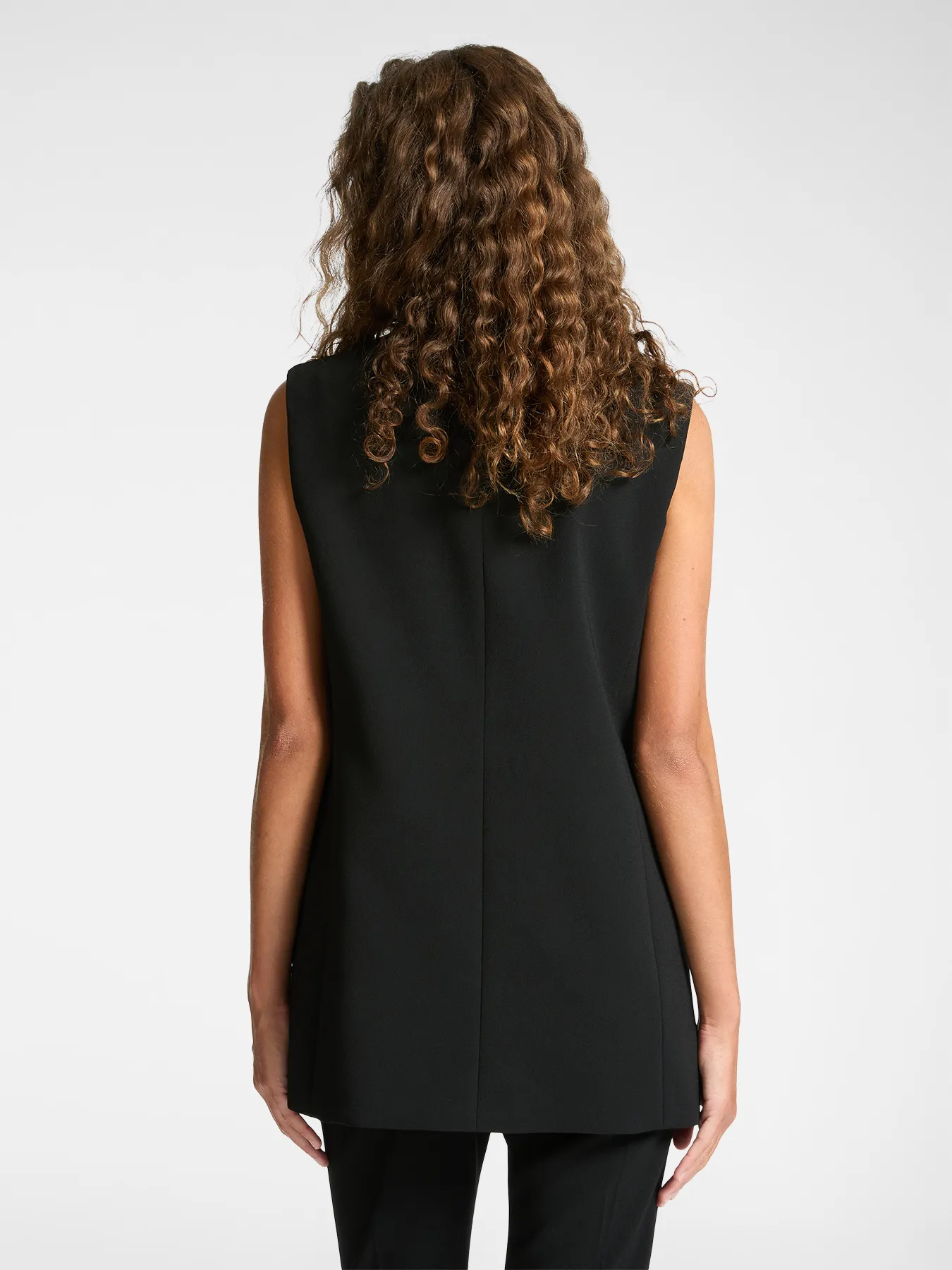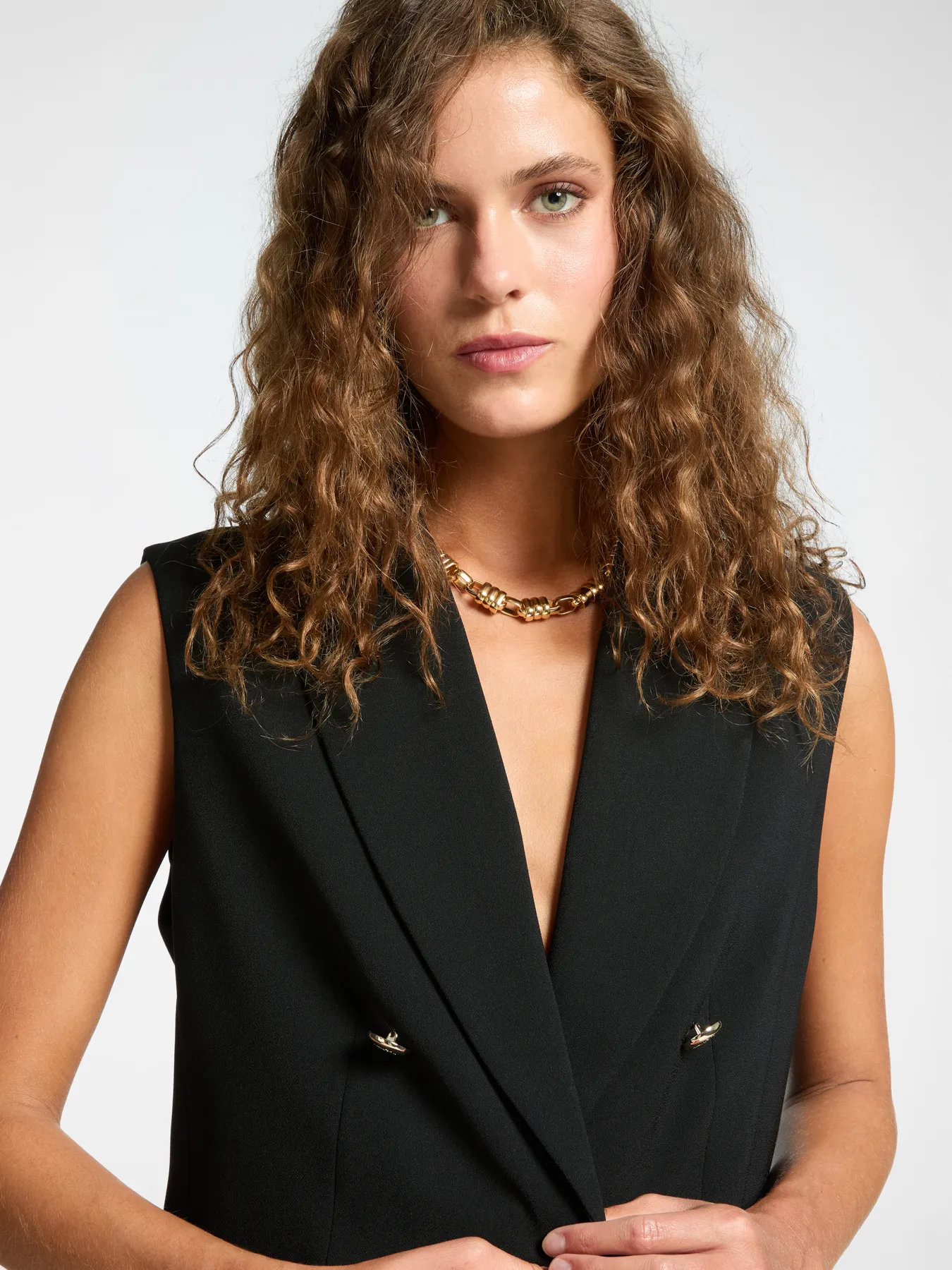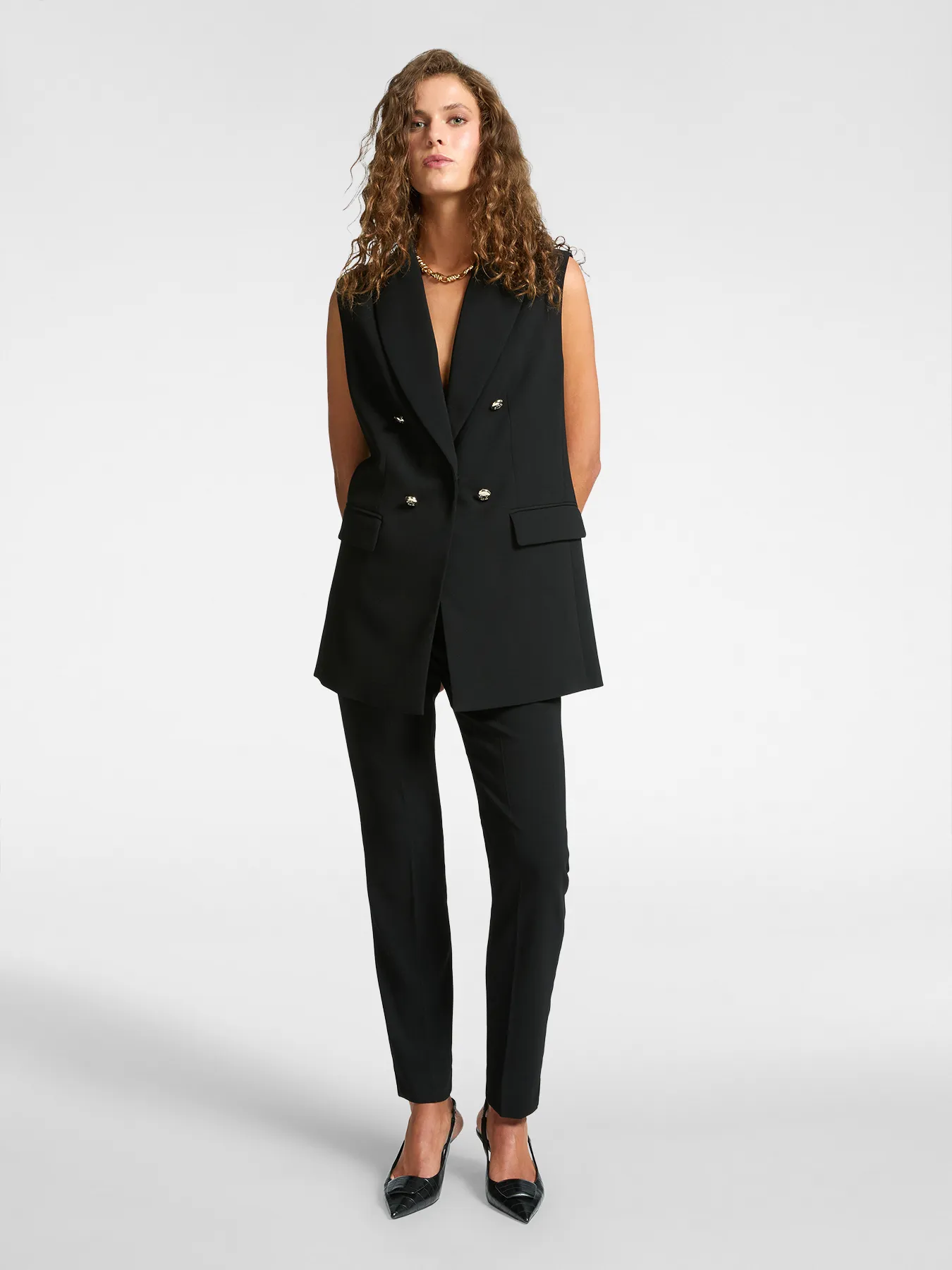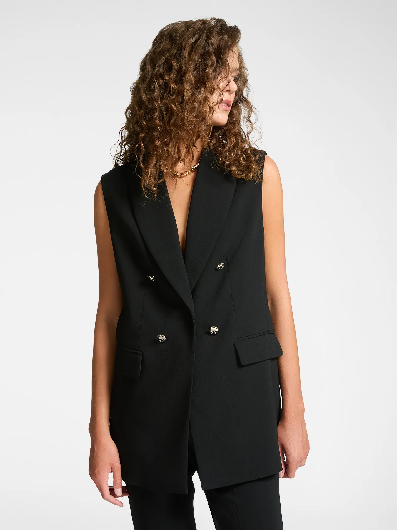 Blazer Mi-long Crêpe Sans Manches Pression Deux Poches Boutons Dorés Uni