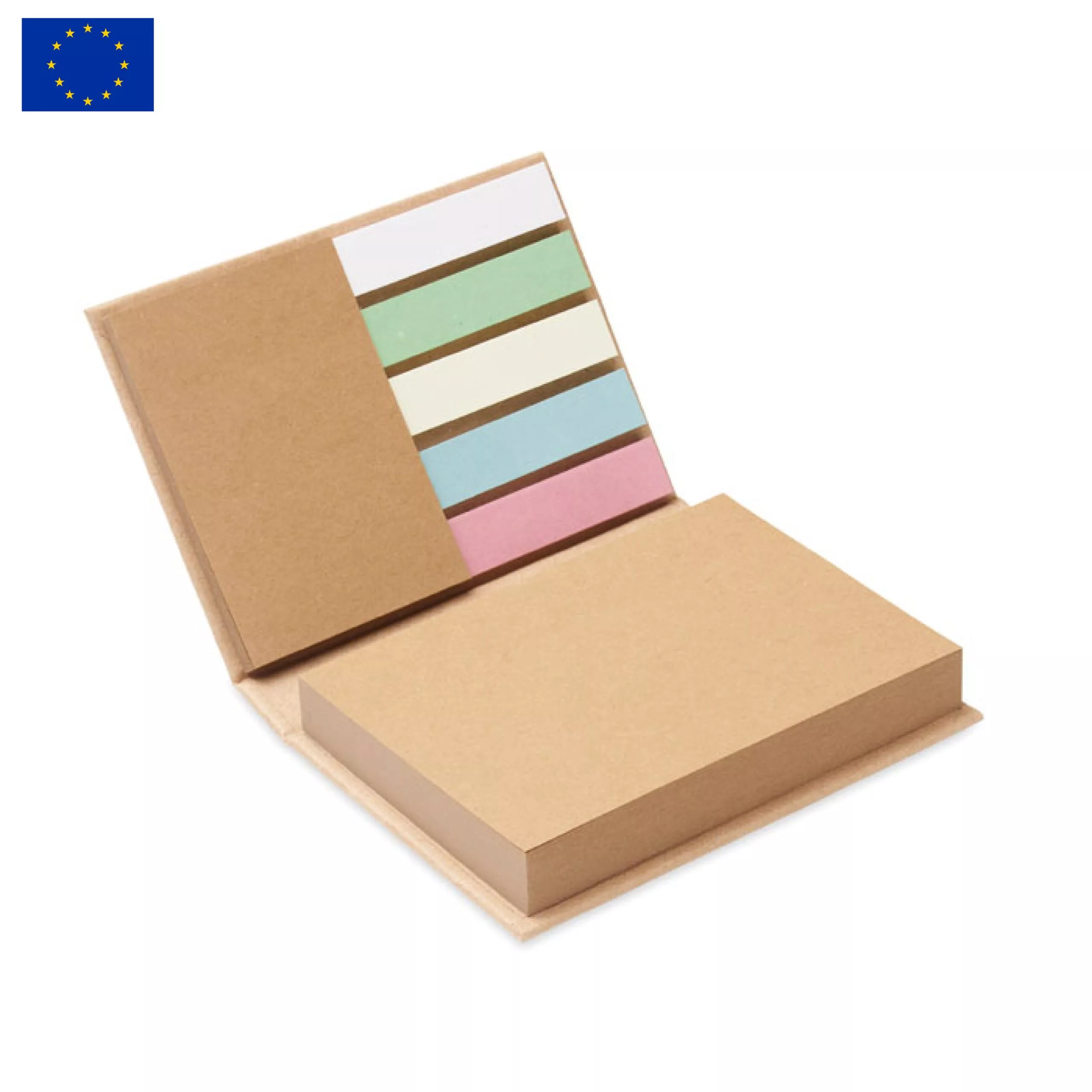 Ce bloc notes adhésif comporte 3 pièces en papier recyclé. Un grand bloc de notes adhésives, un petit bloc de notes adhésives et 5 marqueurs de pages assorties. Fabrication européenne. Réf.: 056A04172
