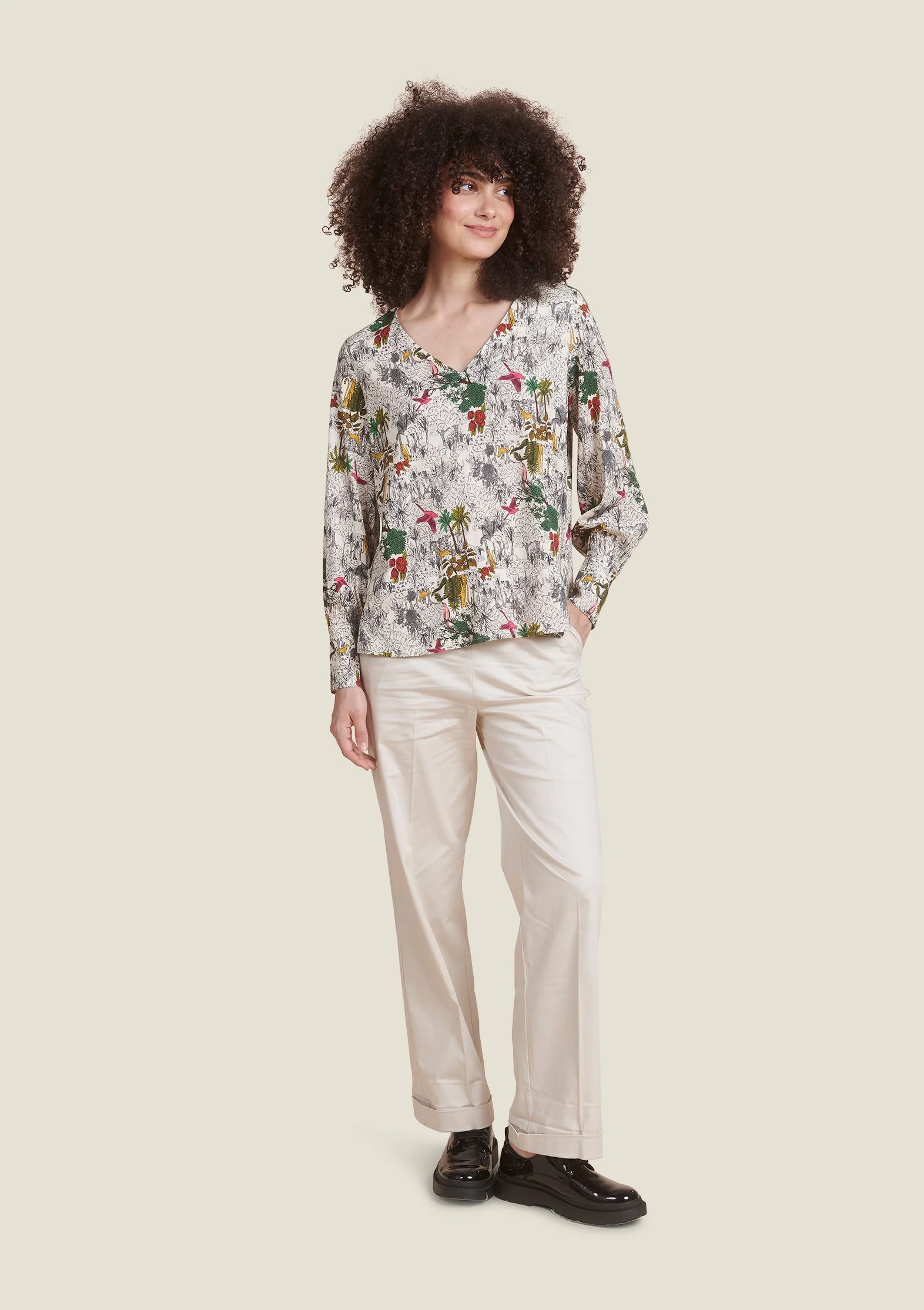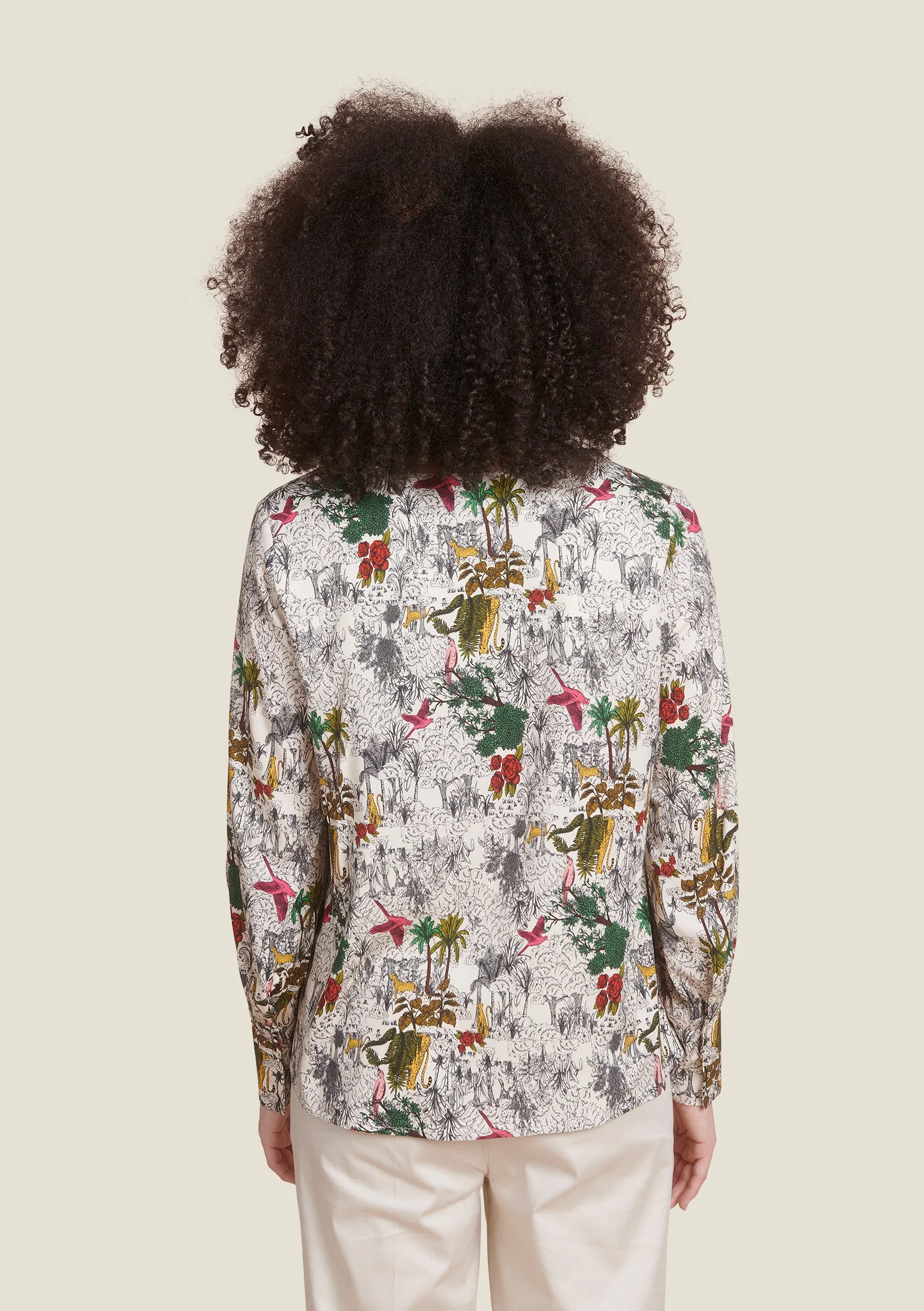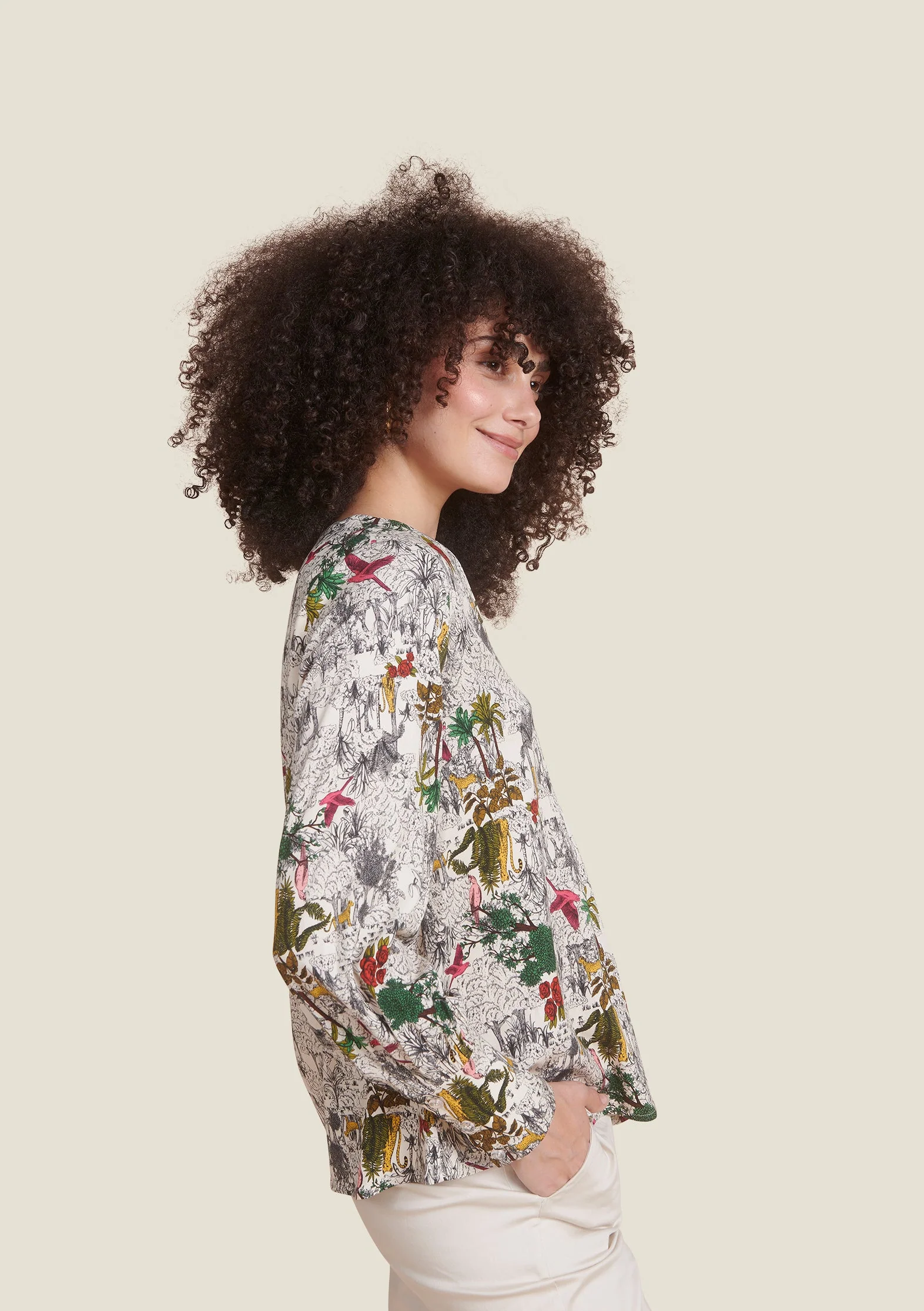 Un imprimé façon gravure inspiré des papiers peints anciens, revisité avec une touche jungle signée Sophie. Fluide, féminine et élégante, cette blouse sublime les mouvements avec charme.