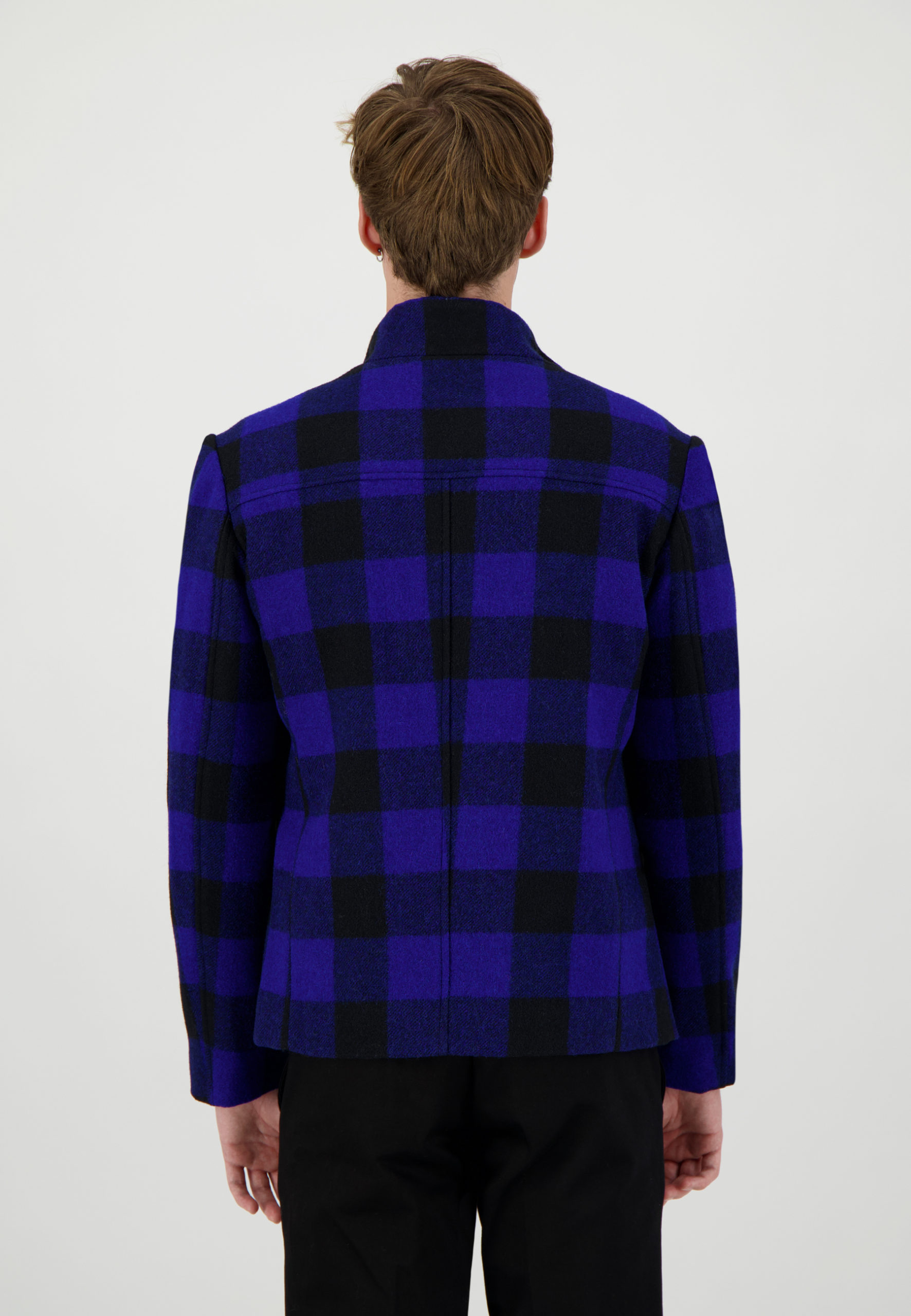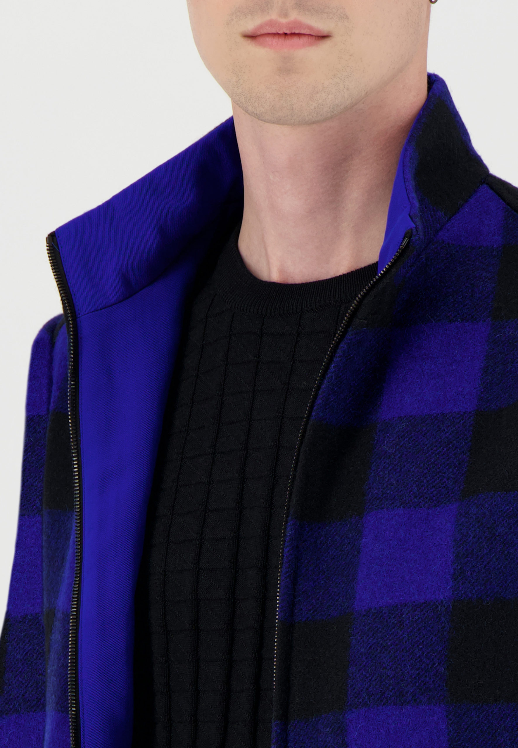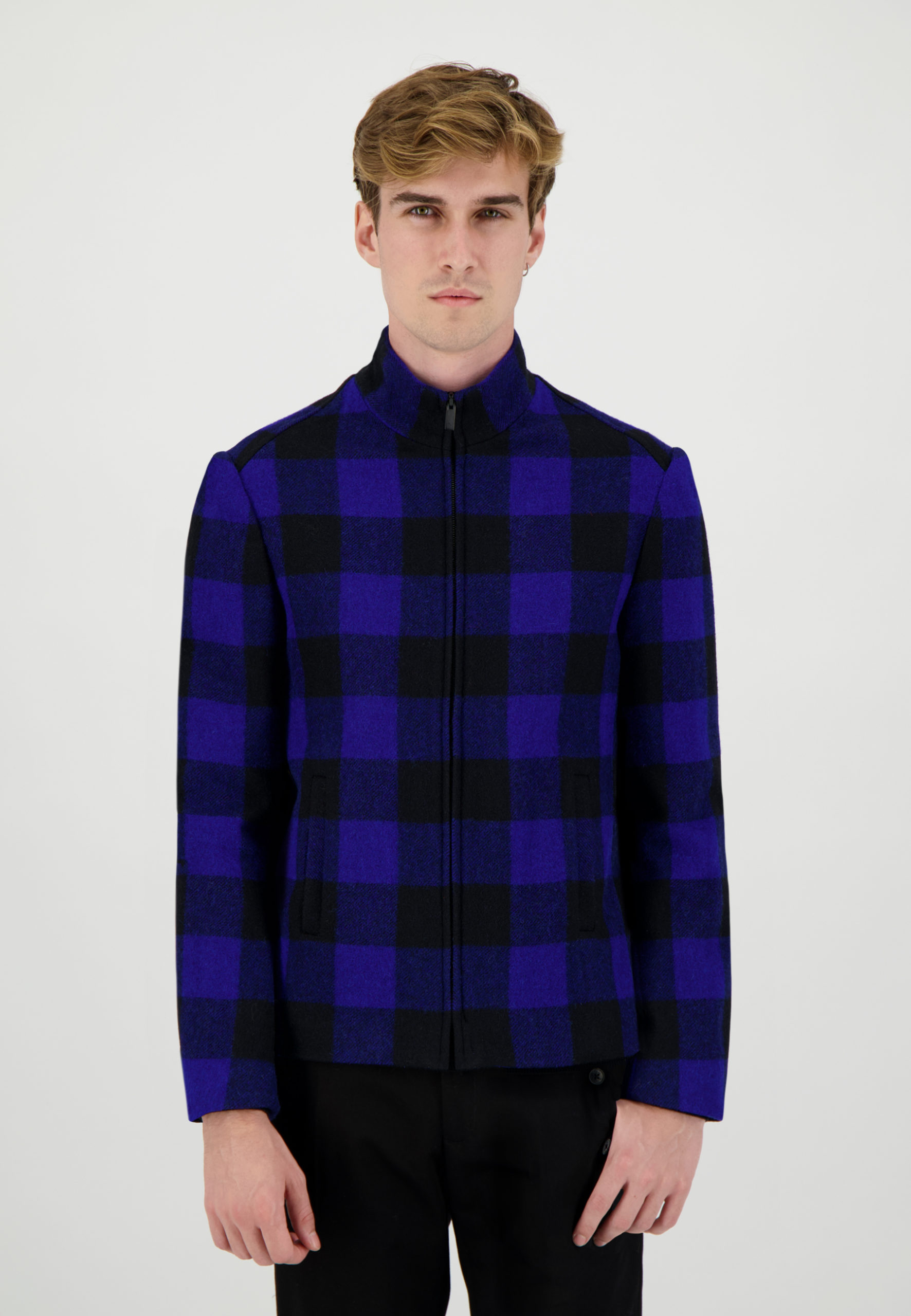 Blouson court en drap de laine à carreaux bleu et noir • Coupe droite • Col montant • Parmenture et intérieur de col en contrast bleu • Fermeture à zip • Deux poches passepoilées • Deux poches intérieures Composition et entretien : • 100% Laine • Doublure viscose • Nettoyage à sec Notre mannequin Edouard mesure 186 cm et porte une taille 46