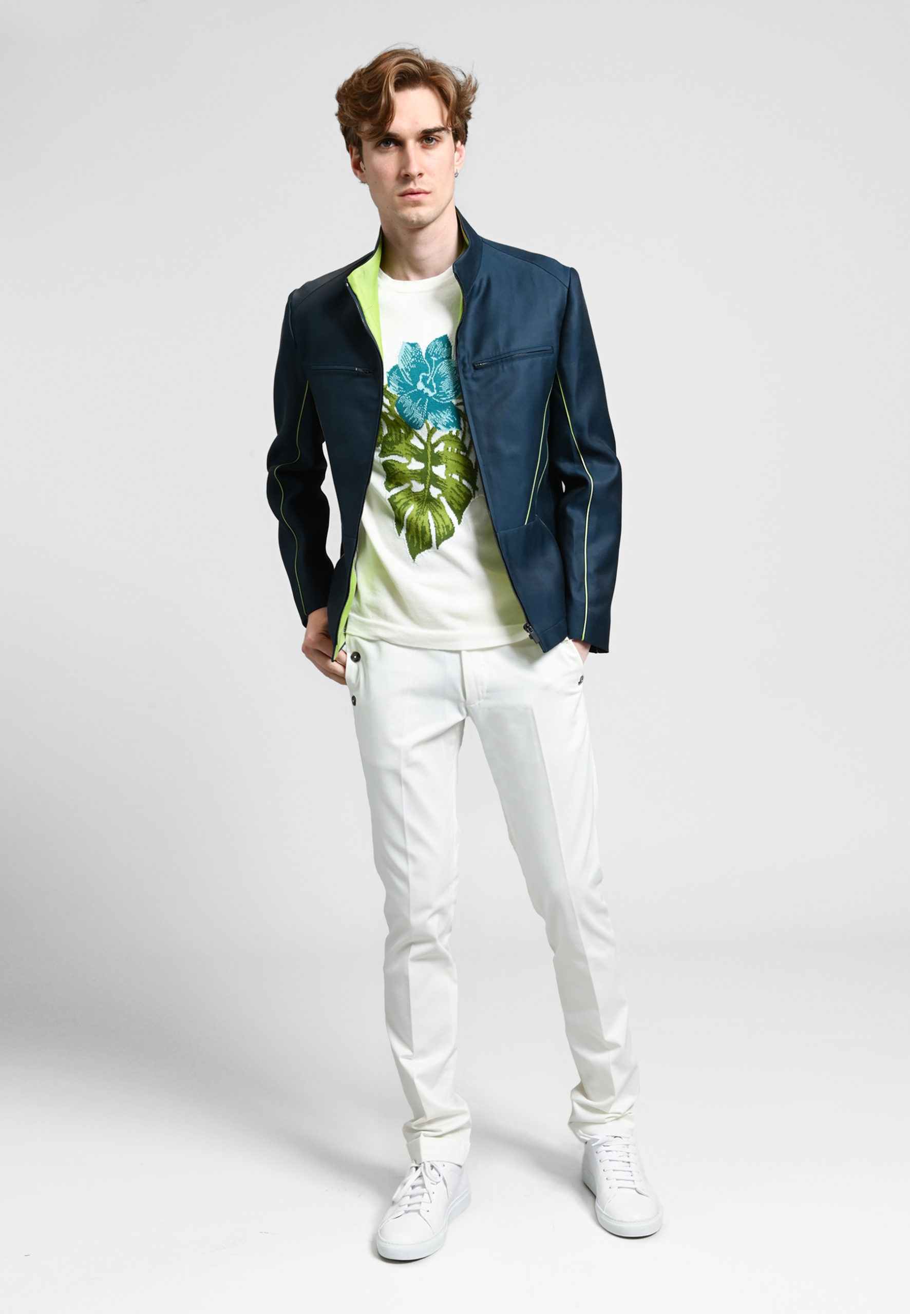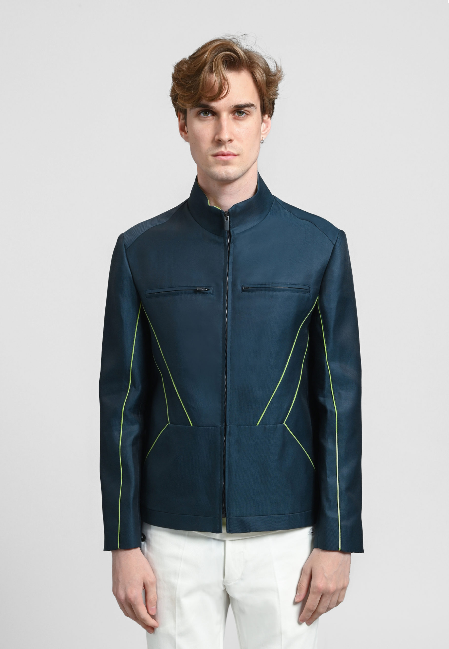 Blouson court bleu, ganses contrastées vert, fermeture zippée, poches côtés. Doublure ivoire à rayures. 60% coton 40% soie. Nettoyage à sec.