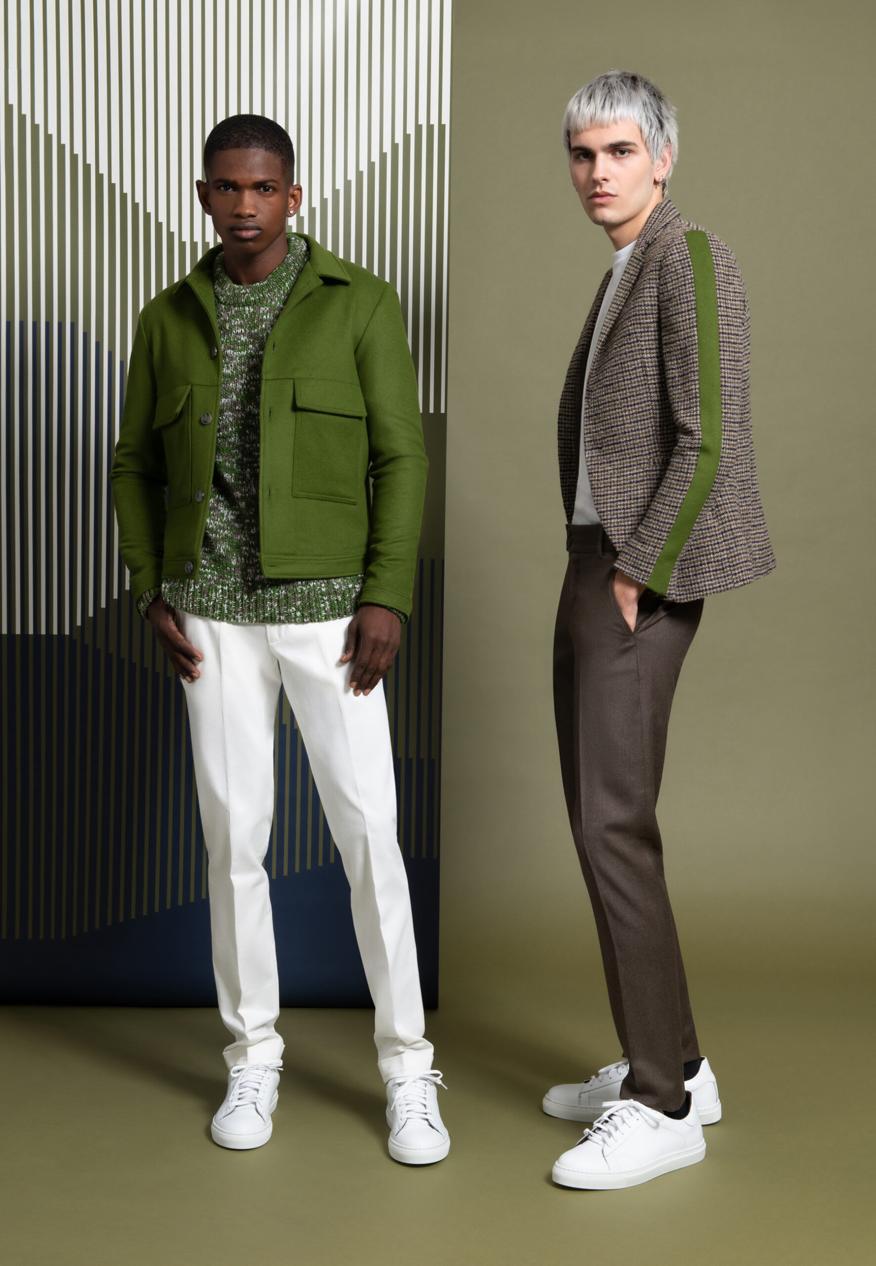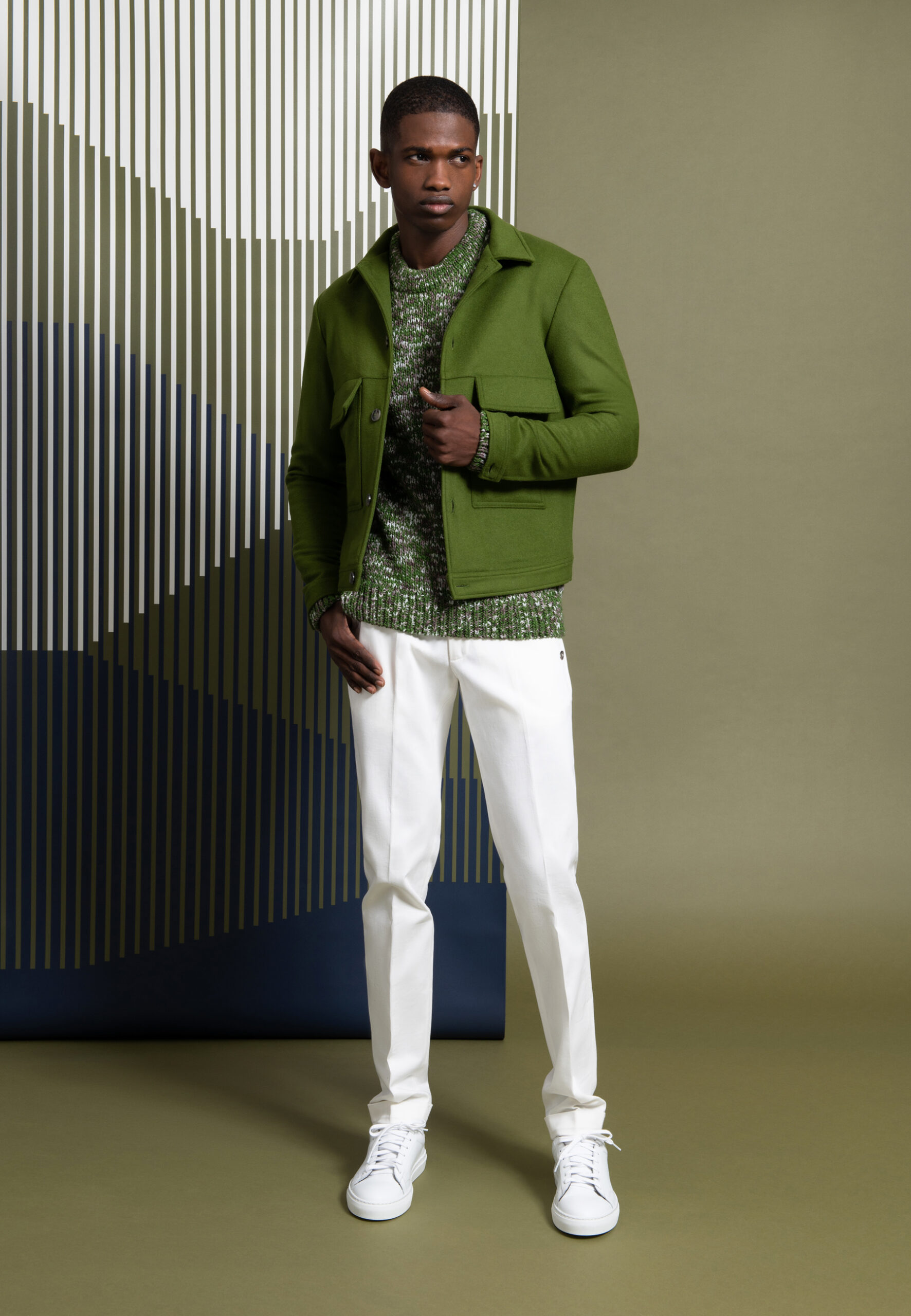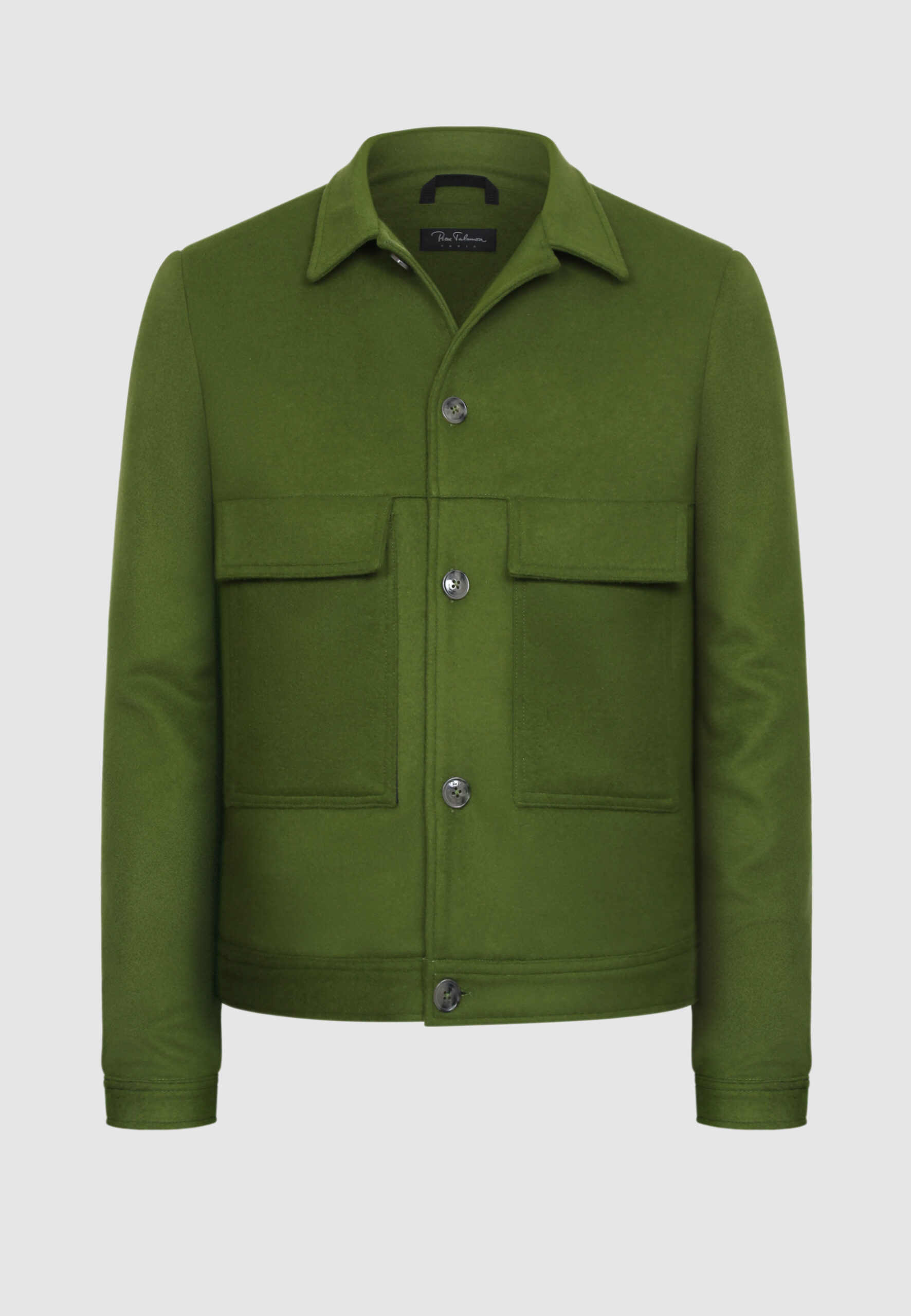 Blouson court en drap de laine vert • Coupe droite • Col chemise • Boutonnage simple à 5 boutons • Poignets boutonnés • Deux poches plaquées et à rabat • Deux poches intérieures Composition et entretien : • 75% Laine, 20% Polyamide, 5% Cachemire • Doublure viscose • Nettoyage à sec Notre mannequin Ibrahim mesure 180 cm et porte une taille 46