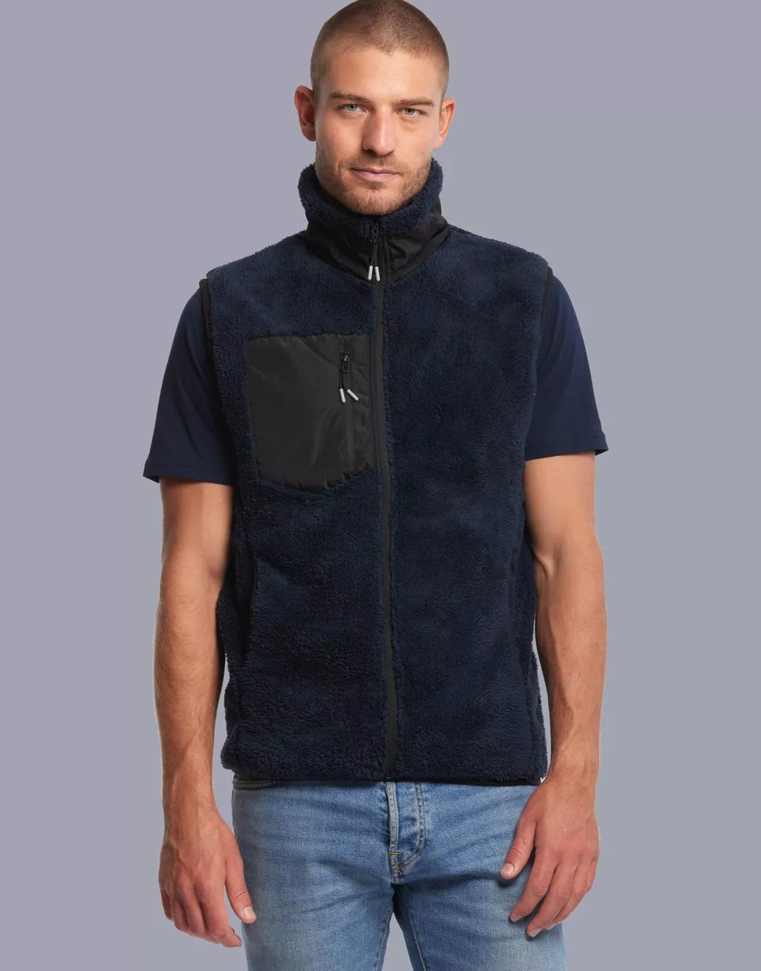 Bodywarmer Sherpa homme recyclé personnalisable. Chaud et confortable, il présente un col montant, des poches zippées et un empiècement pour marquage. Idéal pour une personnalisation durable. Disponible du XS au 4XL, en écru, gris, marine et noir. Existe aussi en version femme. Réf : 190A00159