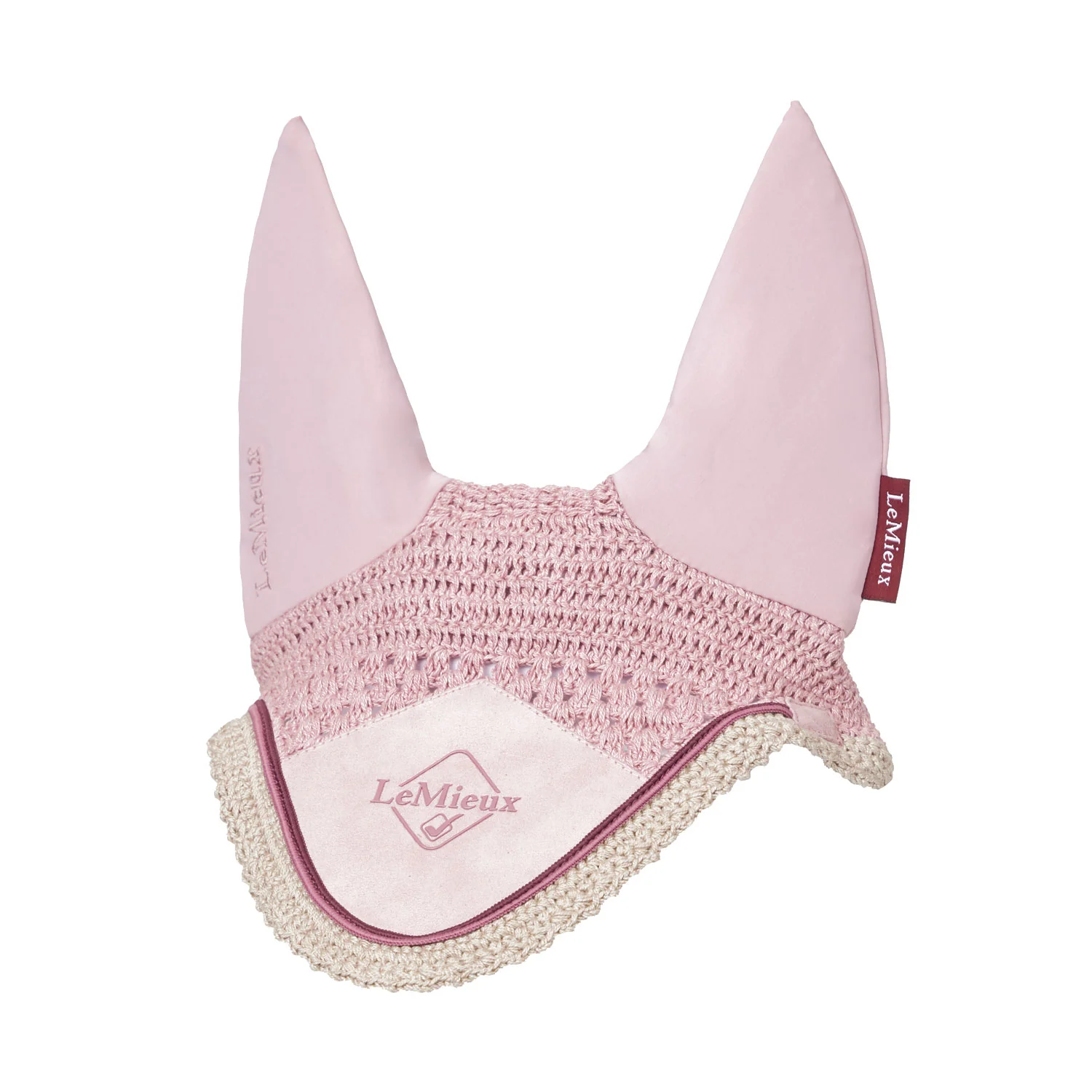 Bonnet qui protège les chevaux des insectes pendant le travail. D’une belle couleur Rose pâle (Blossom) avec une bordure et une cordelette rose clair et fuschia.