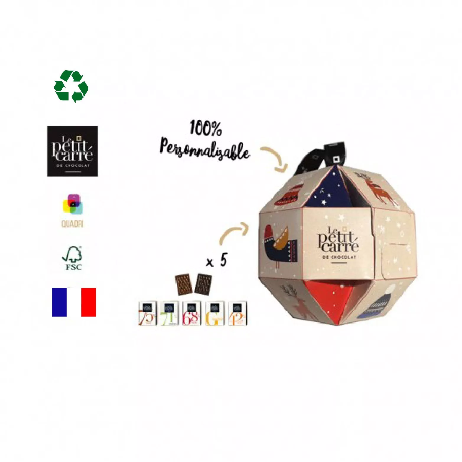 Boule de Noël avec un mélange de 5 saveurs, 1 carré = 5gr, (42%, Gianduja, 68%, 71%, 75%), 100% en carton recyclé. Disponible en 3 tailles. Impression en quadri all over. Réf.: 270A03118