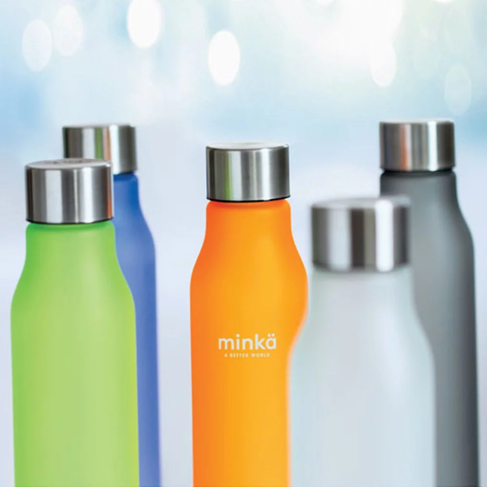 Bouteille en RPET avec finition caoutchoutée et acier inoxydable. Bouchon intérieur en RPET et anneau en silicone. Sans BPA. Anti fuite. Contenance : 600 ml. Ne convient pas aux boissons gazeuses. Dimensions: Ø 6 x 23 cm Réf: 056A01686