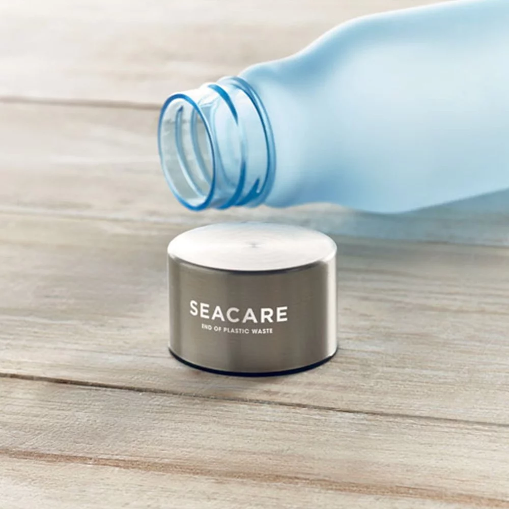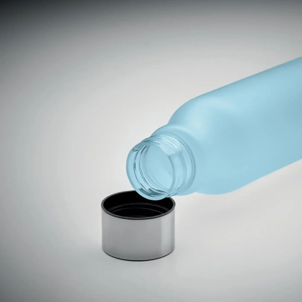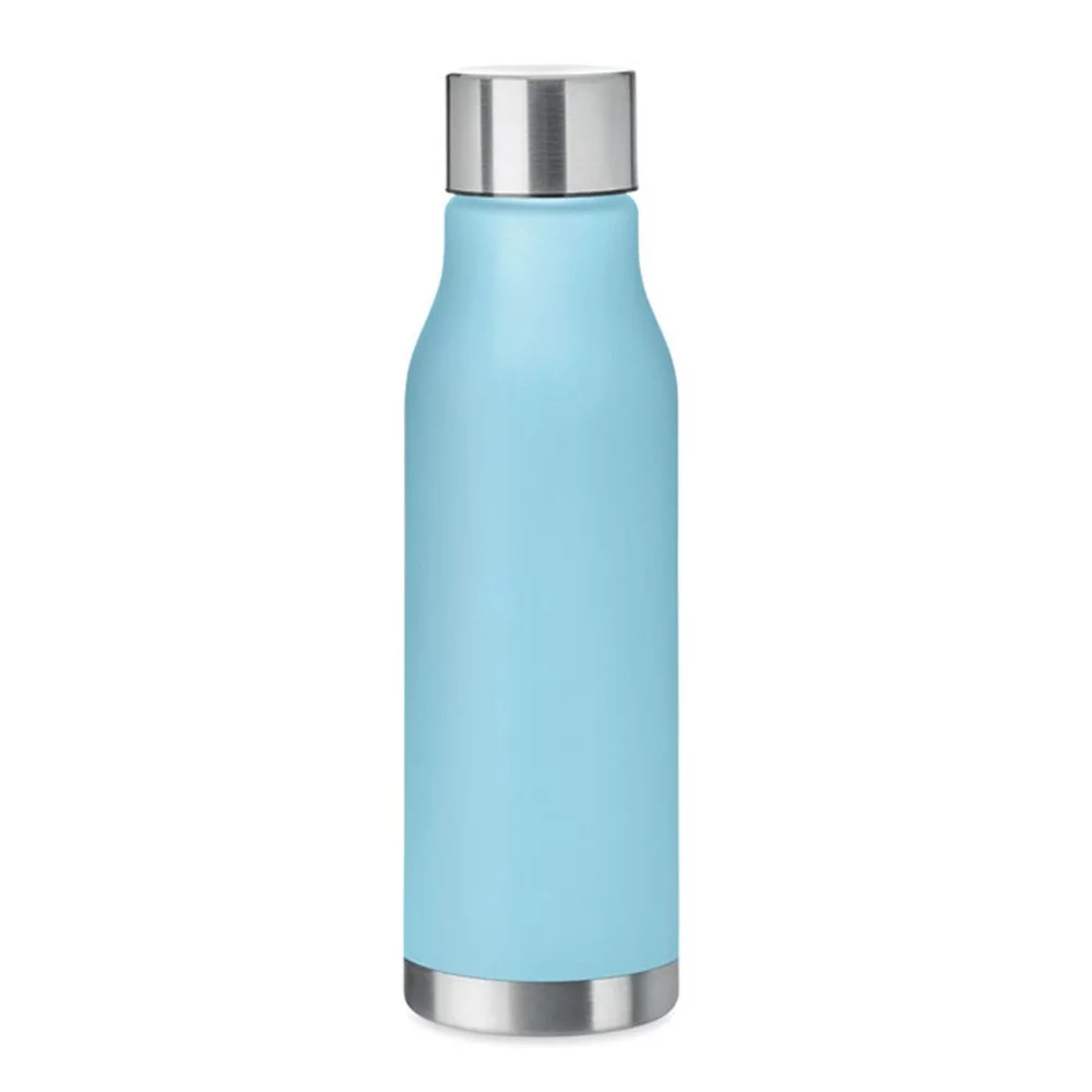 Bouteille en RPET avec finition caoutchoutée et acier inoxydable. Bouchon intérieur en RPET et anneau en silicone. Sans BPA. Anti fuite. Contenance : 600 ml. Ne convient pas aux boissons gazeuses.