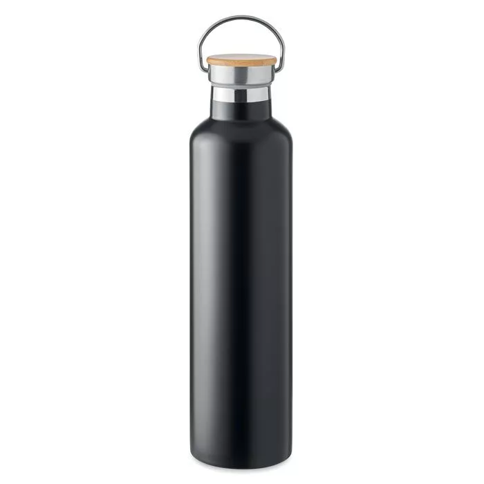 Bouteille isotherme 1L recyclé personnalisable, inox double paroi, couvercle en bambou avec poignée, durable et élégante. Réf : 056A00762