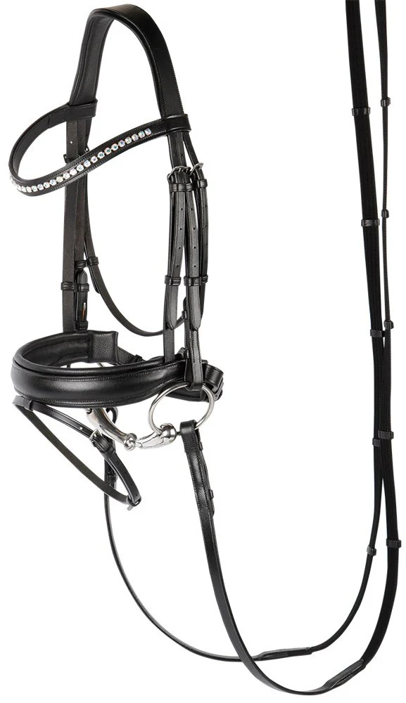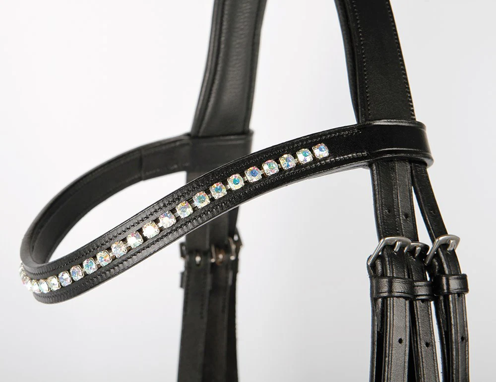 Luxueux bridon en cuir de haute qualité avec muserolle combinée large et matelassée, et frontal verni décoré de cristaux. Vendu avec rênes sangles.