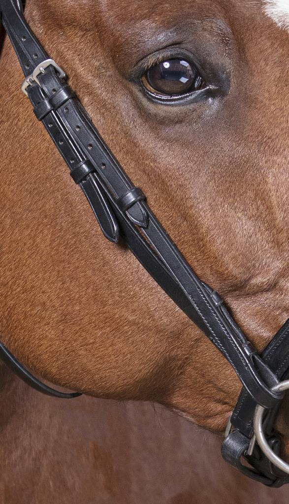 Bridon cuir de buffle. Têtière et muserolle suédoise doublées cuir vachette, frontal vernis. Passepoil sur muserolle vernis. Coutures noires. Crochets sur les montants de mors. Bouclerie en inox. Vendu sans les rênes.