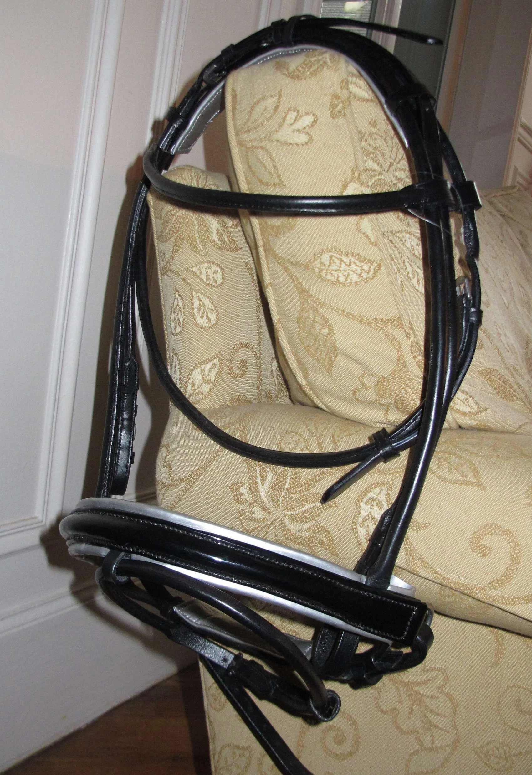 Filet en cuir rond noir. Doublure argent sur la muserolle