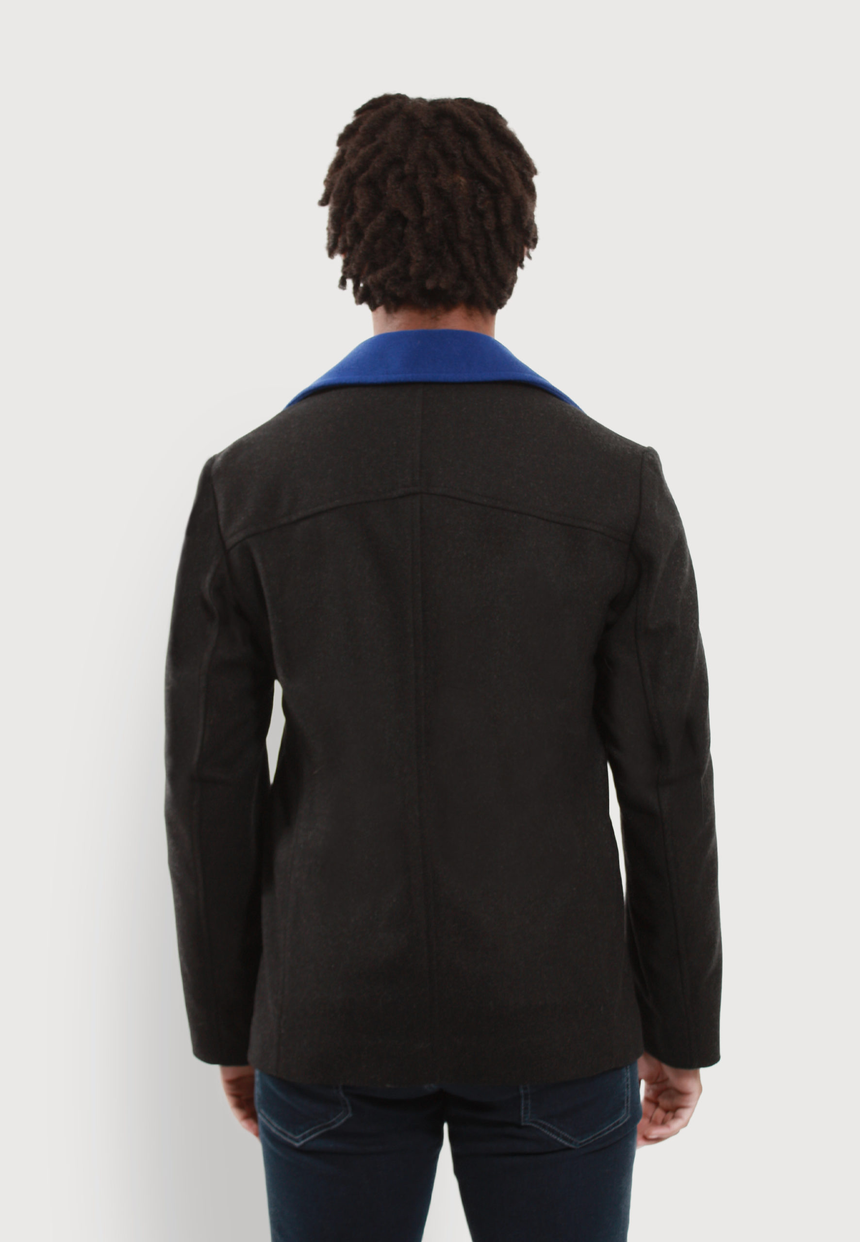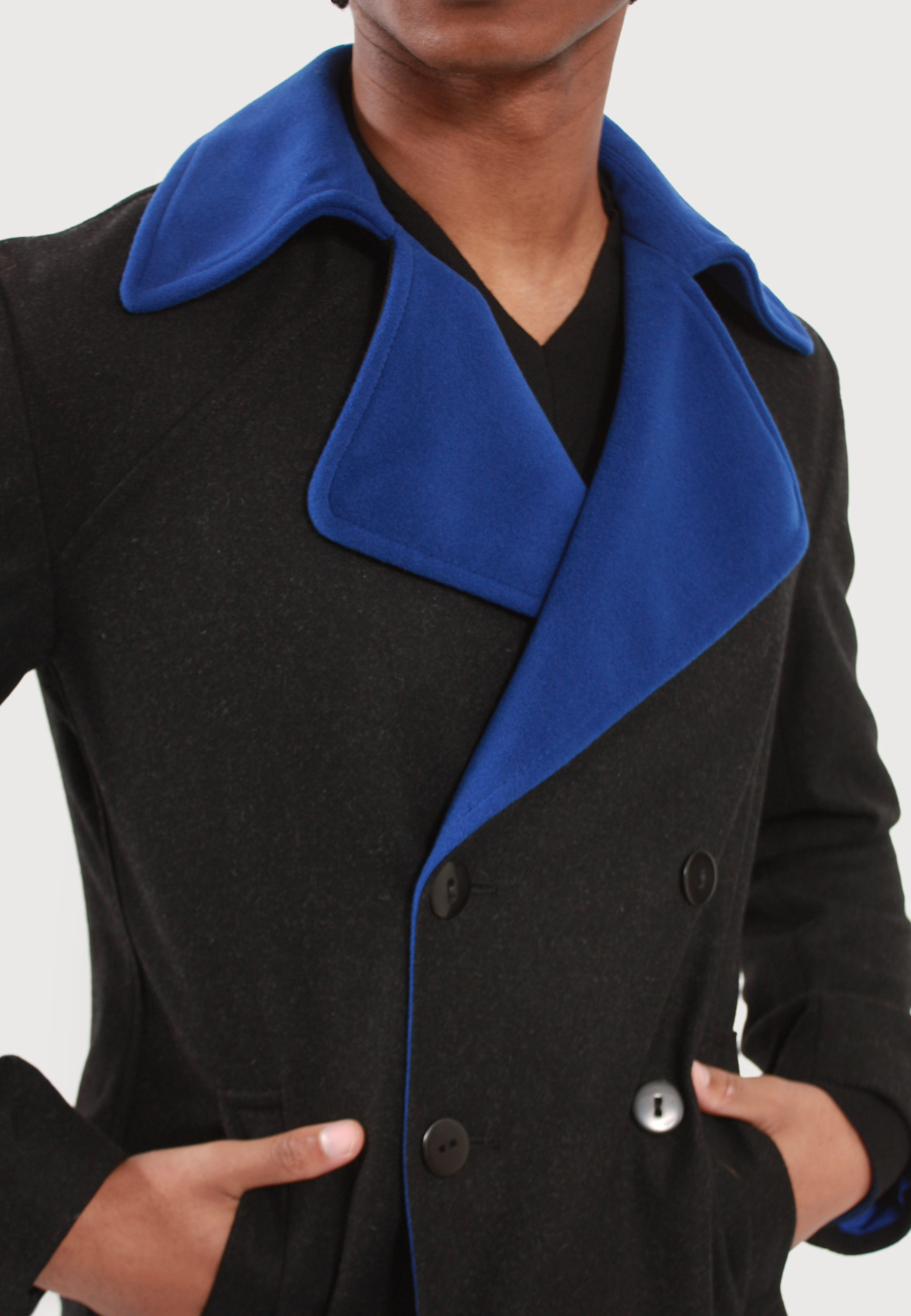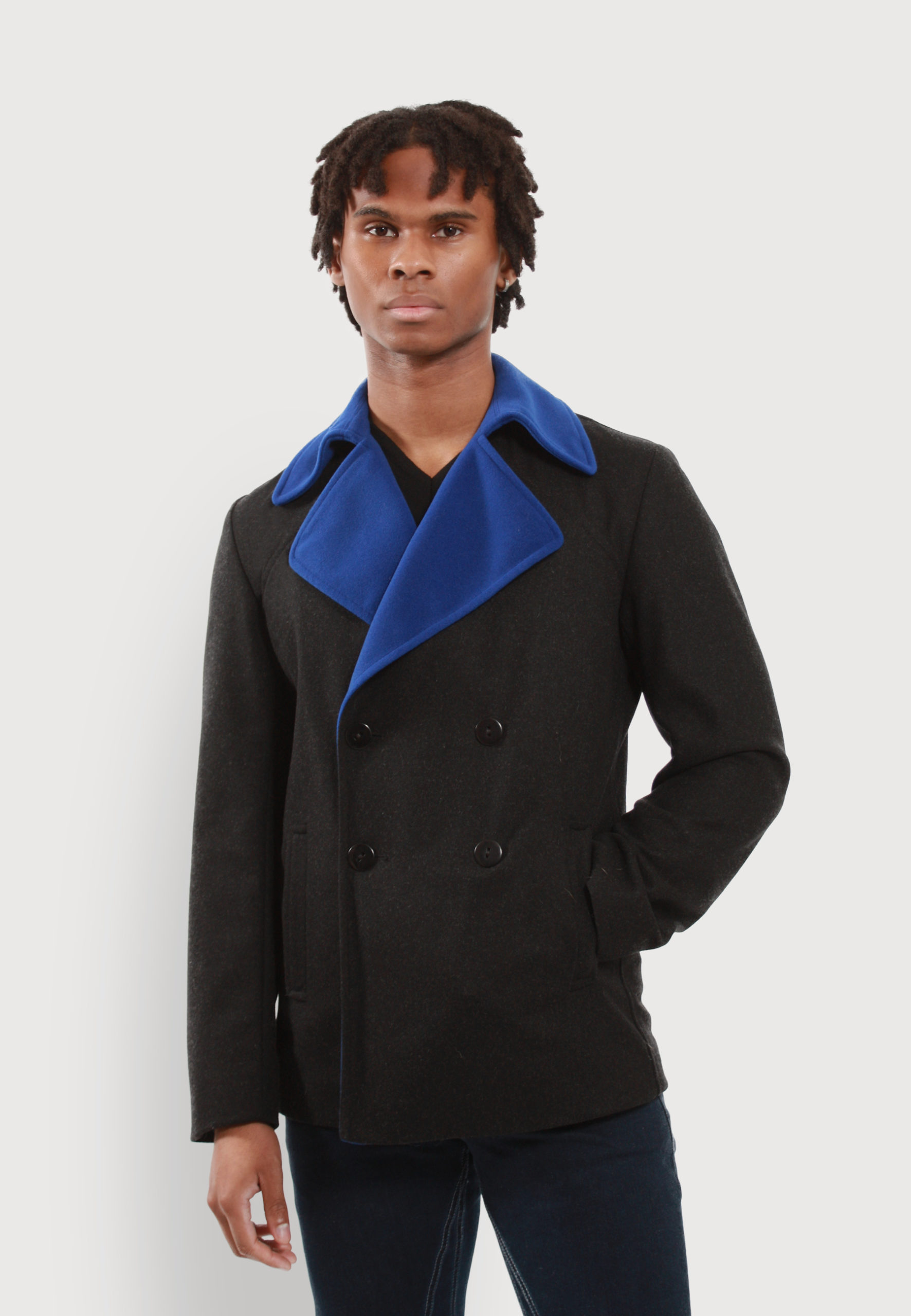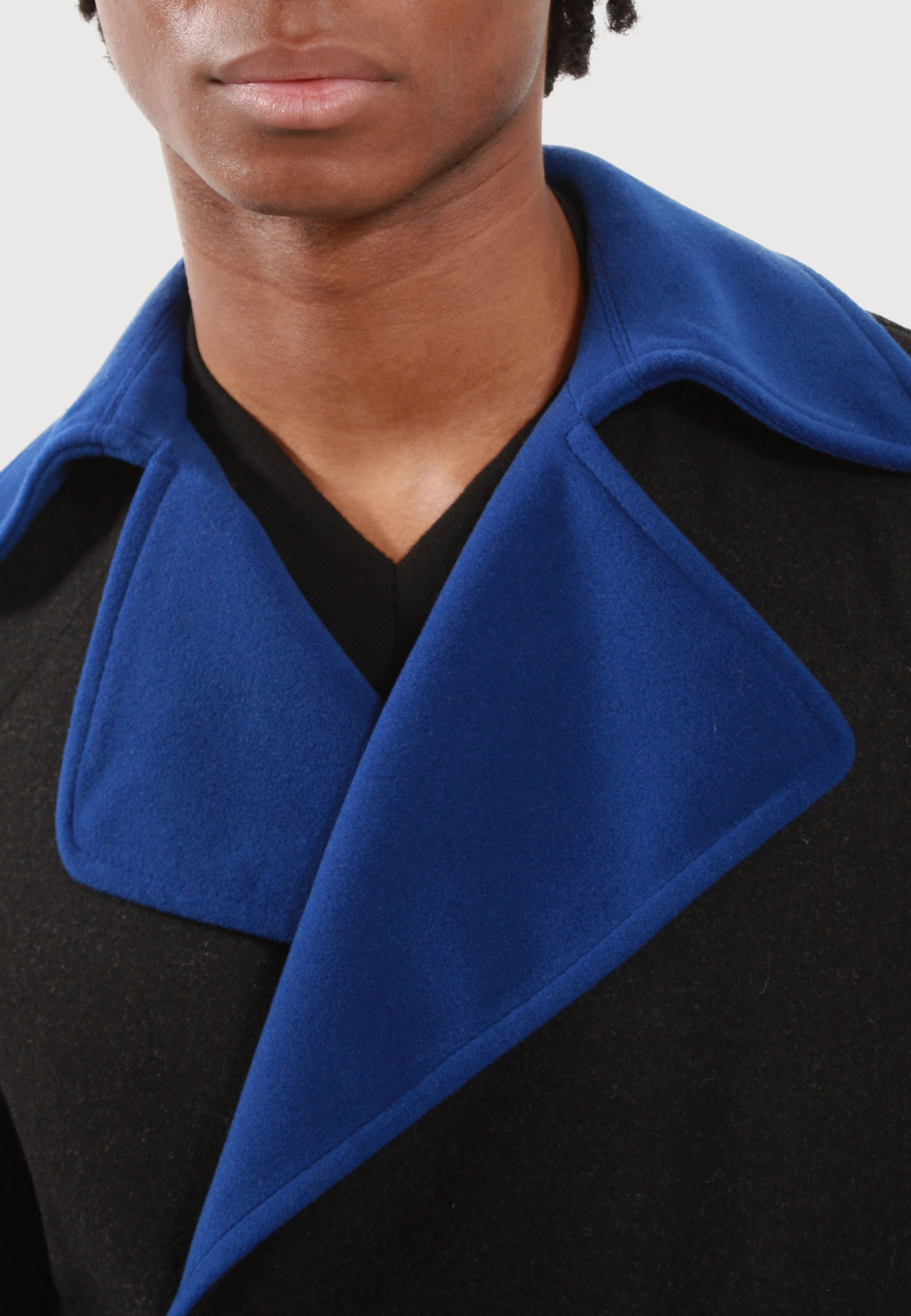 Caban croisé noir, deux poches, 4 boutons col et parmenture bleu royal 90% Laine et 10% Pa Nettoyage à sec