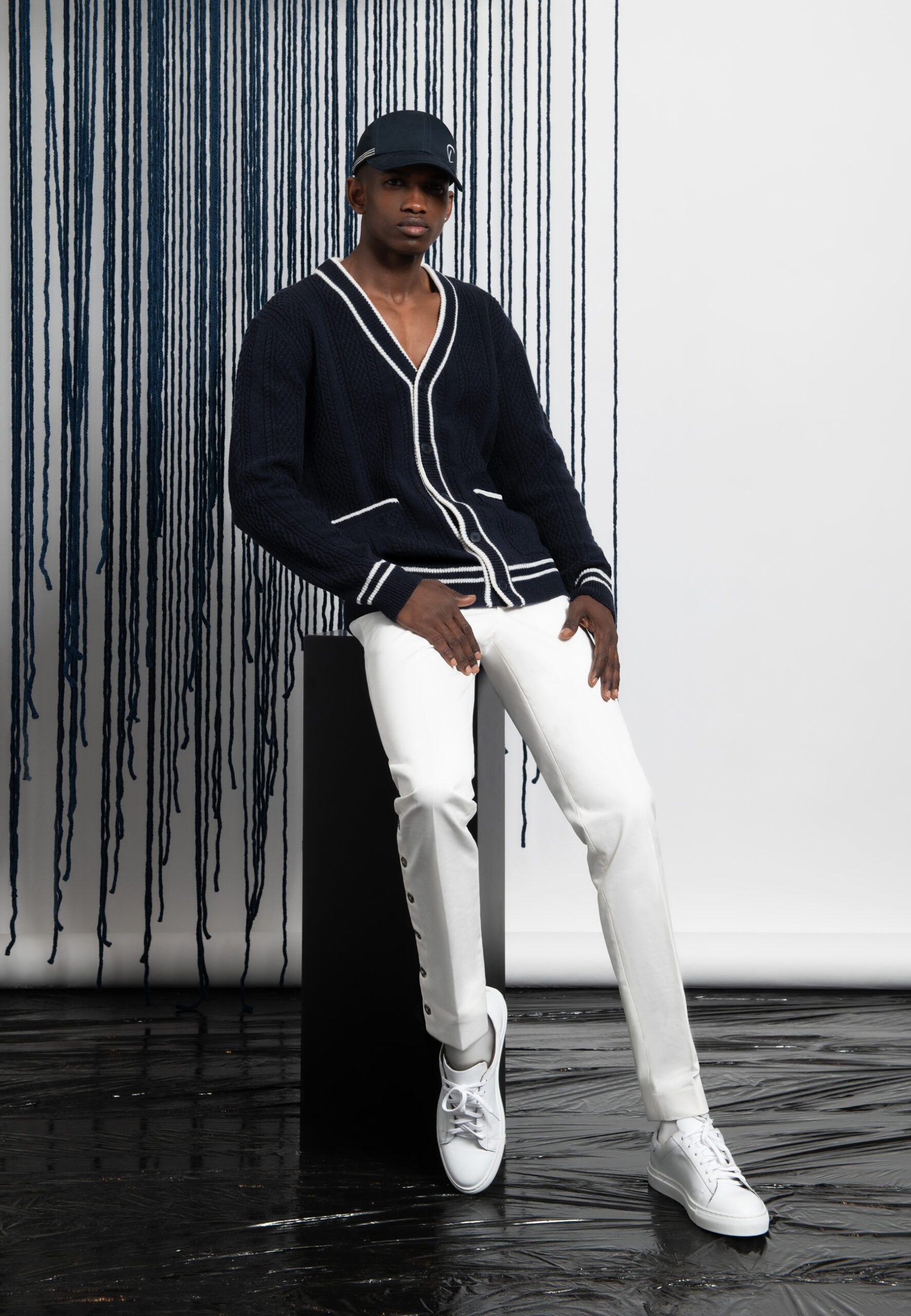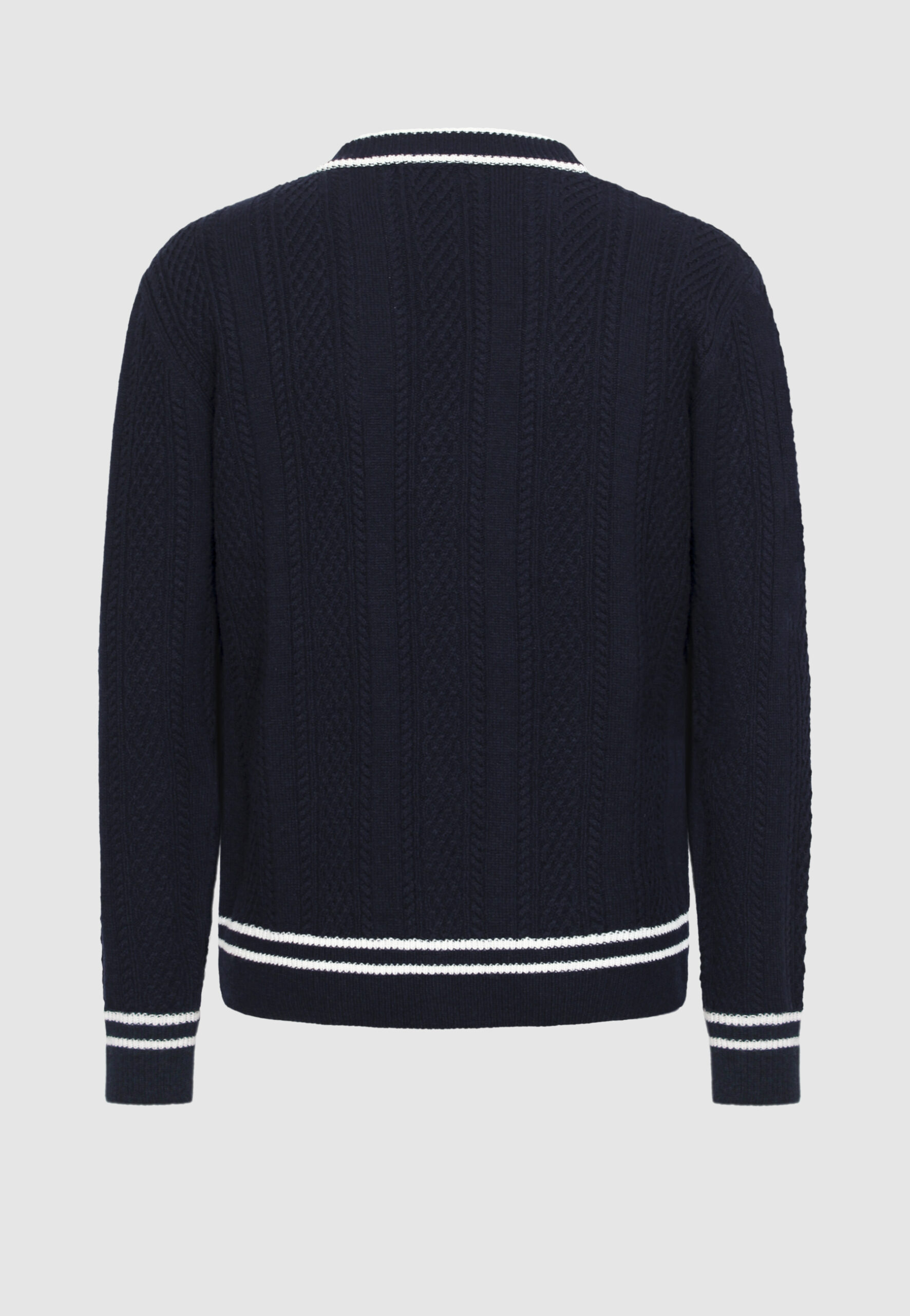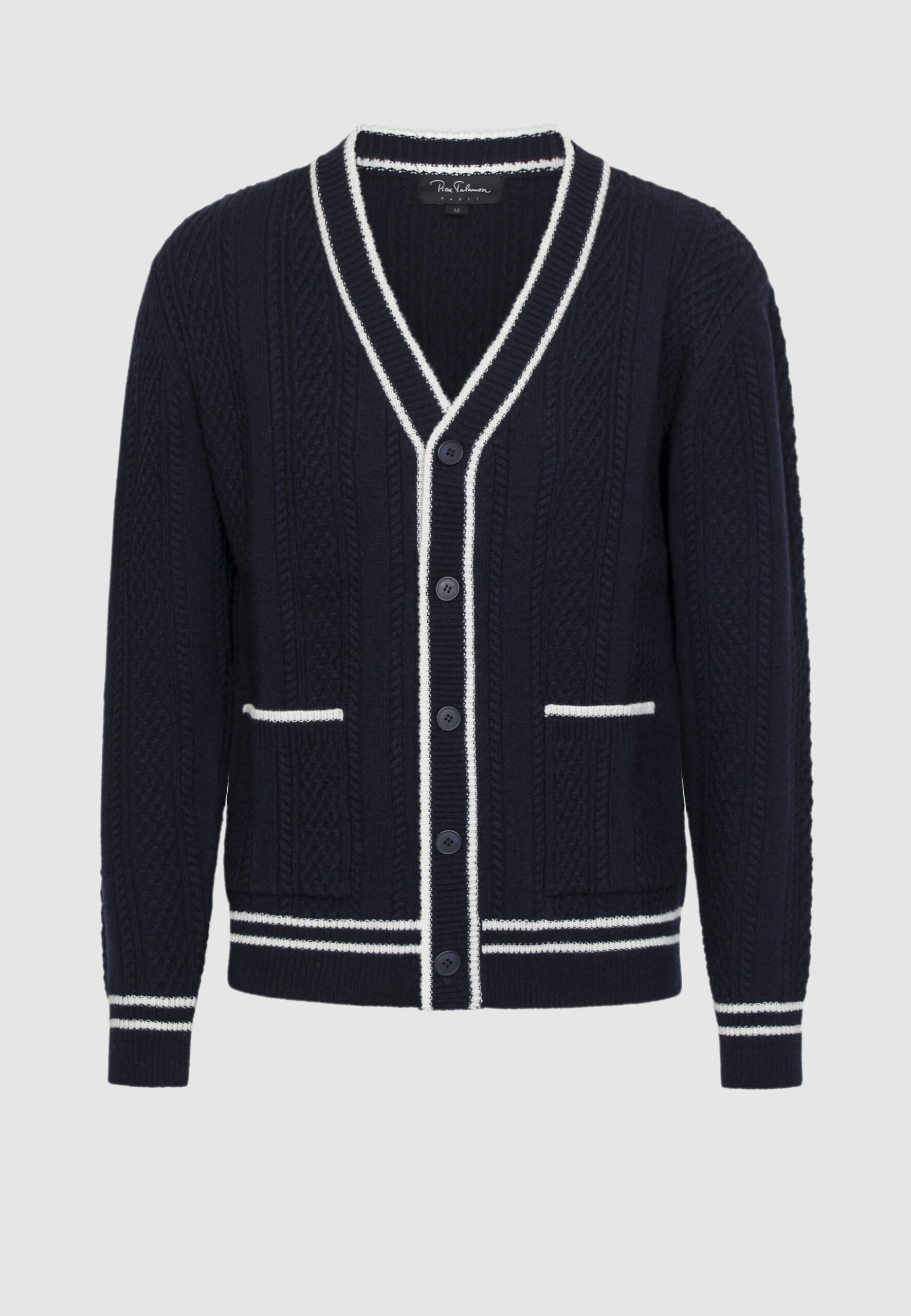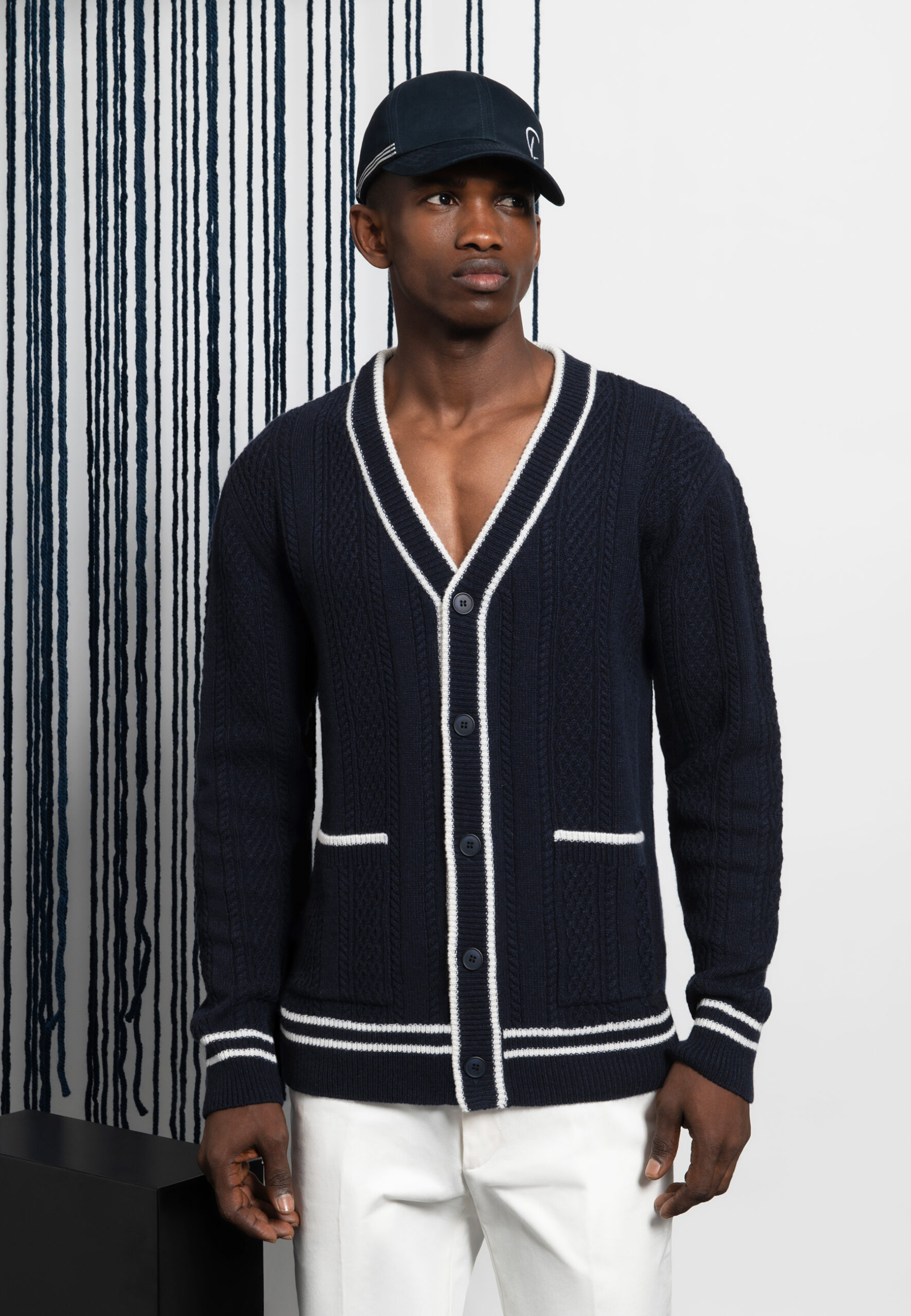 Cardigan à torsade bleu marine et à rayures blanches • Coupe classique • Col V • Boutonnage à 5 boutons • Manches longues • Deux poches plaquées Composition et entretien : • 90% Mérinos 10% Cachemire • Lavage machine laine délicat Notre mannequin mesure 180 cm et porte une taille M