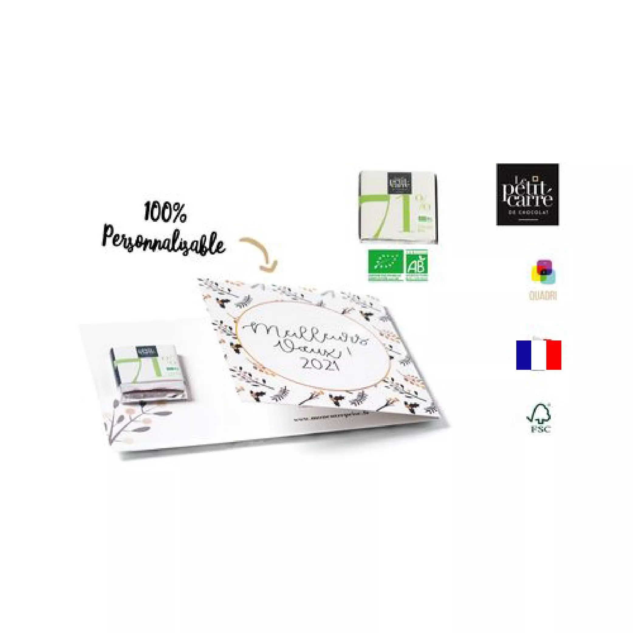 Carte de vœux avec 1 carré de chocolat 71% bio made in France