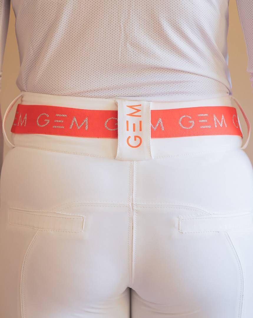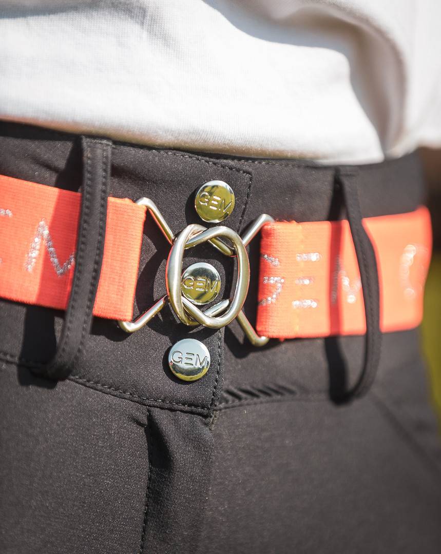 Du corail et de l’argenté, pour pimenter vos tenues préférées. Répétition de logos GEM sur tout le long de la ceinture. À porter en ville ou aux écuries.