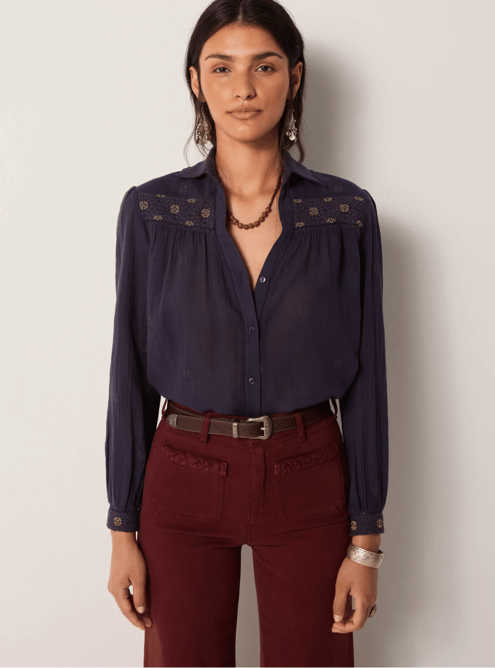 Des motifs floraux parsèment les épaules et les poignets, brodés dans des tons bleu marine et encre. La broderie brille subtilement, révélée par la lumière.
