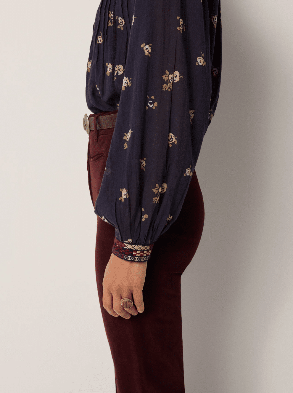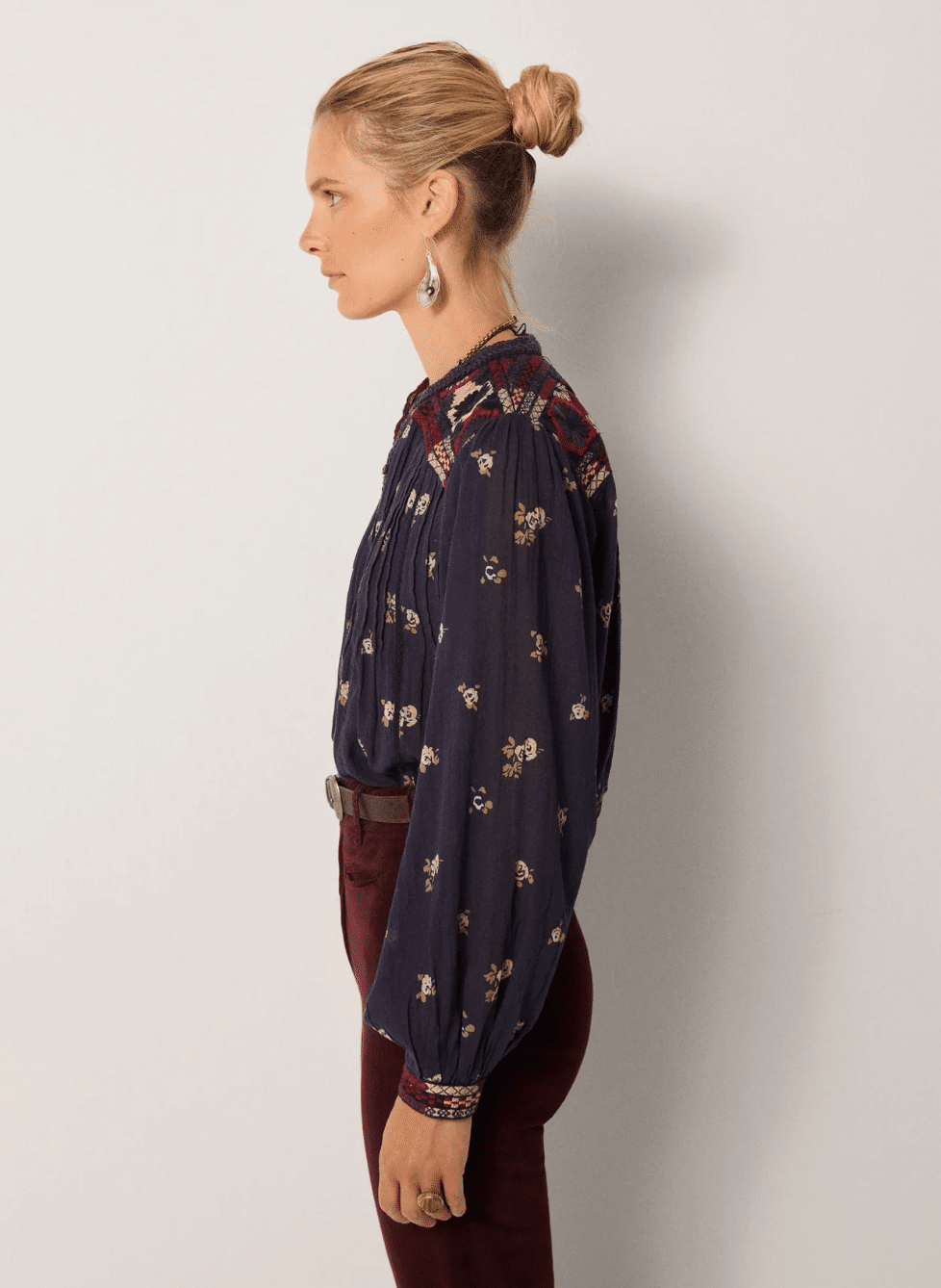 Ce chemisier est orné de broderies sur les poignets, les épaules et de passepoils le long du col et du devant. Ces coutures lui confèrent une profondeur discrète, équilibrant la légèreté du tissu et sa structure artisanale.