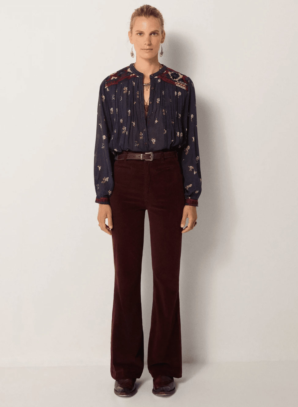 Porté ici rentré dans un pantalon en velours côtelé Jerry et resserré par la ceinture Rodolfo, le col ouvert offre une allure décontractée. Il se porte aussi bien sous un tailleur que sur un jean ample : polyvalent, décontracté et discrètement raffiné.