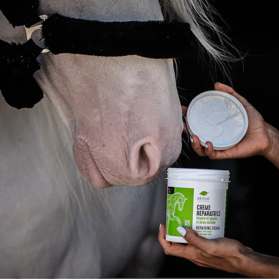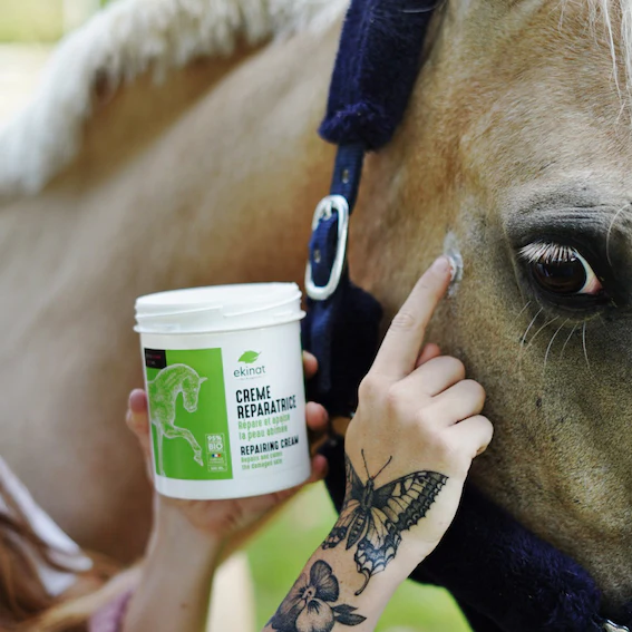 La crème réparatrice Ekinat pour chevaux est formulée à base d’huile essentielle de thé vert et d’huile de tamanu.