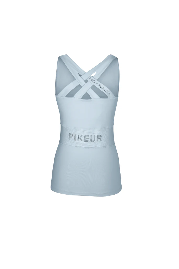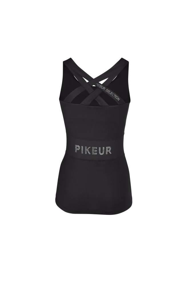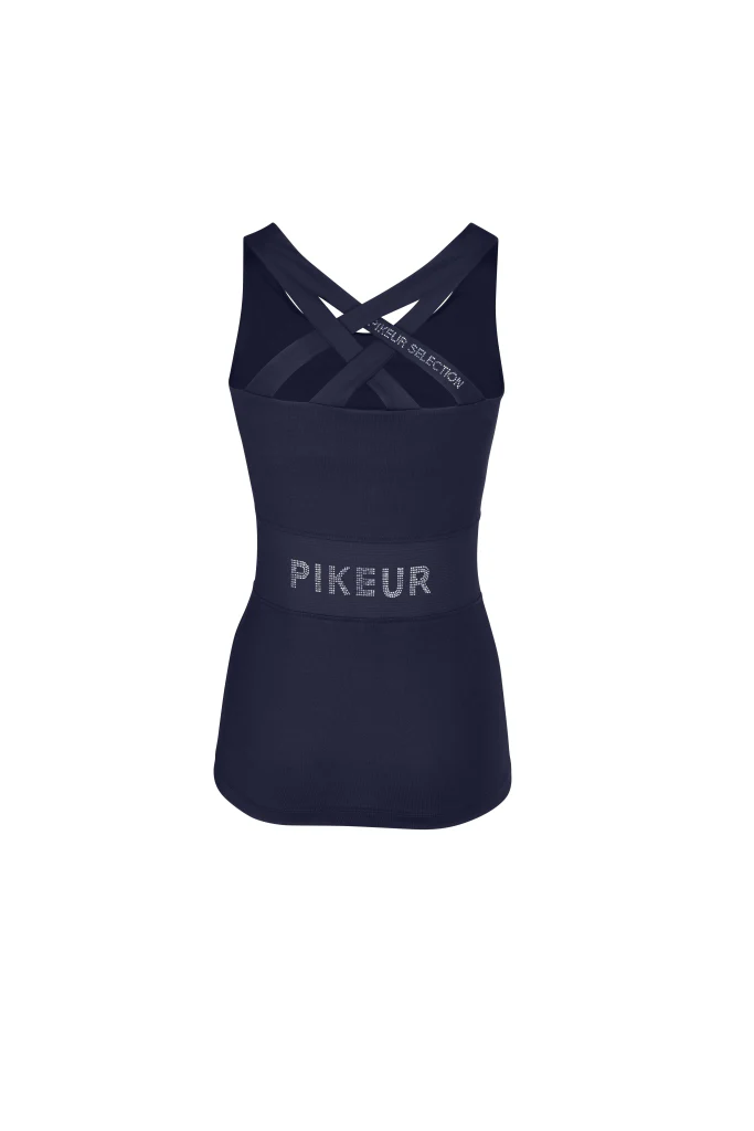 Superbe top stretch, respirant, séchage rapide et absorbant. Bretelles doubles croisées dans le dos.Le tissu est doublé au niveau de la poitrine.Bande en mesh dans le dos. Coloris noir: Logo Pikeur satin en all-over Coloris bleu ciel et bleu marine: Logo Pikeur en strass