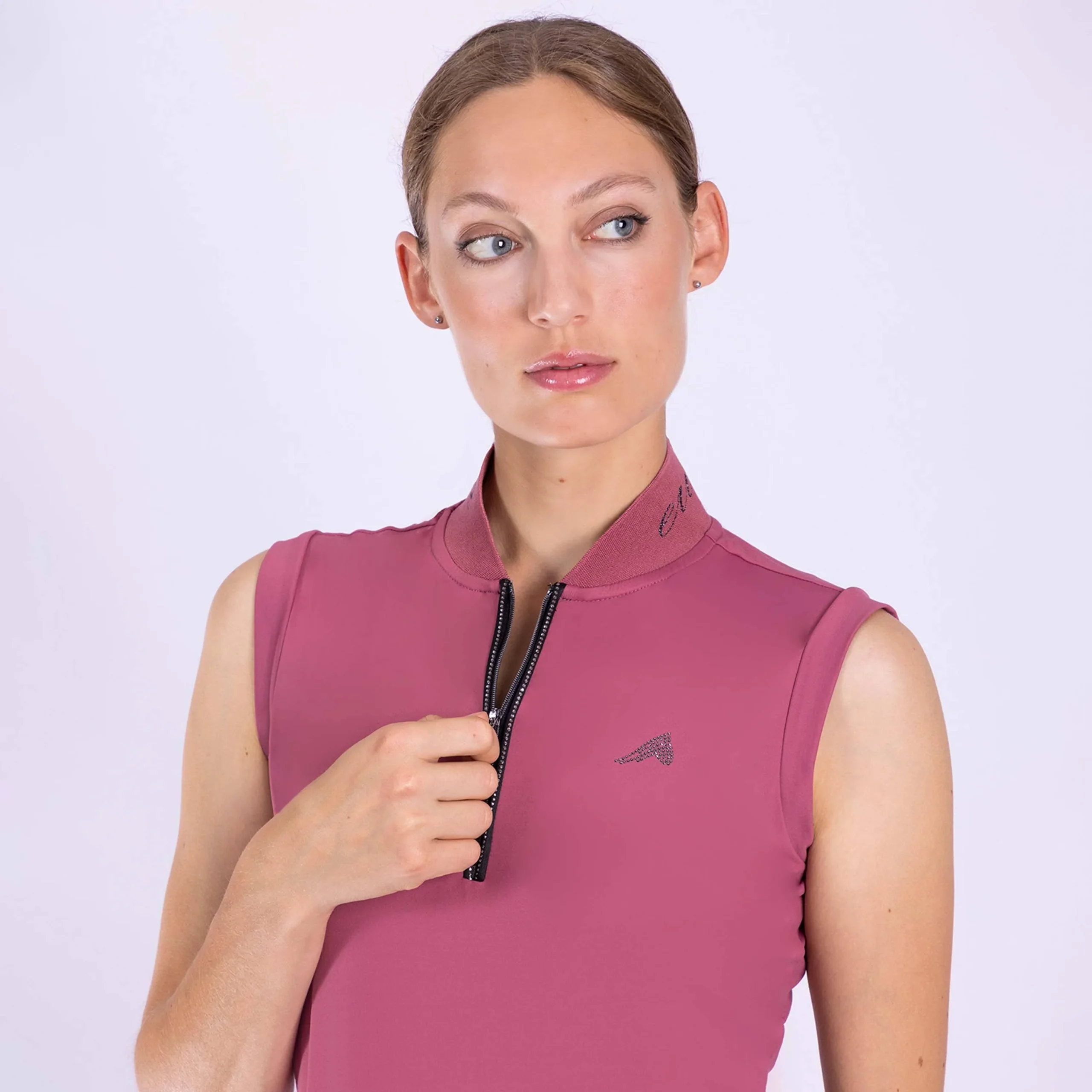 Débardeur Ramona technique, tissu respirant à séchage rapide Coupe ajustée Fermeture avant zippée Col en lurex avec inscription Eurostar Logo tête de cheval à strass sur le côté gauche de la poitrine