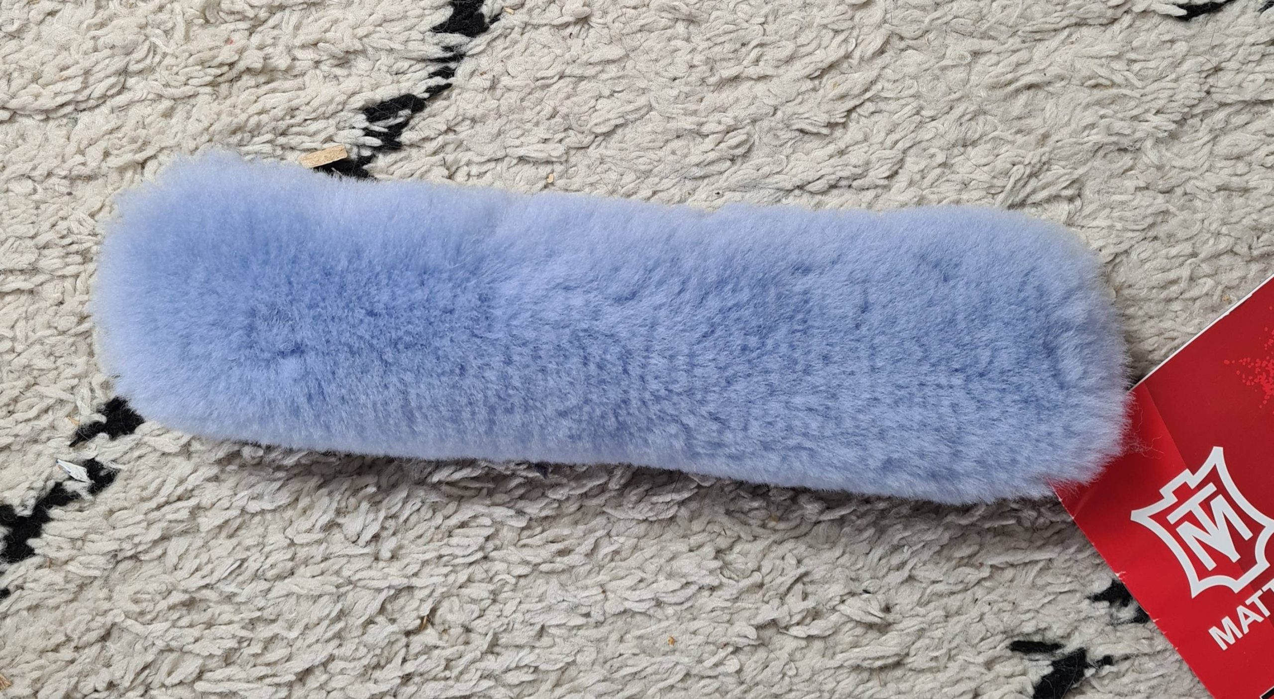 Fourreau de la marque MATTES en peau d’agneau Fourreau destiné aux muserolles ou têtieres de filet ou licol. –Couleur du mouton: bleu ciel –Tailles disponibles: 28cm