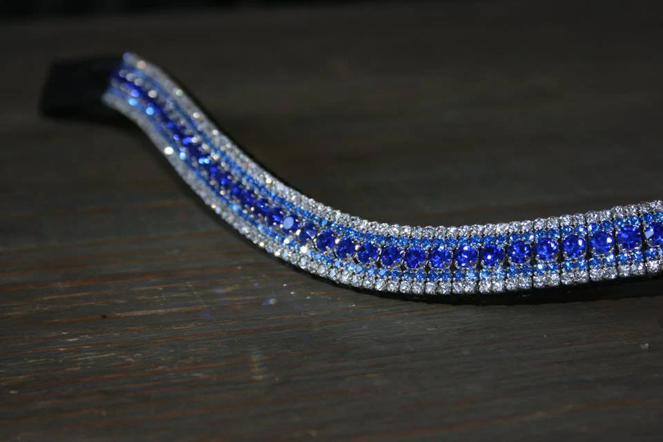 Frontal à strass composé de : une fine rangée de strass argent une fine rangée de strass bleu roi clair une grosse rangée de strass bleu roi une fine rangée de strass bleu roi clair une fine rangée de strass argent