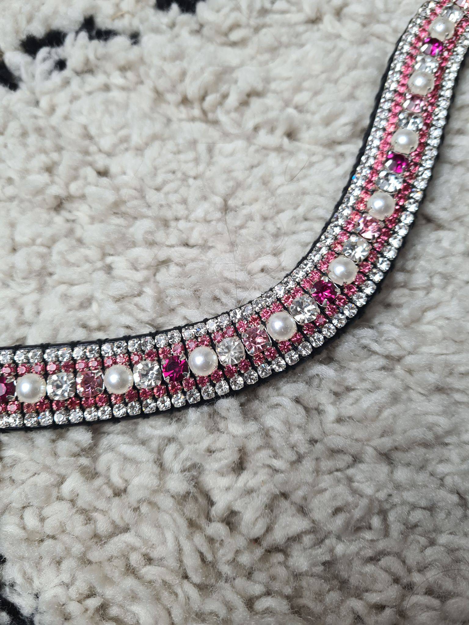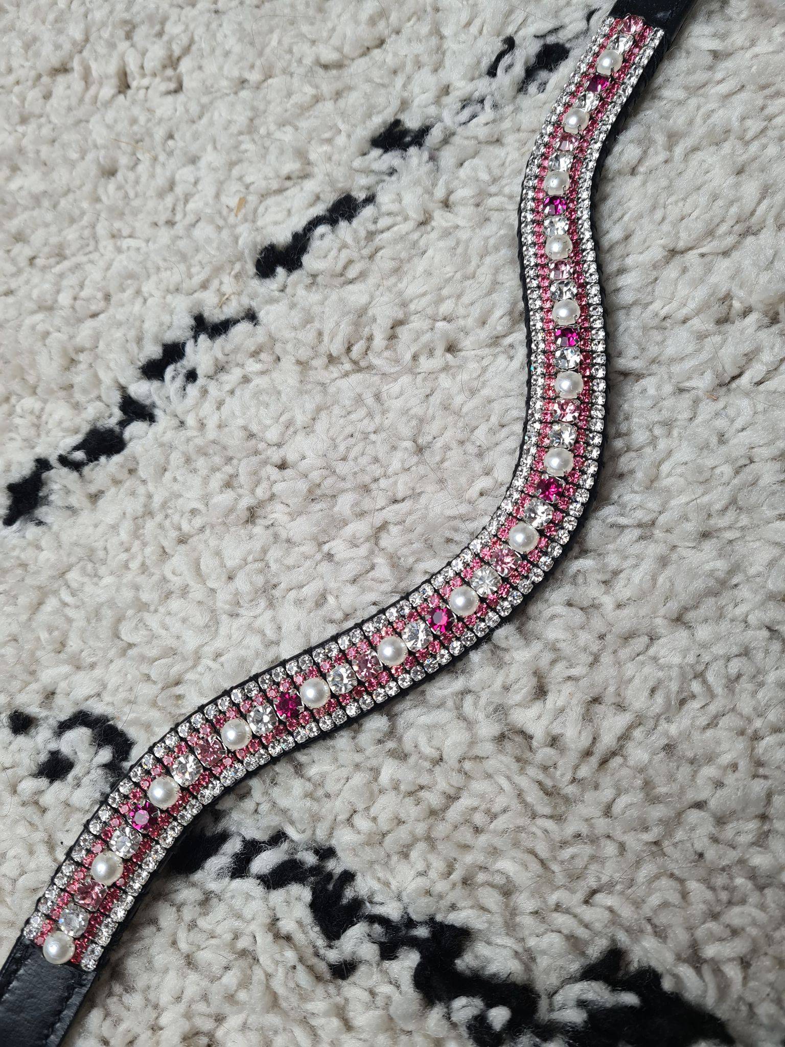 Frontal avec des strass rose, argent & fuchsia, perles blanches. Une fine rangée de strass argent et une fine rangée de strass rose encadrant une grosse rangée de strass argent, rose, fuchsia et perle alternés.