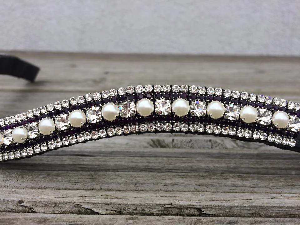 Frontal composé de deux rangées de petits cristaux argent et noir, encadrant une rangée de gros strass argent et perles.
