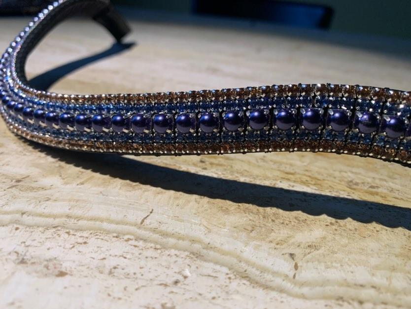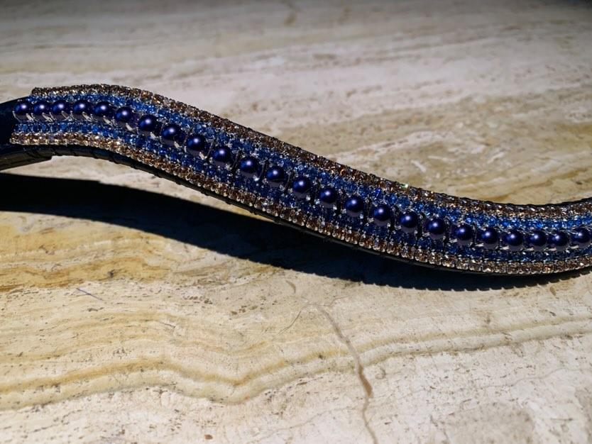 Frontal composé de 6 rangées: Une fine rangée de strass doré Une fine rangée de strass bleu ciel Une grosse rangée de perles marines Une fine rangée de strass bleu ciel Une fine rangée de strass doré Craquez pour ce superbe frontal doré et bleu! Attention, objet fragile à prendre soin