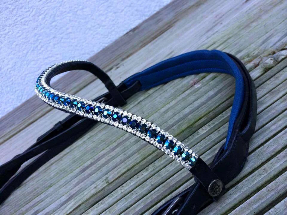 Frontal avec des strass argent et bleu Une fine rangée de cristaux argent encadre une rangée de gros cristaux bleu.
