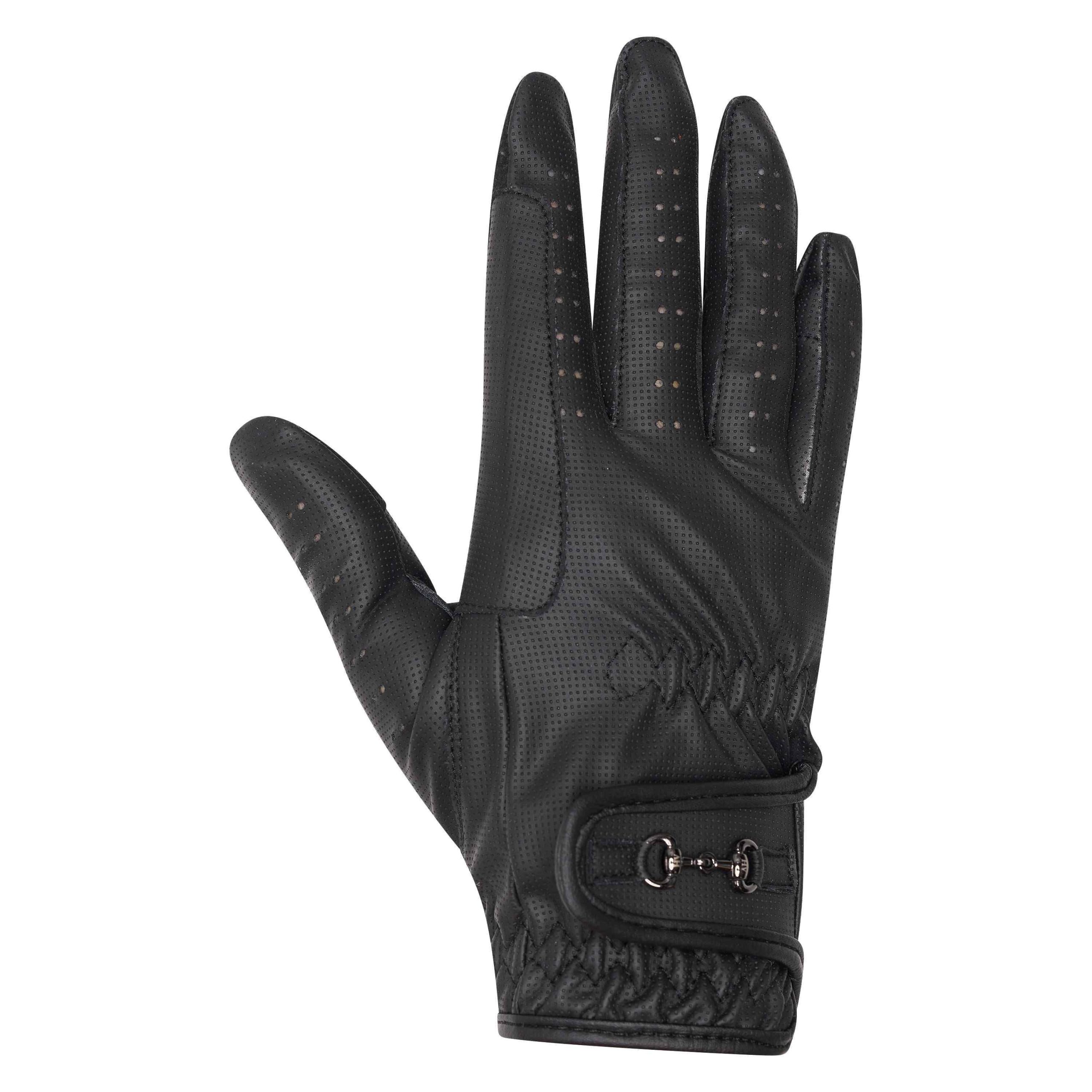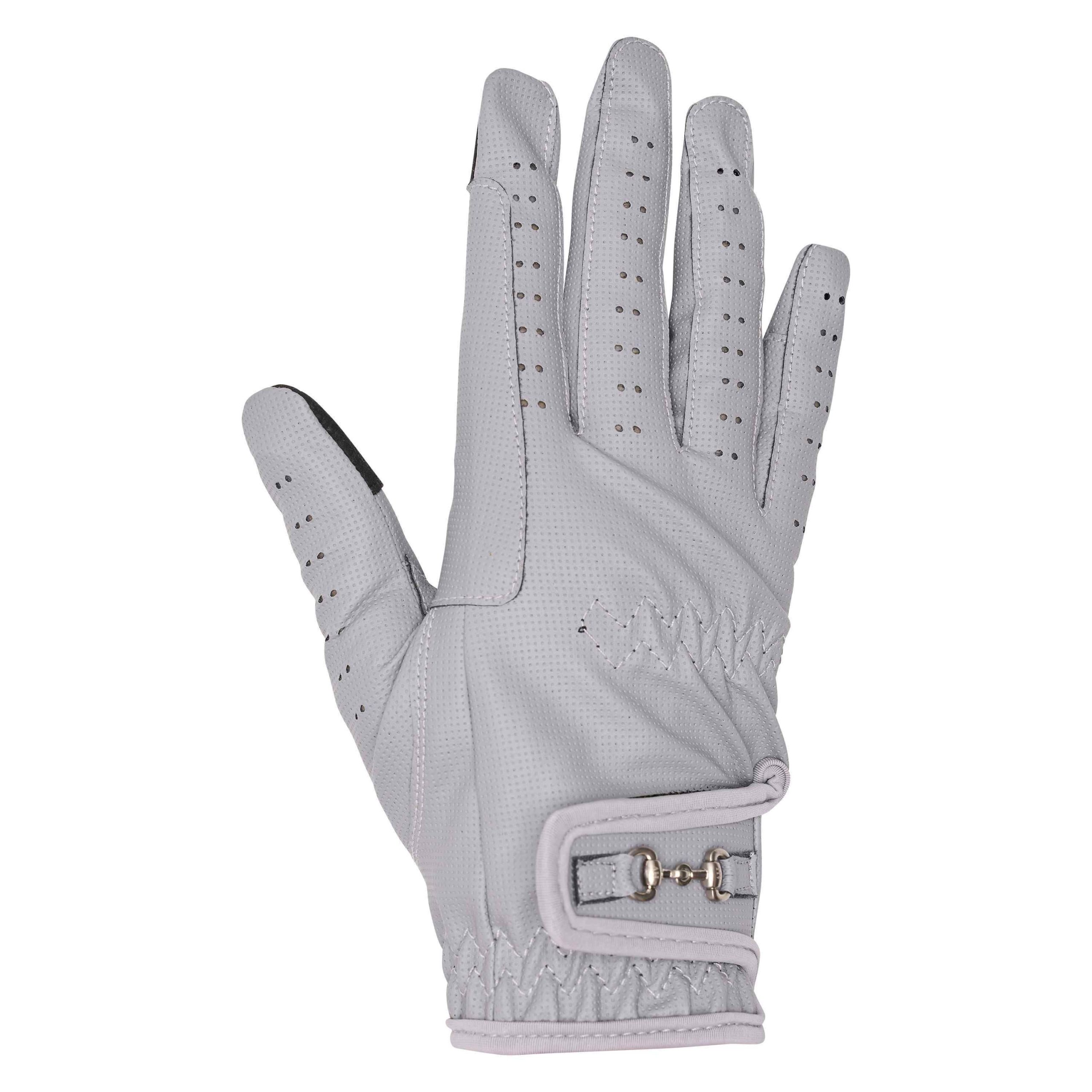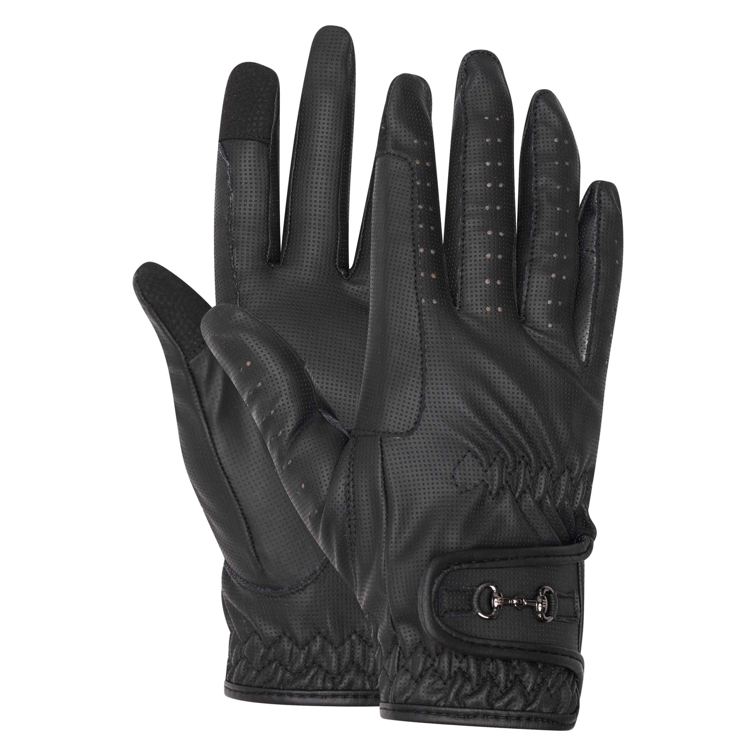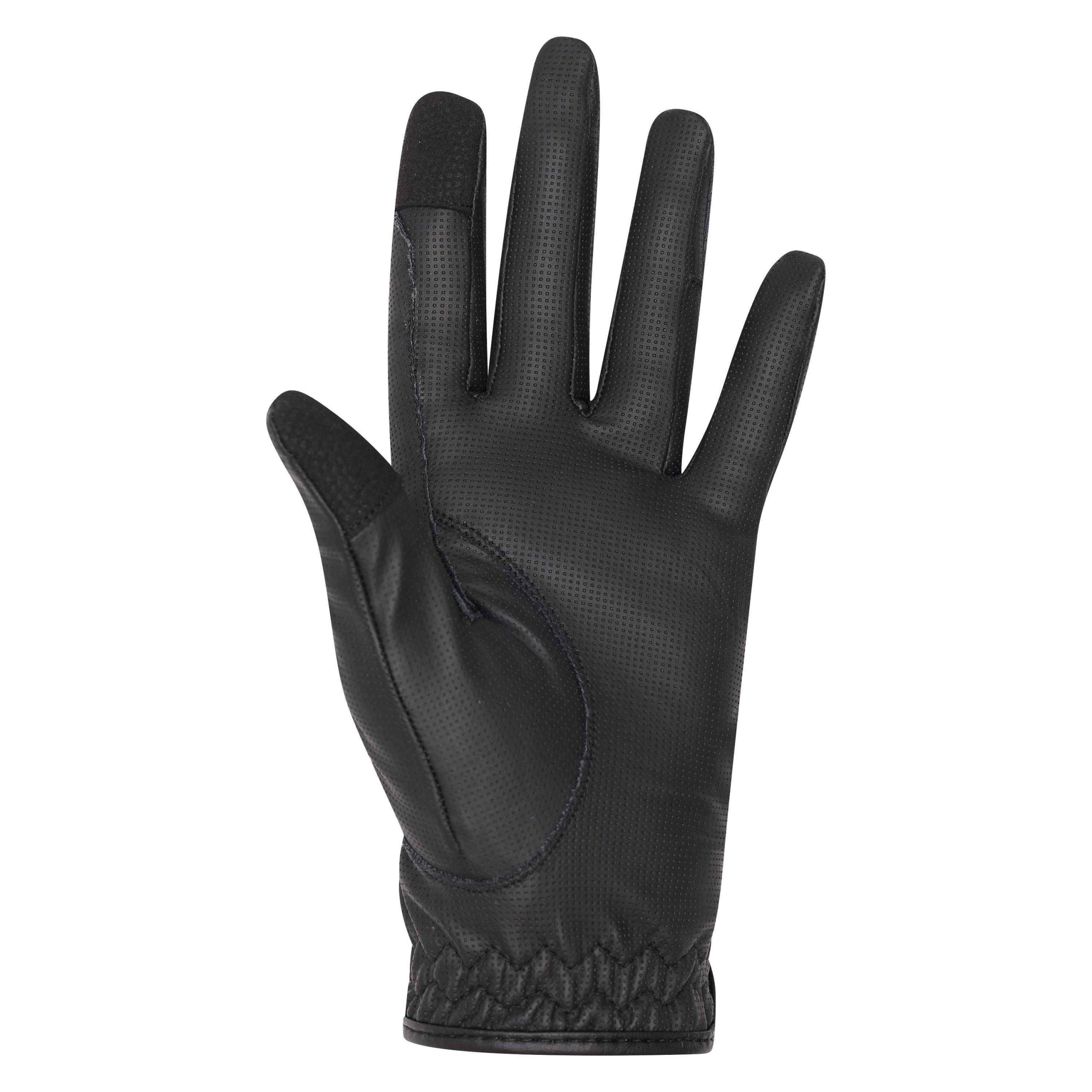 Gants d’équitation au design sportif Petites aérations Tissu Serino avec petits trous pour l’aération Fonction tactile pour le téléphone Détail élastique sur le dessus de la main Poignet avec fermeture élastique et velcro pour un bon maintien et ajustement Mors sur la fermeture velcro
