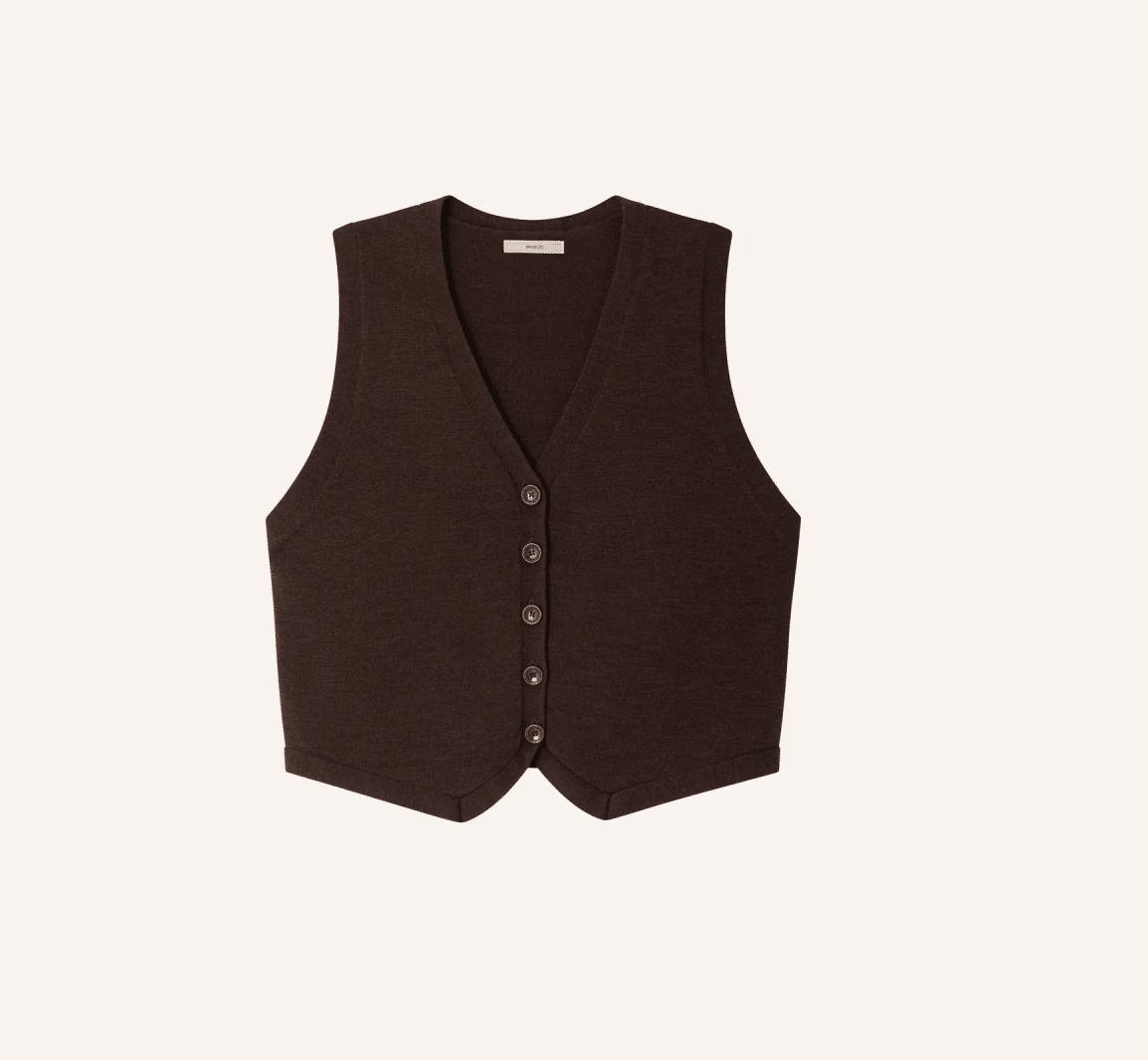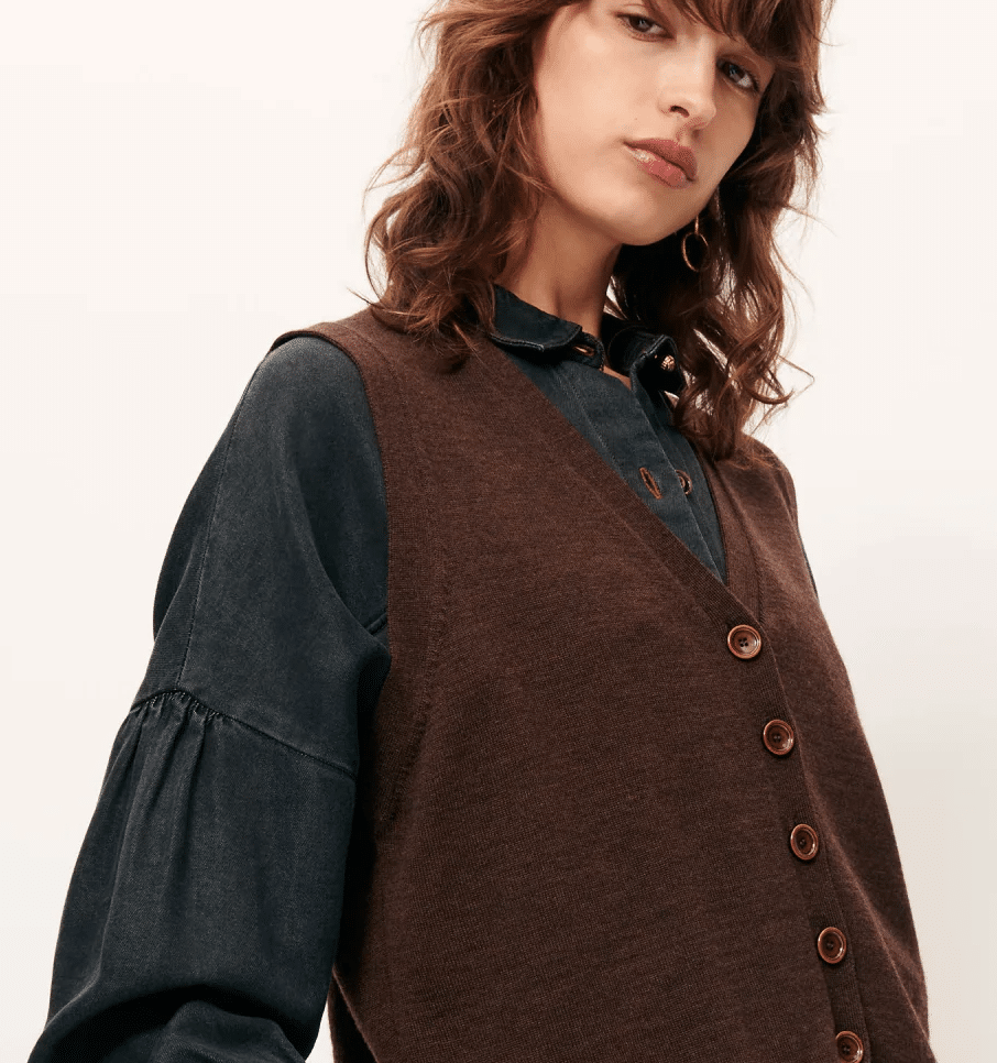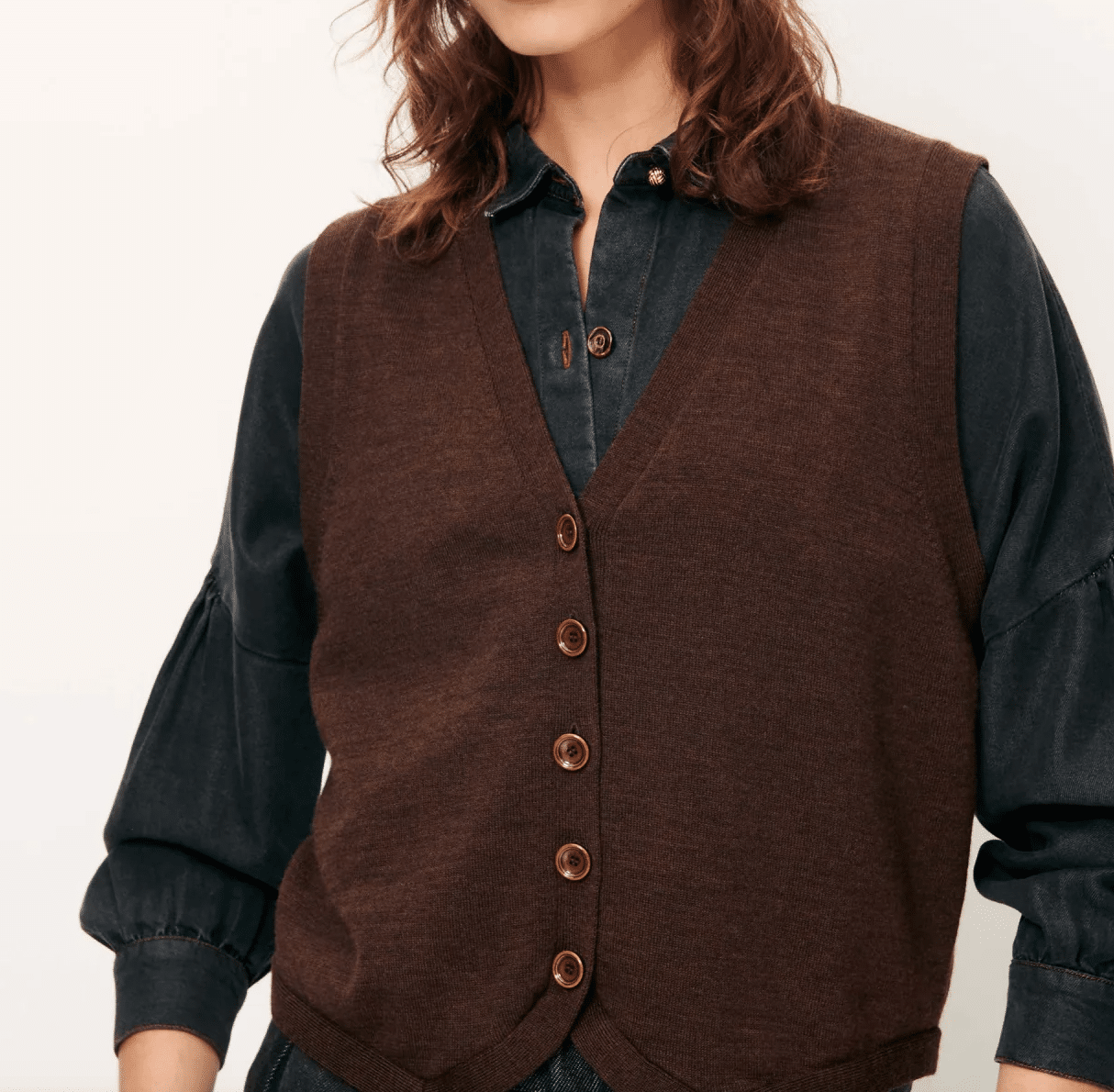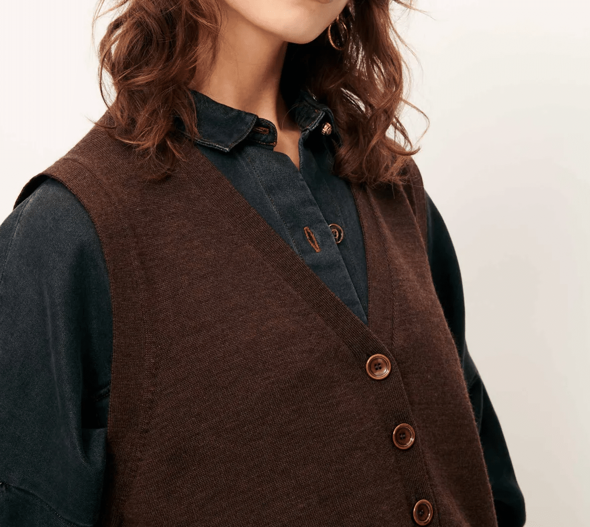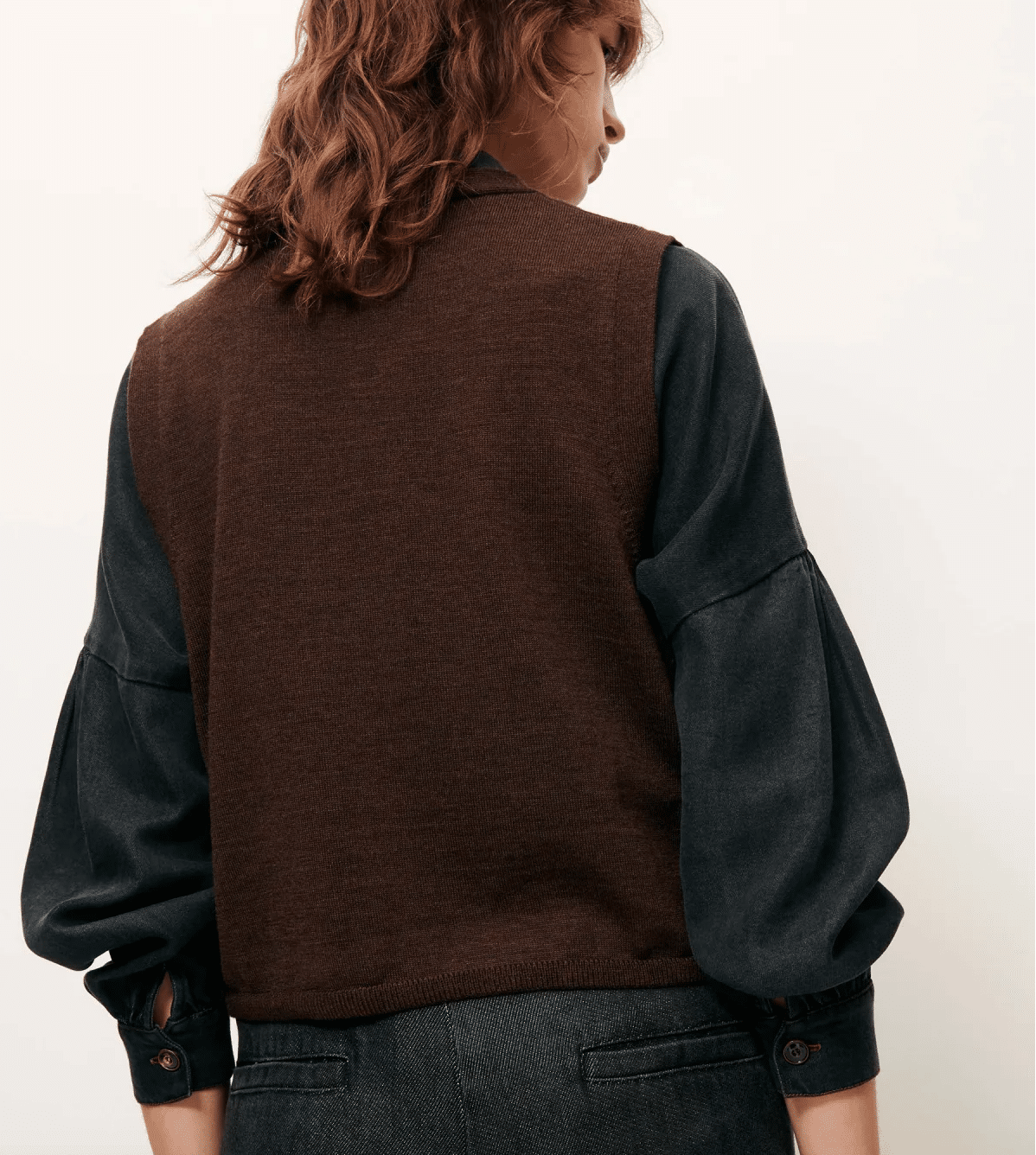 Gilet sans manches en maille fine jauge mérinos, point jersey.