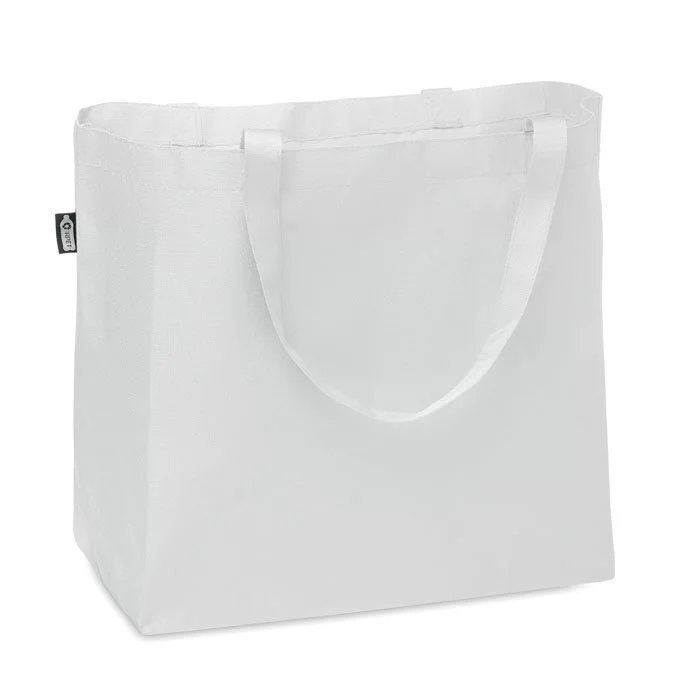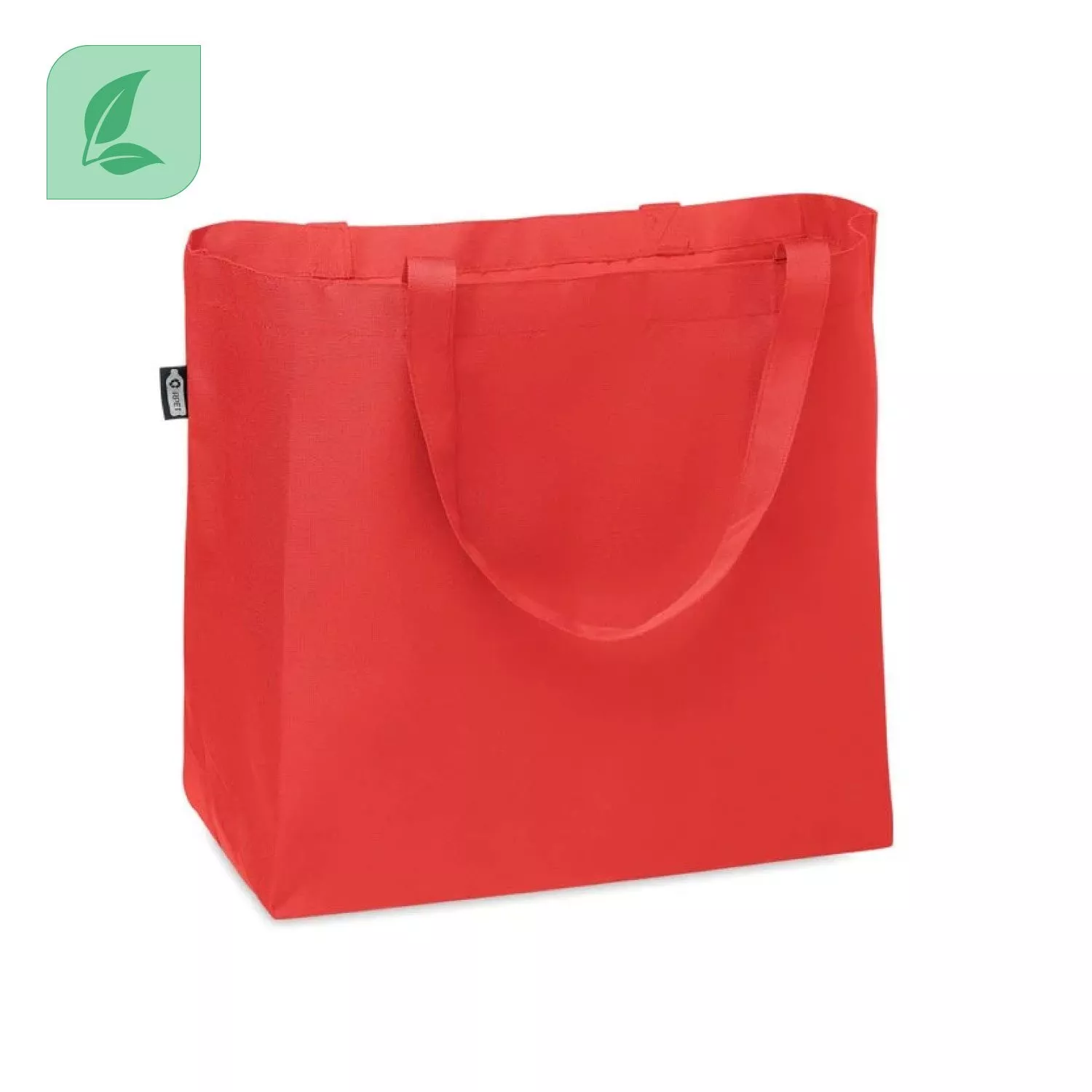 Grand sac shopping en RPET 600D avec anses longues et soufflet sur le fond.