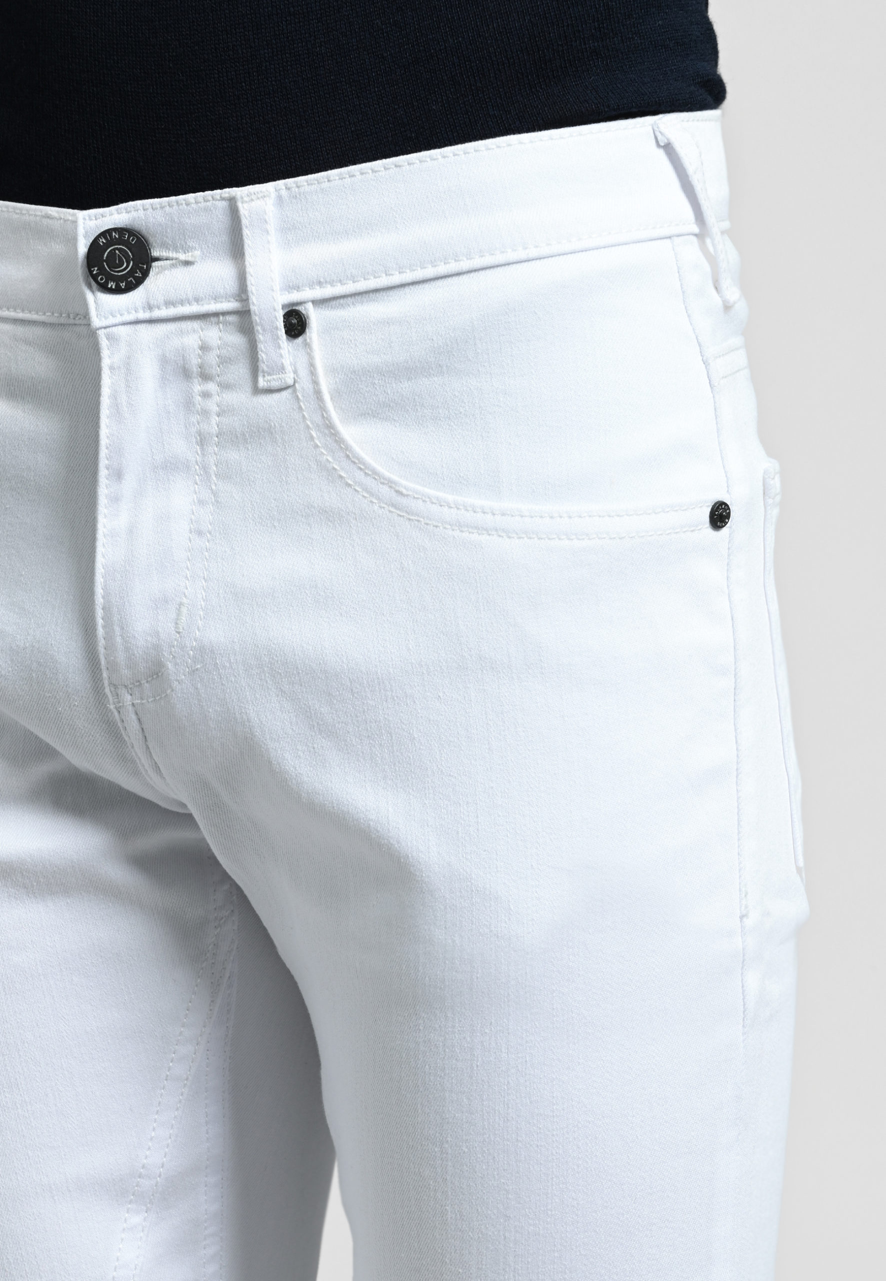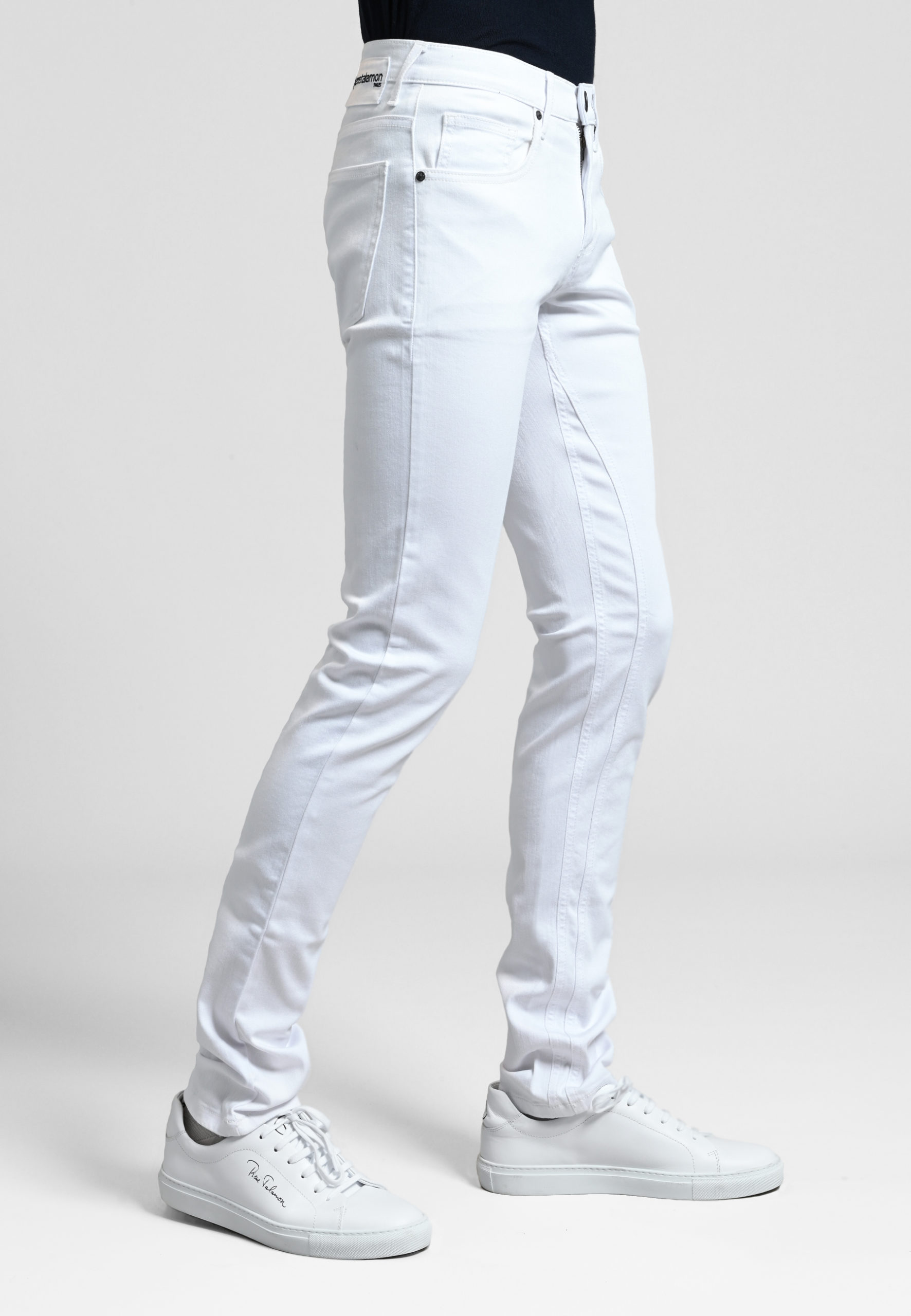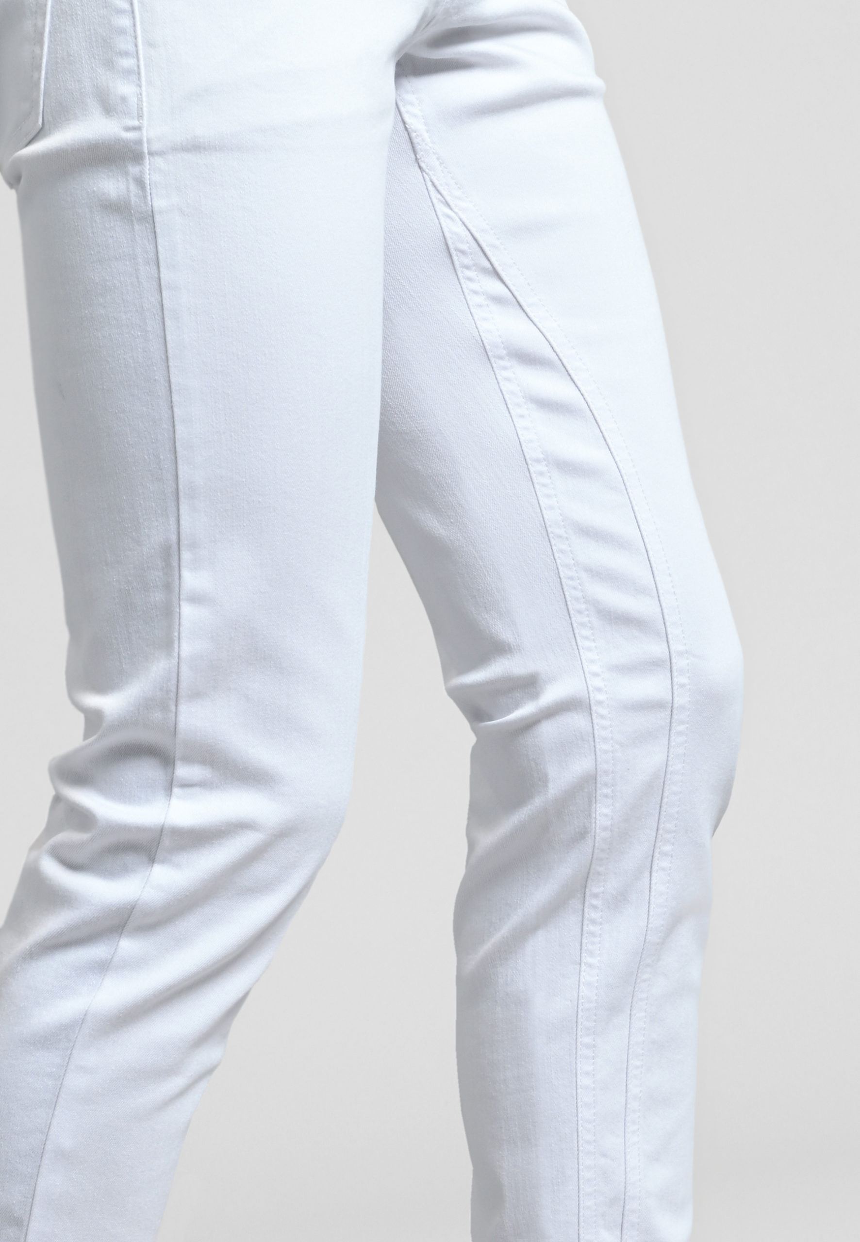 Pantalon jeans, denim blanc, slim fit, cinq poches, surpiqures contrastées sur intérieur jambes et poches dos 97% Coton 3% Elasthane Lavage machine 40°