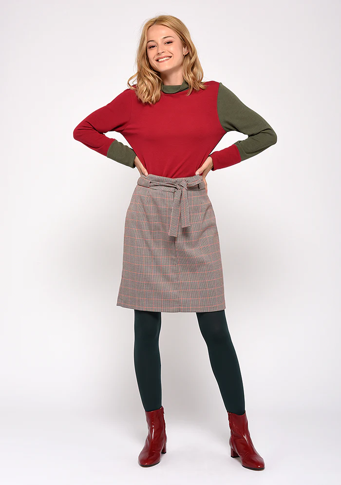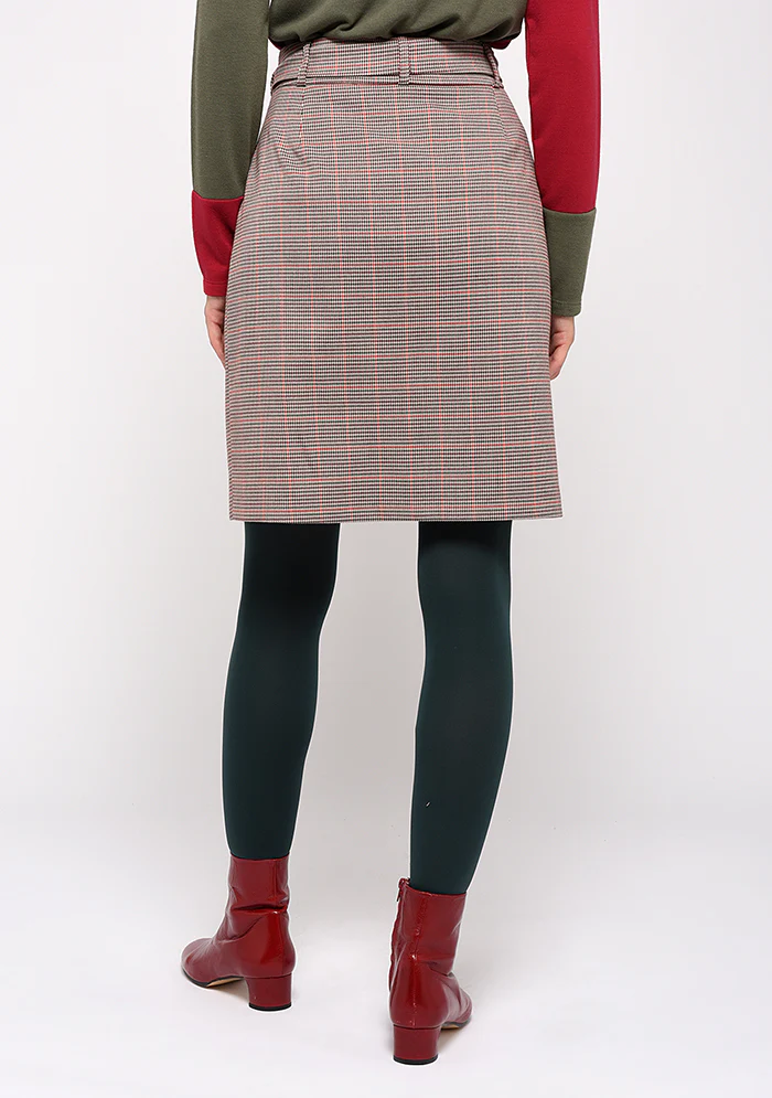 Jupe droite carreau, très scotish. Comment la porter : En montrant la taille, avec un top rentré à l’intérieur ou notre cholo blousant. Casser le classique du carreaux en osant nos imprimés assortis. Type de fermeture: Zip et ceinture Quelle coupe? Droite Poches: Sans Composition : 65% Polyesther 33% viscose 2% élasthanne Entretien : Fabriquée en France
