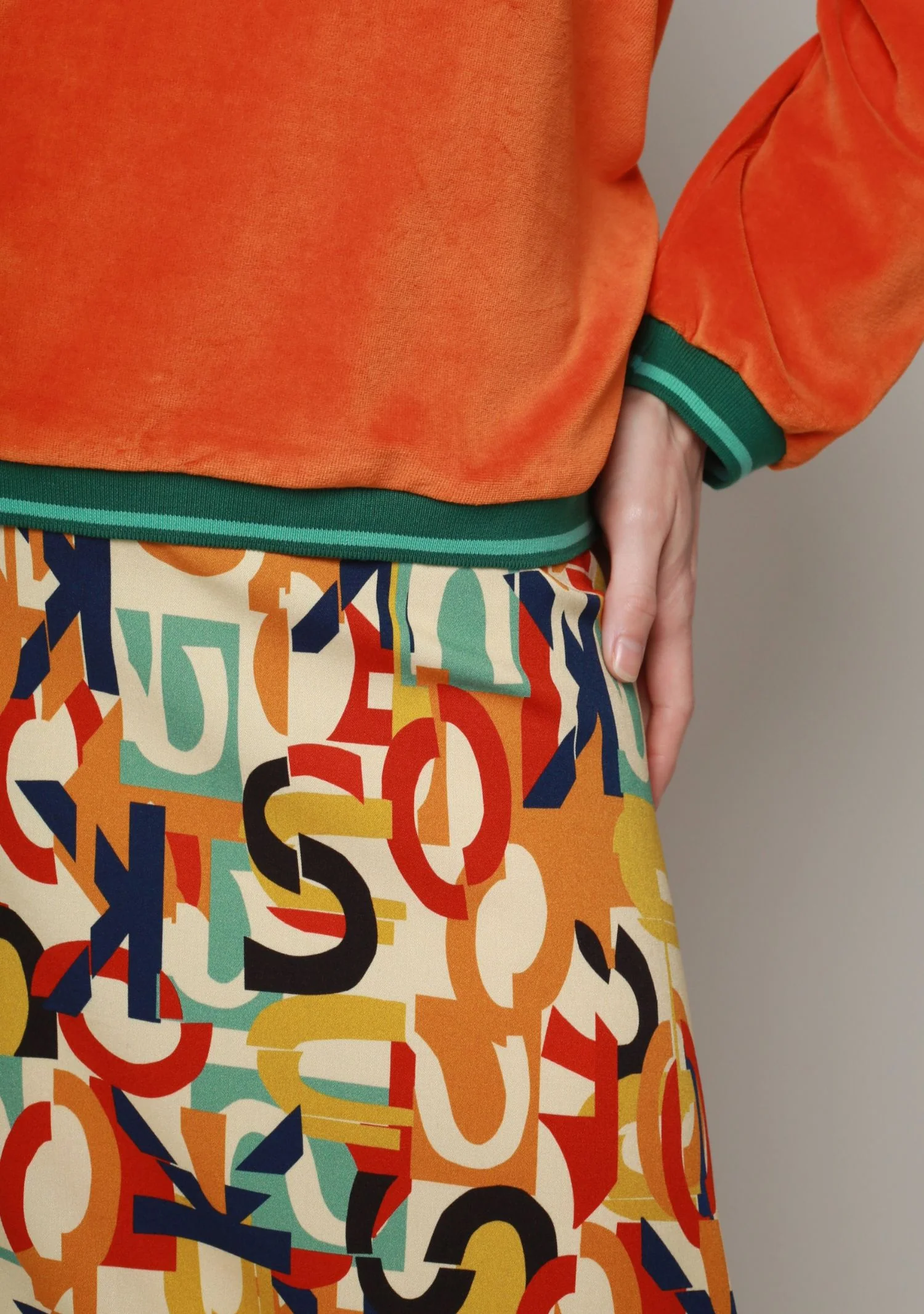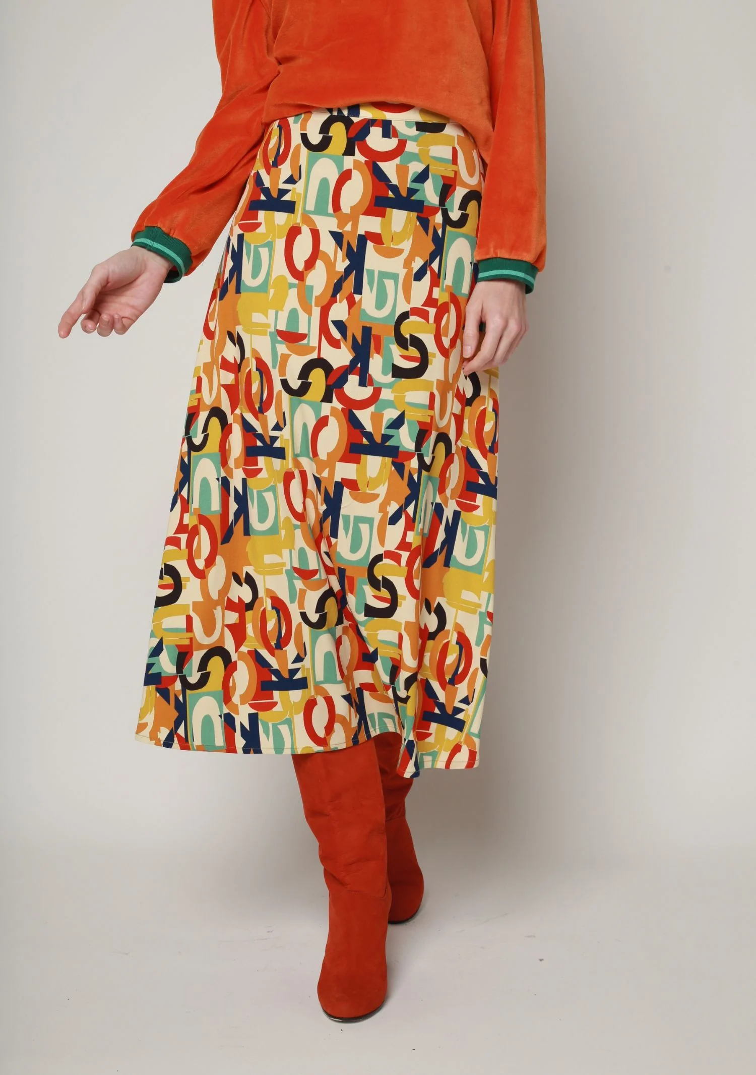 INFOS ARTISTE ET MOTIF : La Jupe Jinol Alphabet Écru est une jupe trapèze longue, conçue dans un tissu stretch pour un confort optimal. Son motif, signé Design Union, joue avec des lettres en géométrie et en couleurs, où le rose, le lilas et le vert céladon s’associent harmonieusement à des tons plus sombres de verts et bruns. Ce motif intrigant cache-t-il un message dans ce chaos alphabétique ? Quoi qu’il en soit, il se transforme en aplats de couleurs audacieux à grande échelle pour un look unique et moderne.