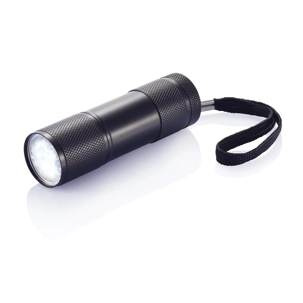 Lampe de poche personnalisable en aluminium possédant 9 LED blanches puissantes. Dimensions: L9cm x D2,6cm Réf: 242A03705