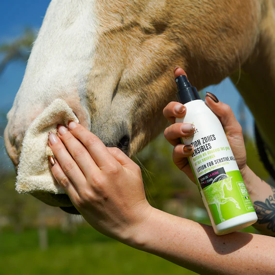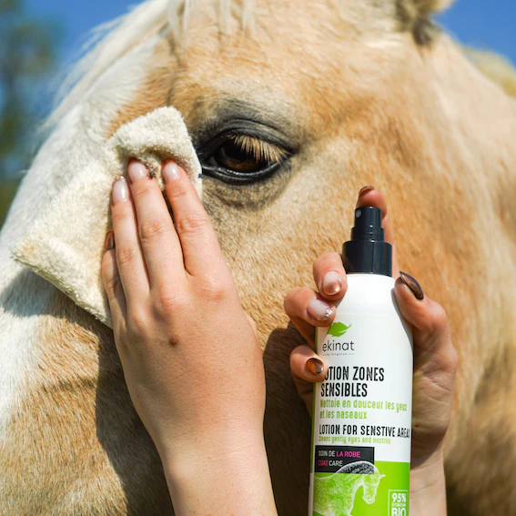 La lotion Ekinat spéciale zones sensibles pour chevaux est formulée à base d’eau de rose et bleuet.
