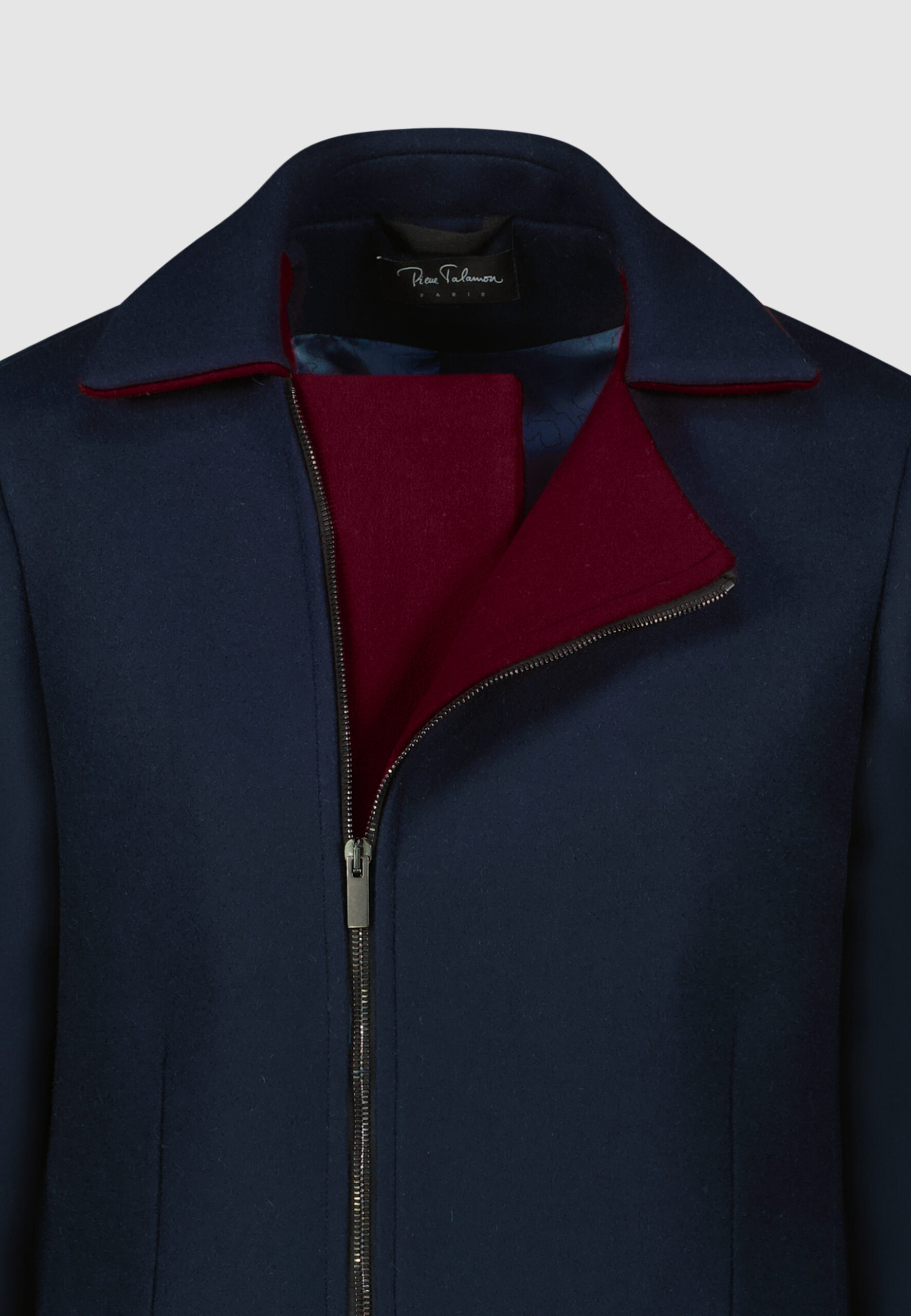 Manteau asymétrique en laine bleu marine • Coupe droite • Dessous de col et sous-patte en contraste bordeaux • Fermeture asymétrique à zip • Deux poches passepoilées • Deux poches intérieures Composition et entretien : • 100% laine • Doublure viscose • Nettoyage à sec