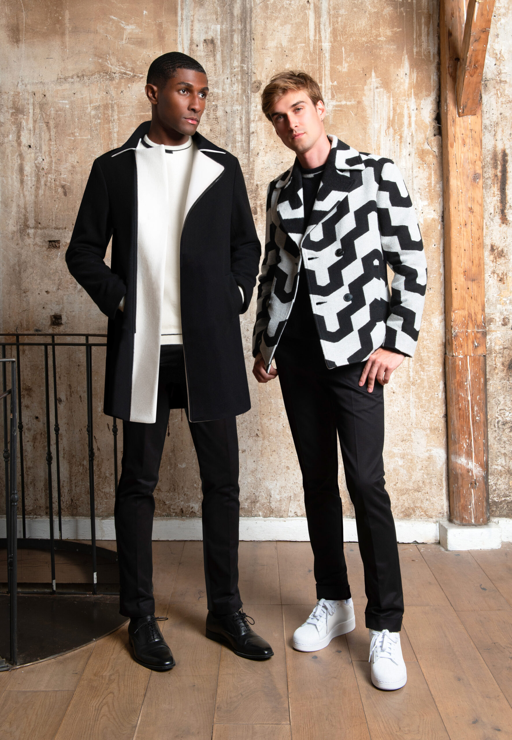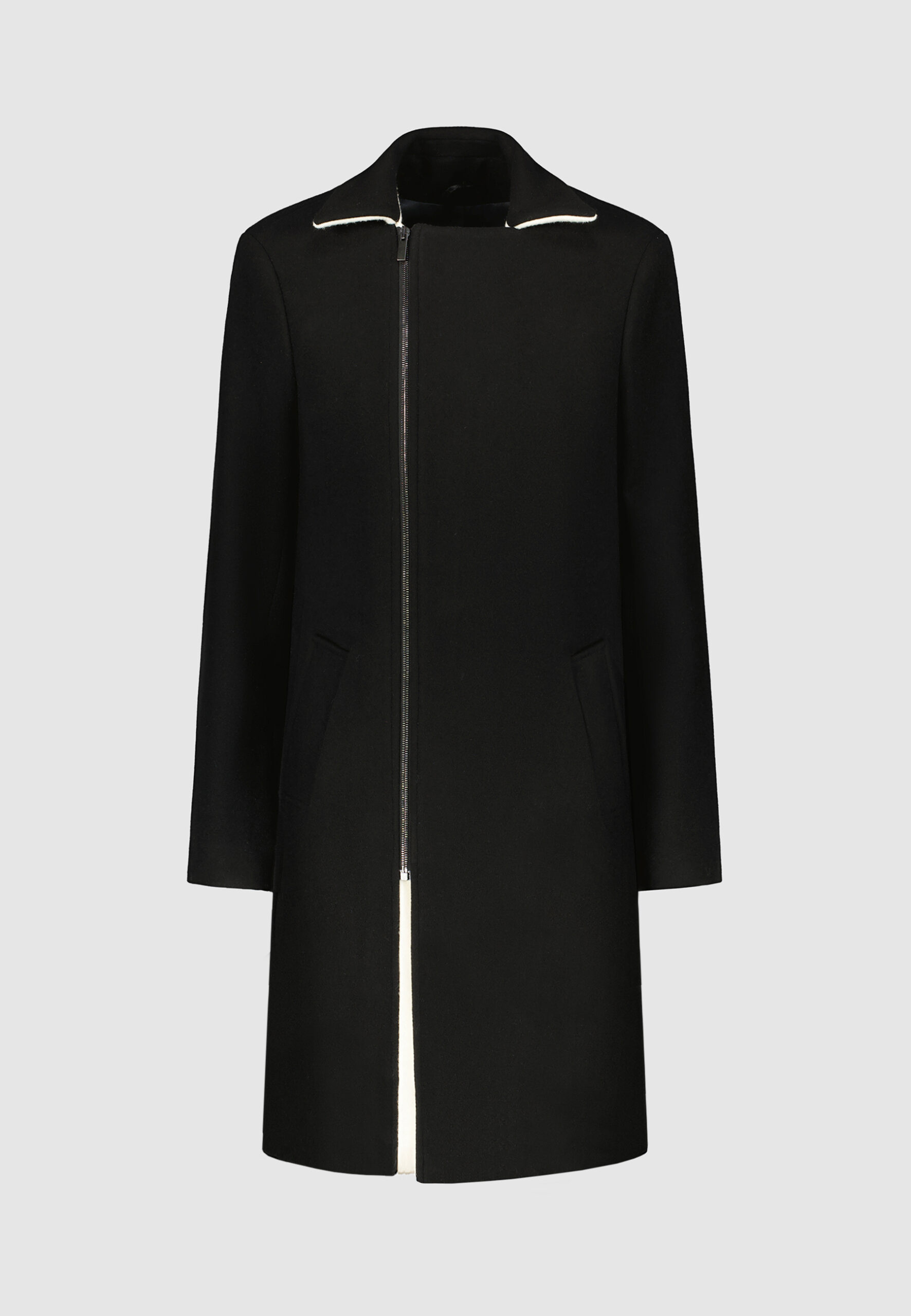 Manteau asymétrique en laine noir • Coupe droite • Dessous de col et sous-patte en contraste blanc • Fermeture asymétrique à zip • Deux poches passepoilées • Deux poches intérieures Composition et entretien : • 100% Laine Vierge • Doublure viscose • Nettoyage à sec
