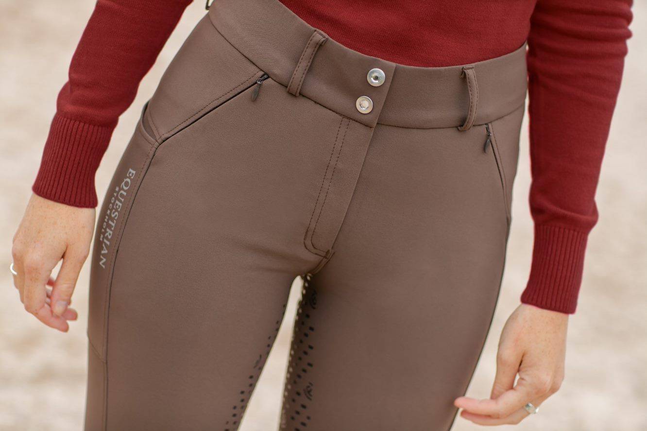 Pantalon d’équitation marron avec full grip et taille moyennement haute.