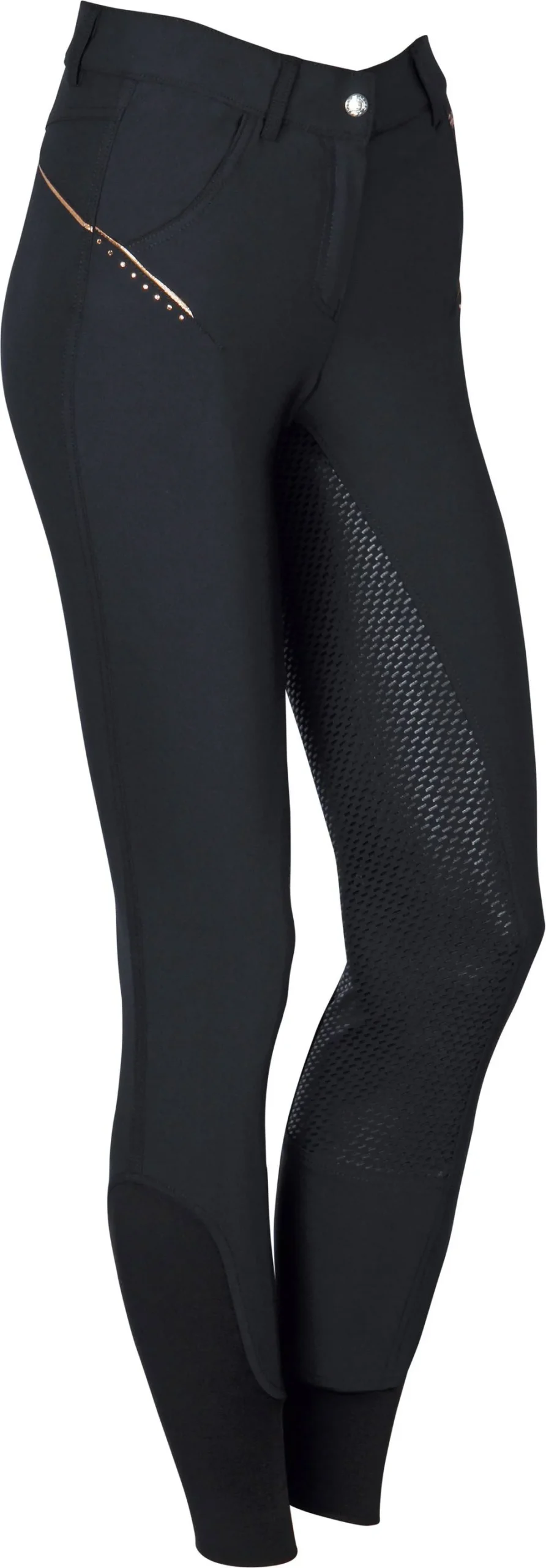 Pantalon d’équitation avec deux poches latérales, passepoil métallique à l’avant et à l’arrière, avec des cristaux et un joli badge sur la ceinture, siège à coutures rondes avec un imprimé en silicone pour une meilleure adhérence en selle et des jambes flexibles pour plus de confort dans les bottes d’équitation.