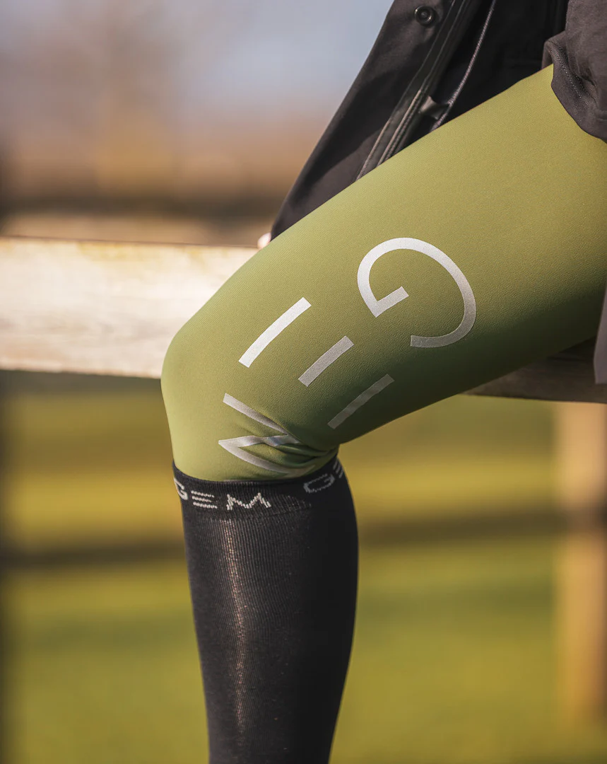Grips GEM silver à l’intérieur des genoux, E de GEM sur chaque fesse, logo sur le passant arrière de la ceinture.