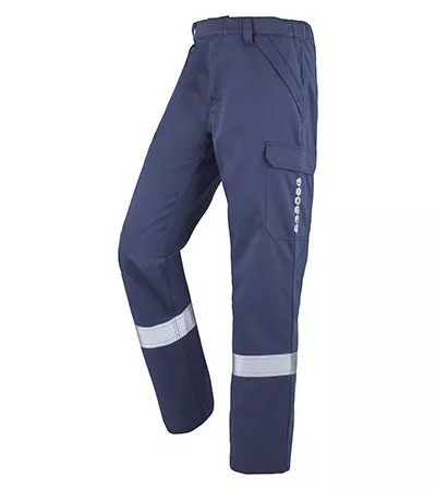 Ce pantalon multirisques bleu marine contient braguette fermée par fermeture à glissière avec son bouton clou caché à la ceinture.