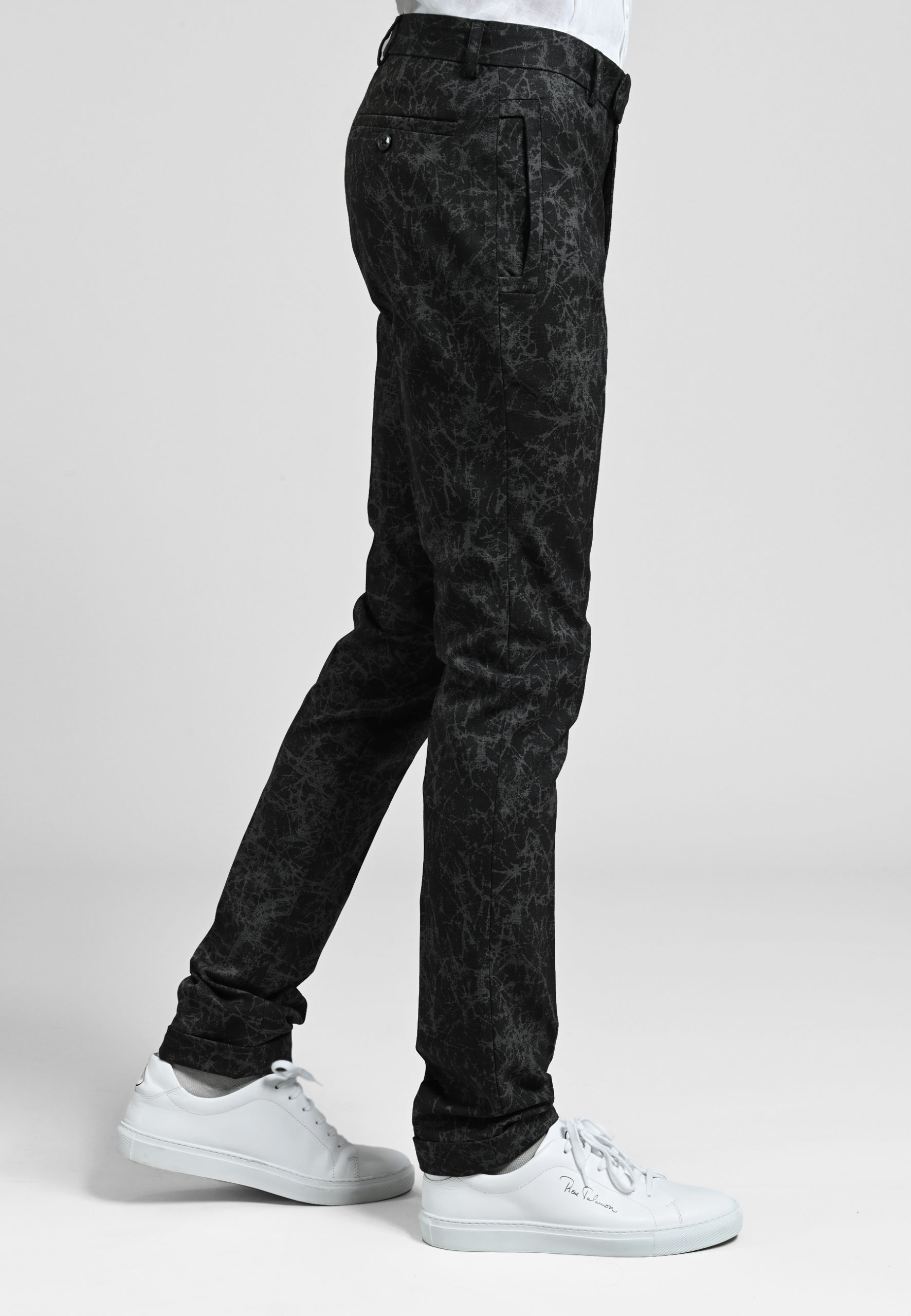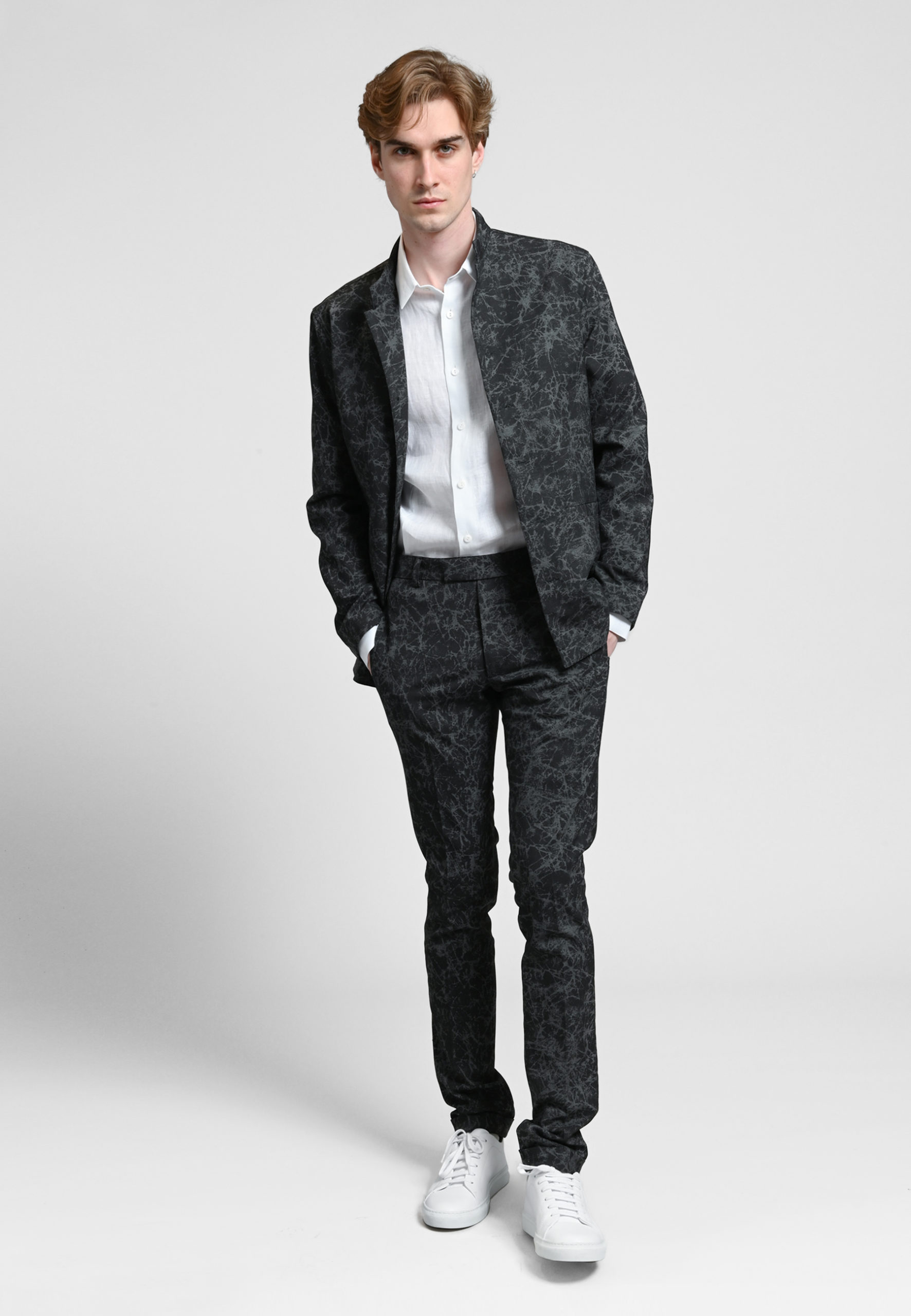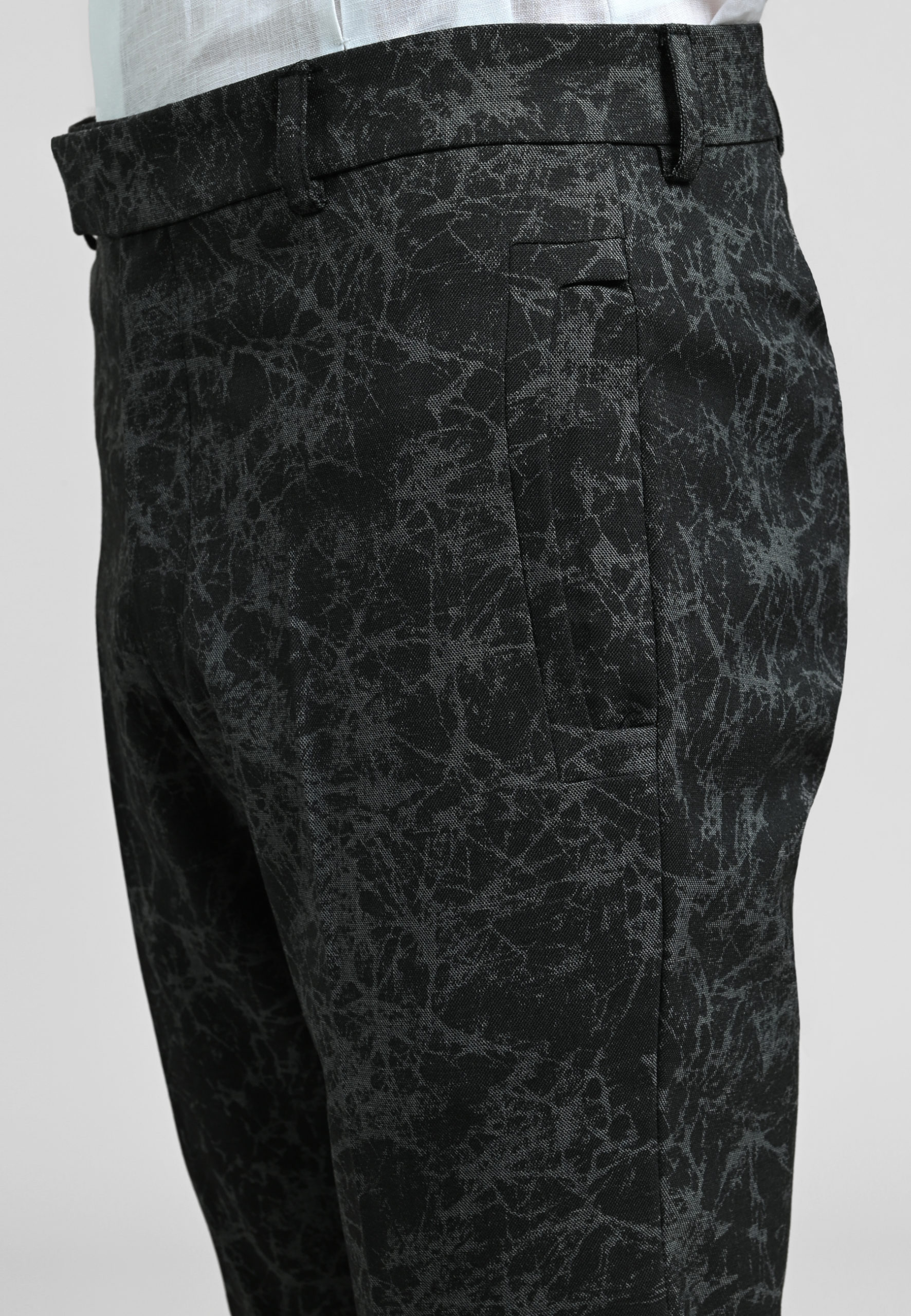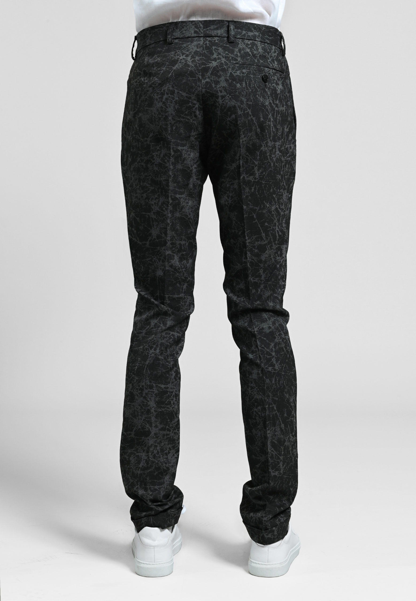 Pantalon à motif noir et gris, slim fit, poches à découpe rectangulaire, une poche dos, ourlet revers. 100% laine. Nettoyage à sec.
